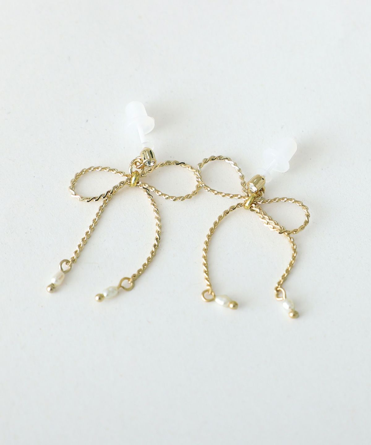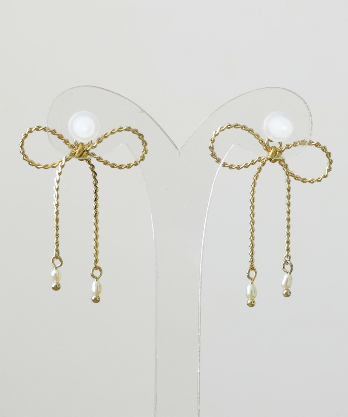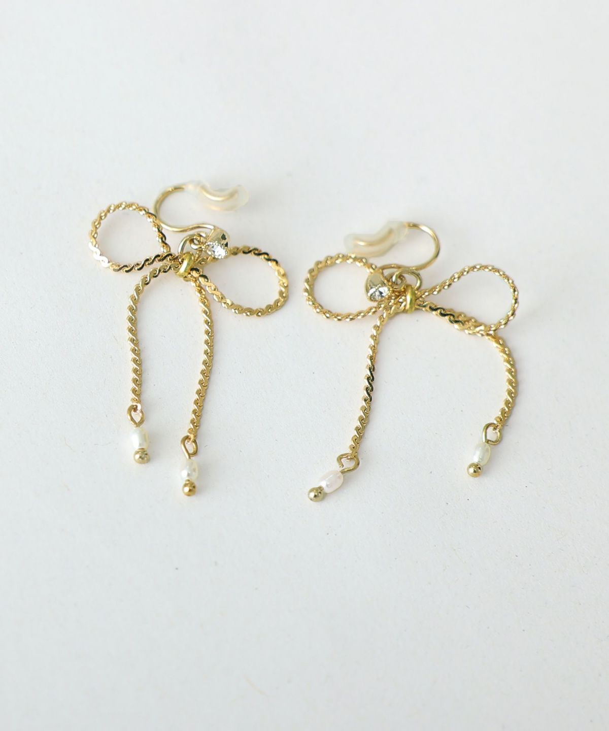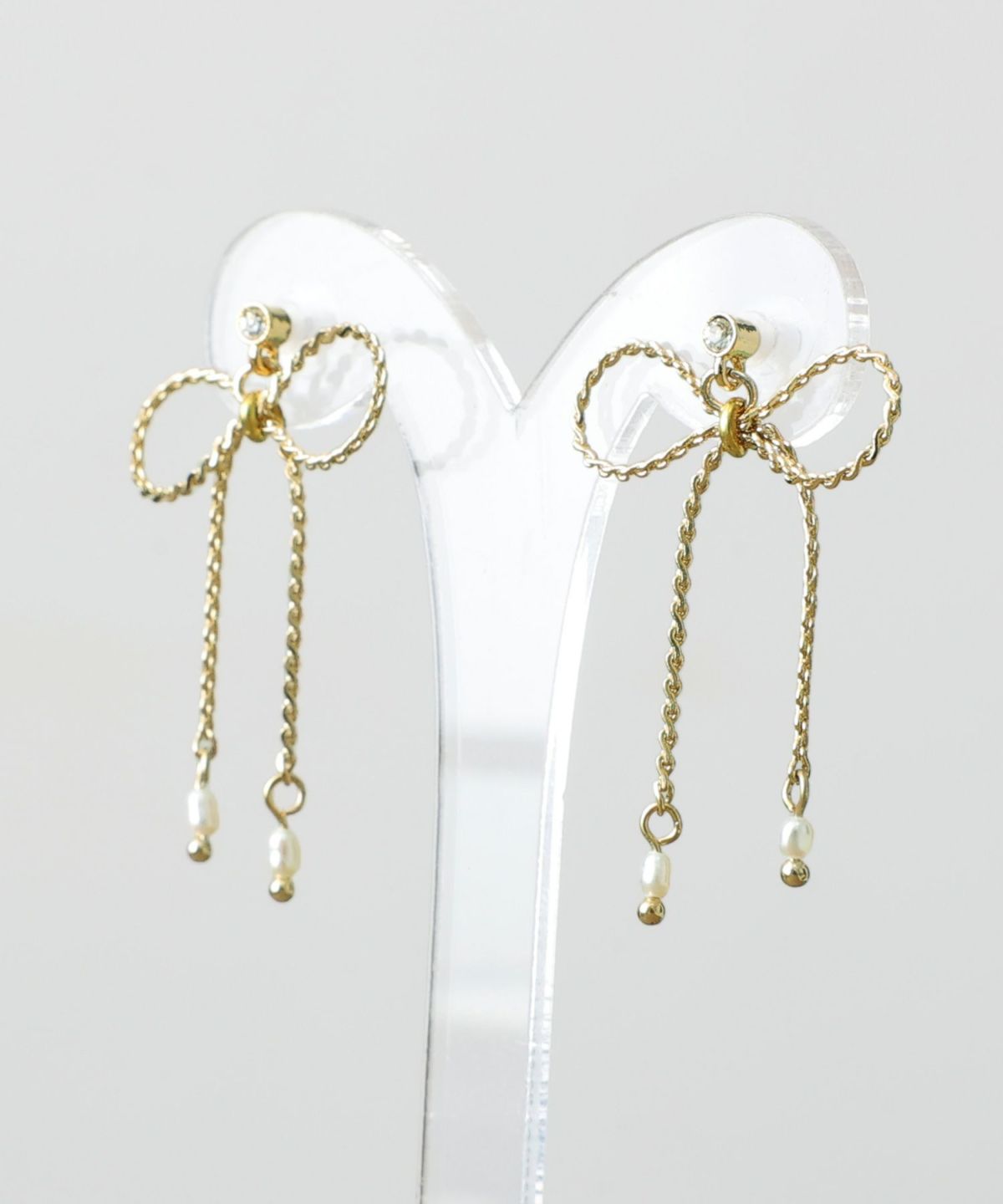 繊細なリボンデザインとパールが女性らしい パール付きリボンチェーンイヤリング&ピアス