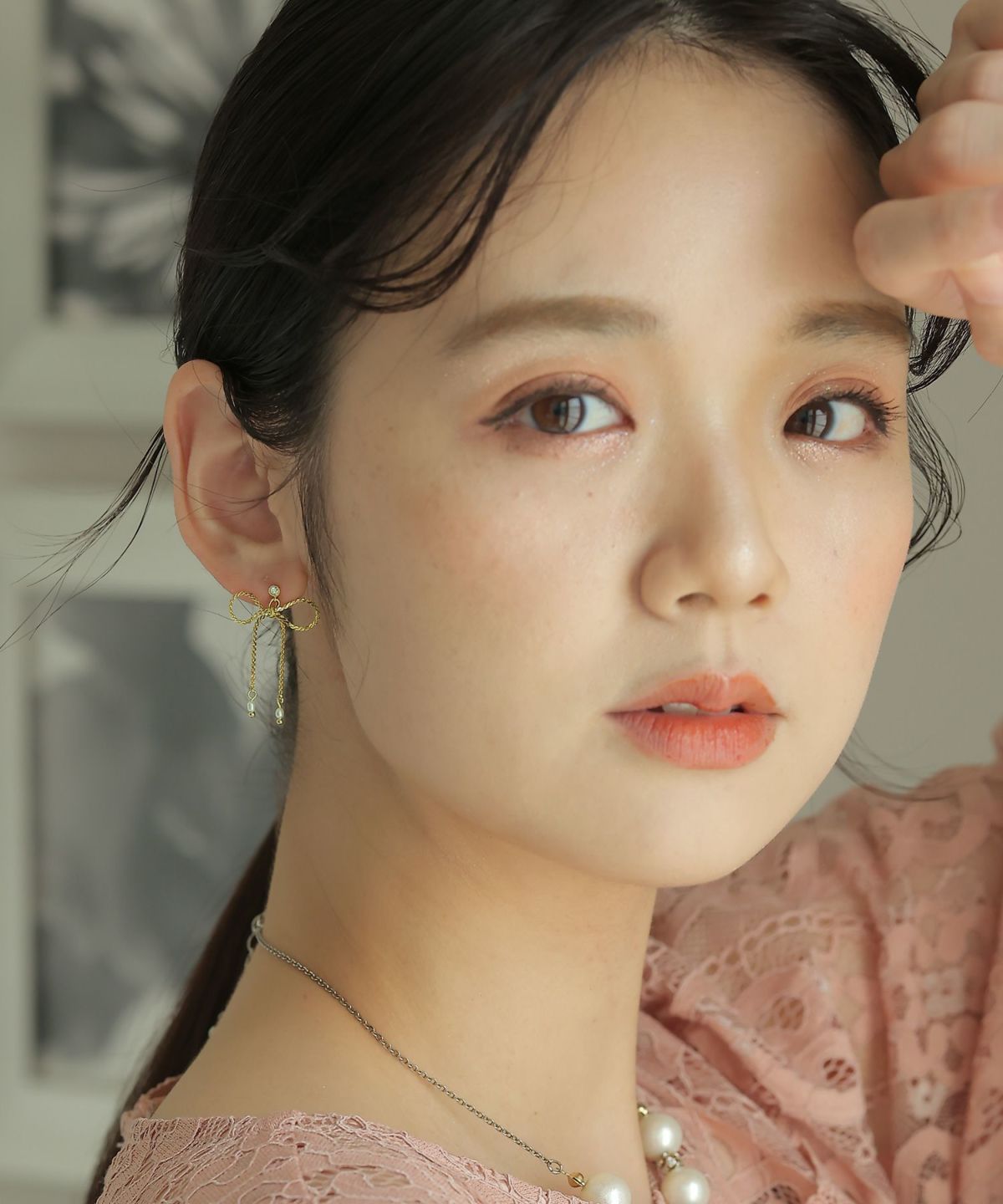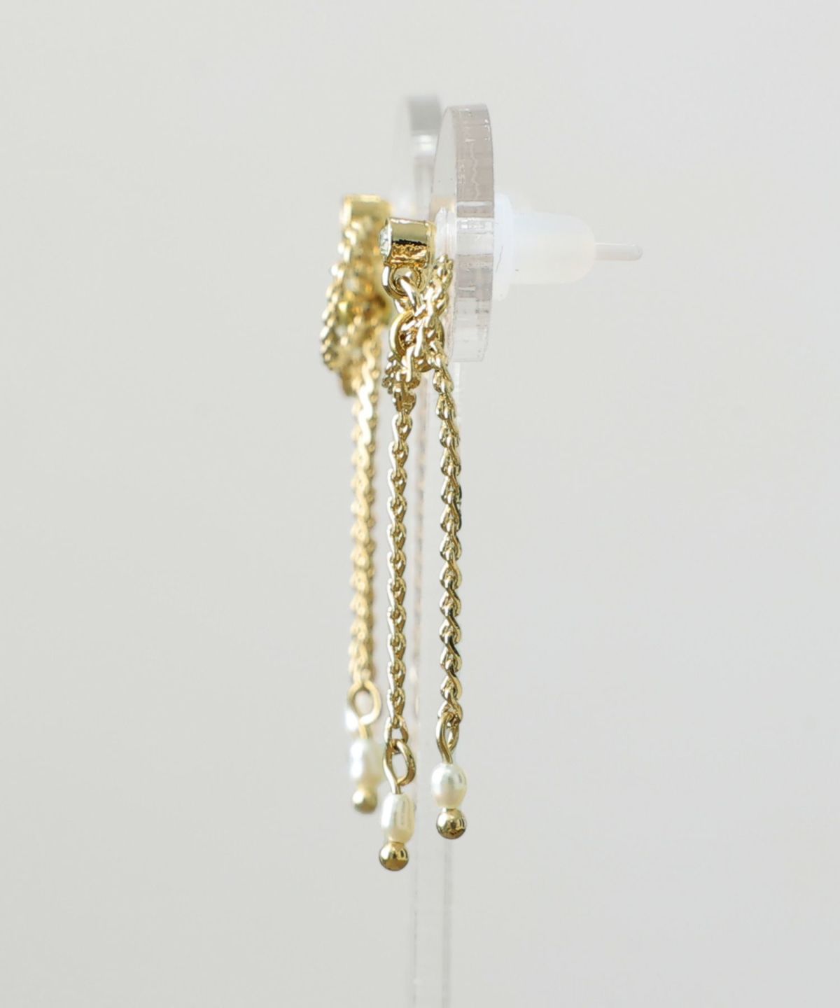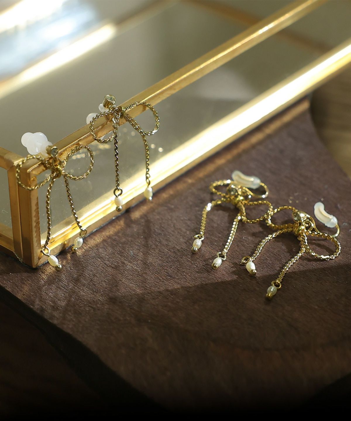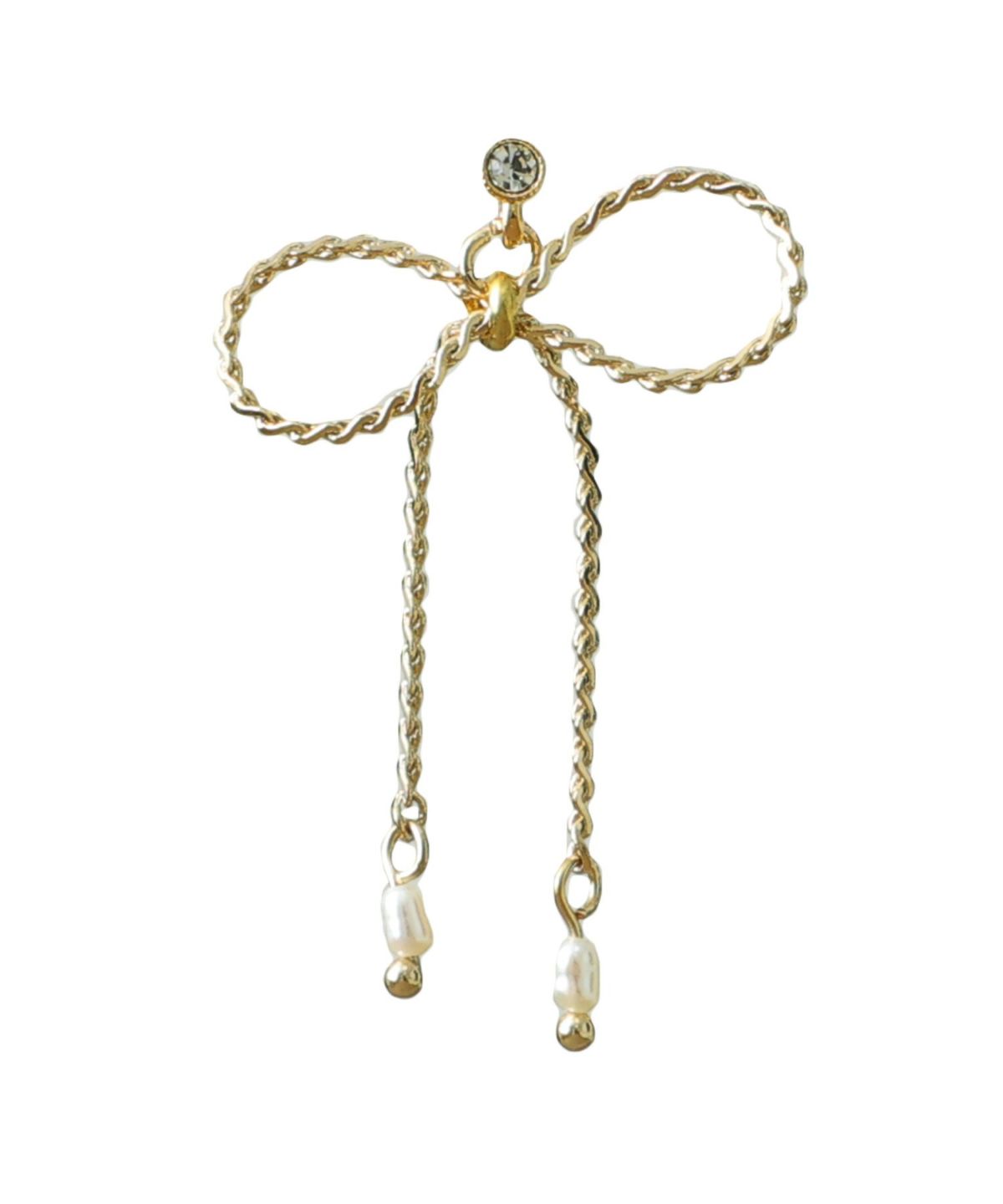 繊細なリボンデザインとパールが女性らしい パール付きリボンチェーンイヤリング&ピアス