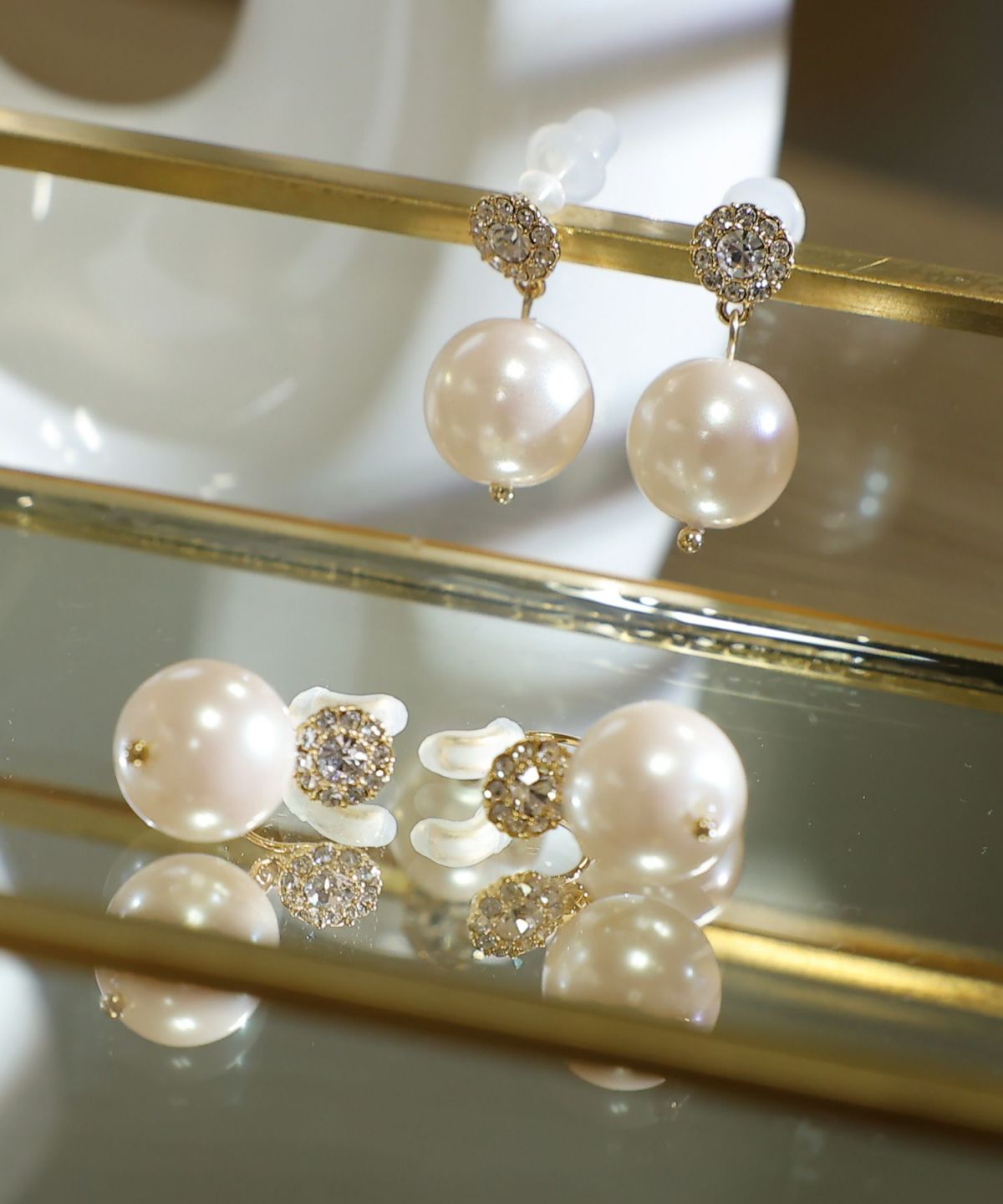 上品に輝くフラワービジューで華やかに フラワービジューパールイヤリング&ピアス
