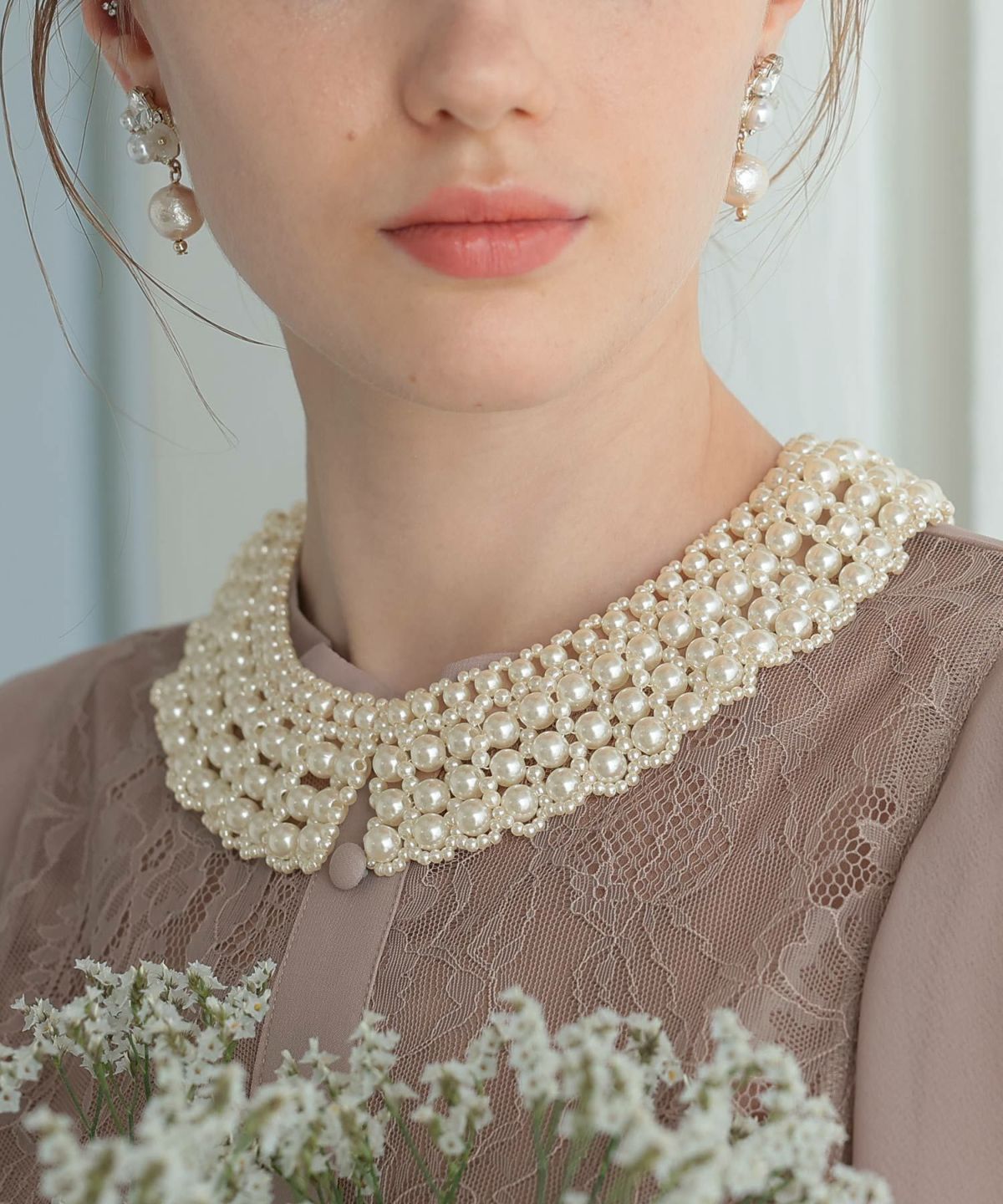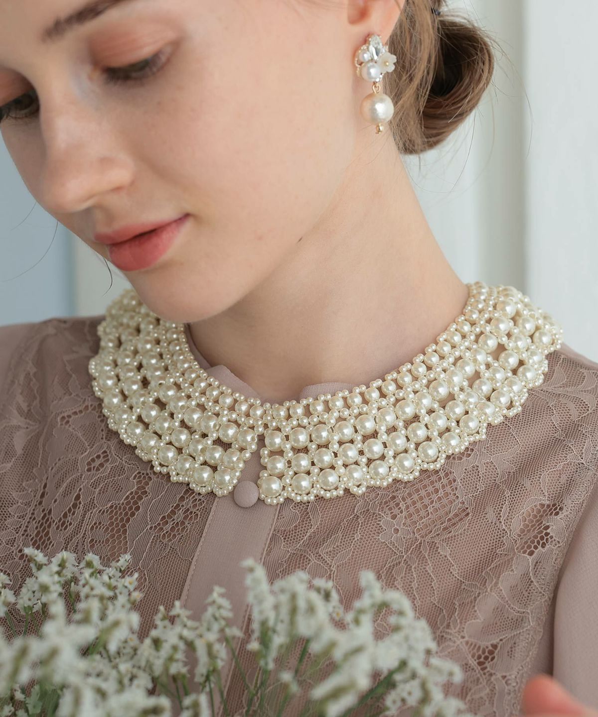 肌なじみの良い艶やかな光沢パールとつけ襟のようなデザインが、普段の服からパーティースタイルまでワンランク上の雰囲気を演出してくれます。1つ持っておくだけでコーディネートの幅が広がります。