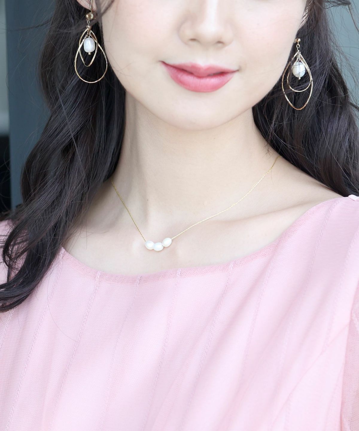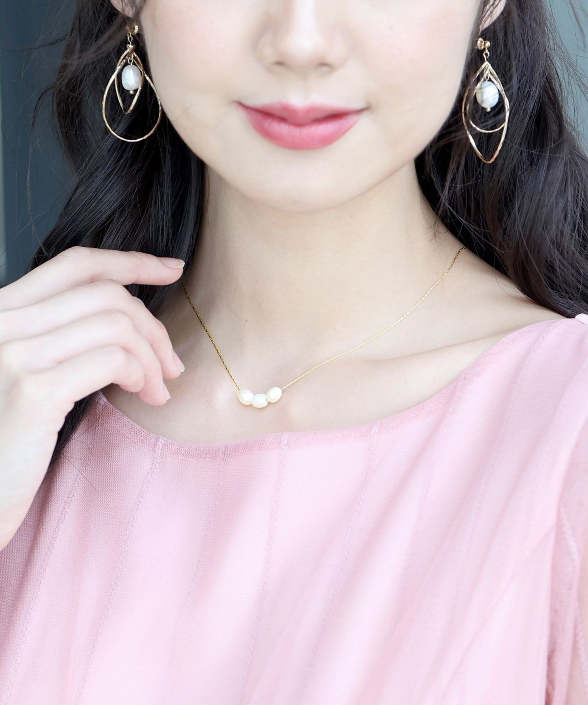 中央に並んだ3粒パールが上品にデコルテを飾り、