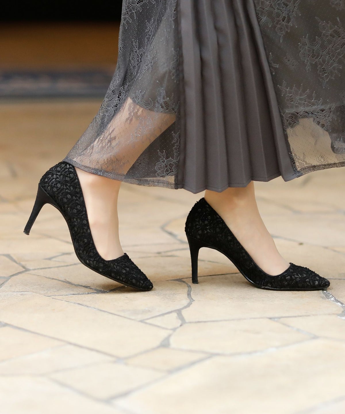 スタイリッシュな華やかパンプス スエード&レースパンプス