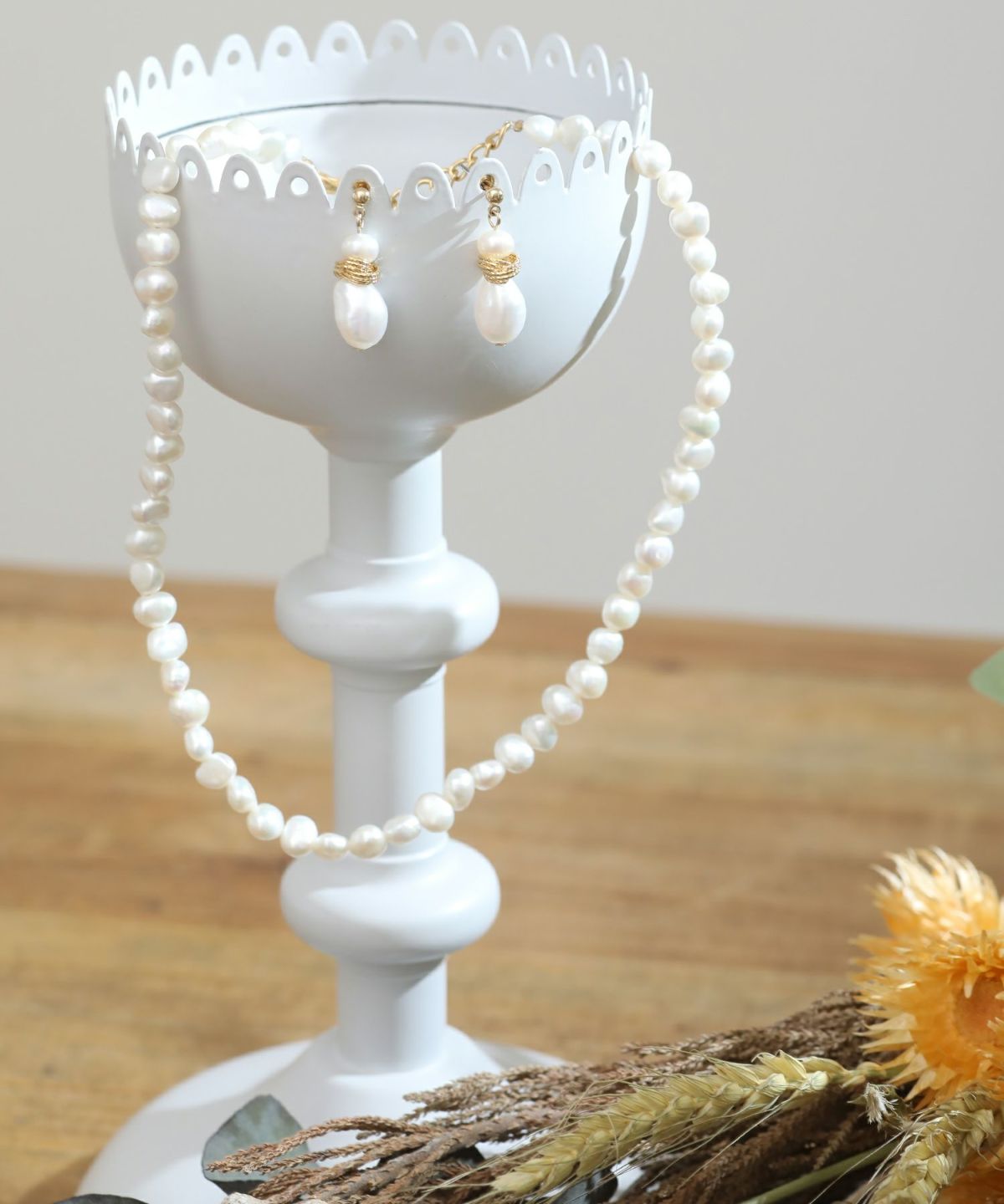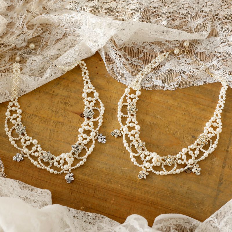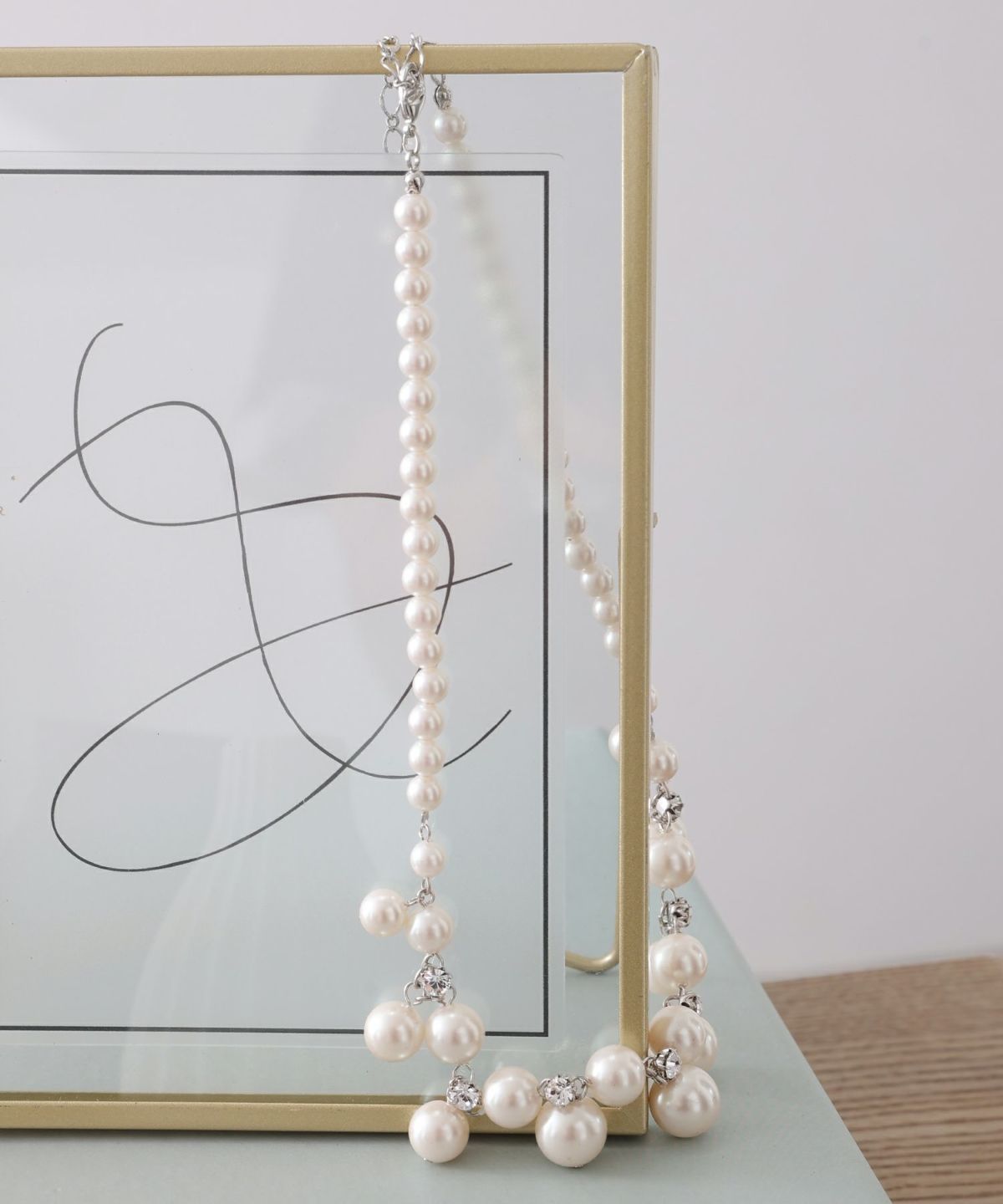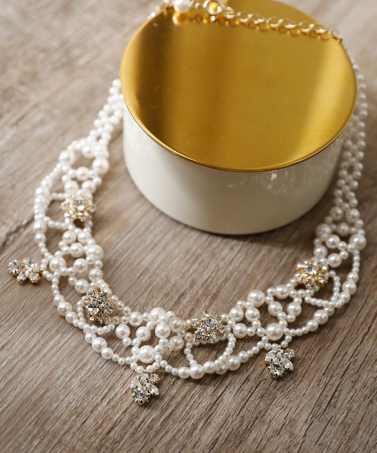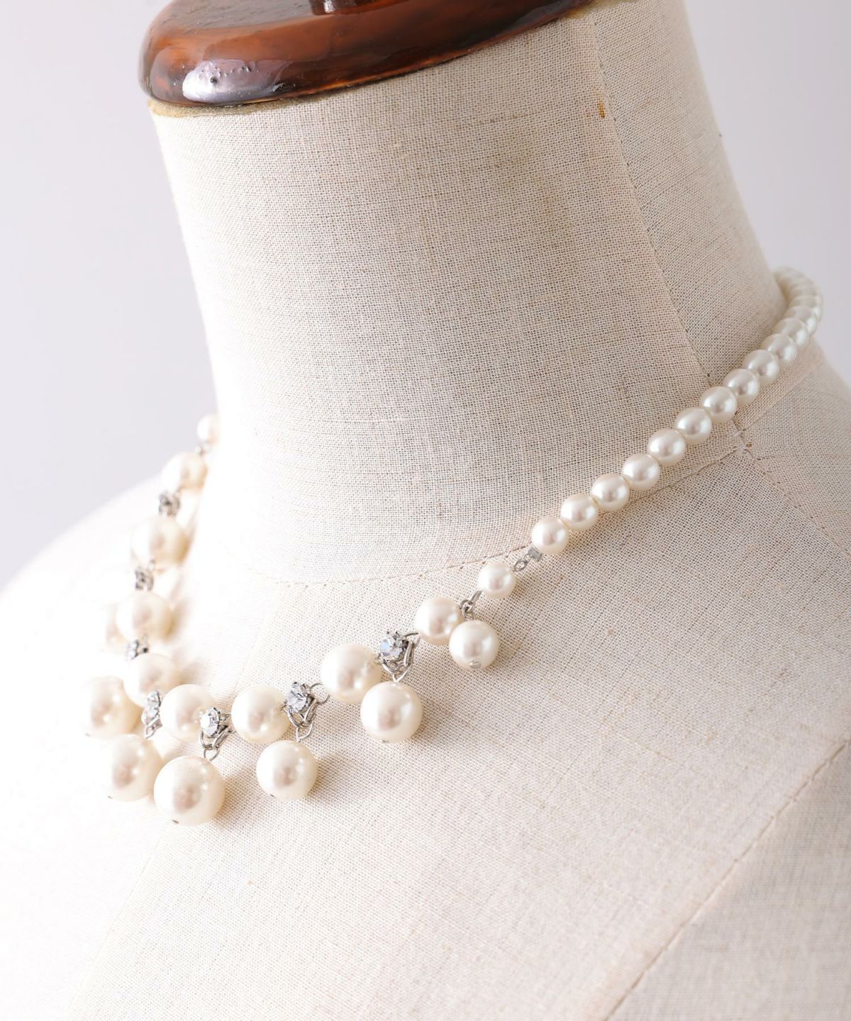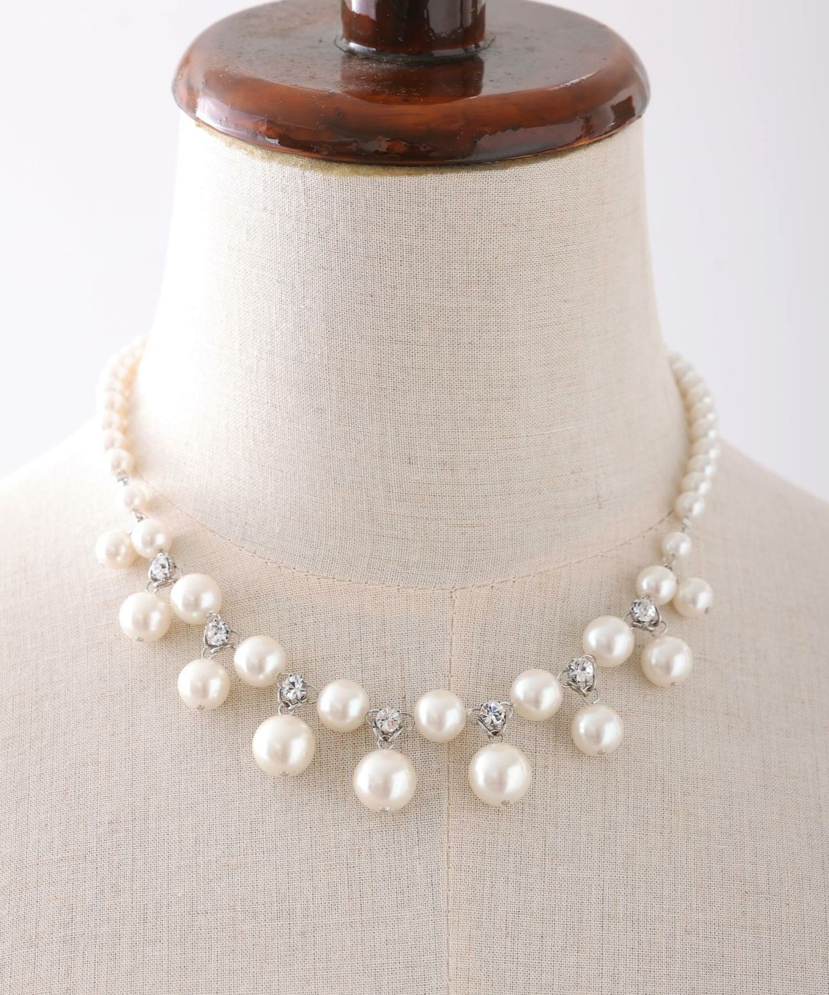ドレスのデザインに応じて、ネックラインを引き立てるネックレスを選びます。シンプルなドレスには、大ぶりのビジューやパールを使ったネックレスがよく映えます。一方で、装飾が多いドレスには控えめなジュエリーがバランスを保ちます。