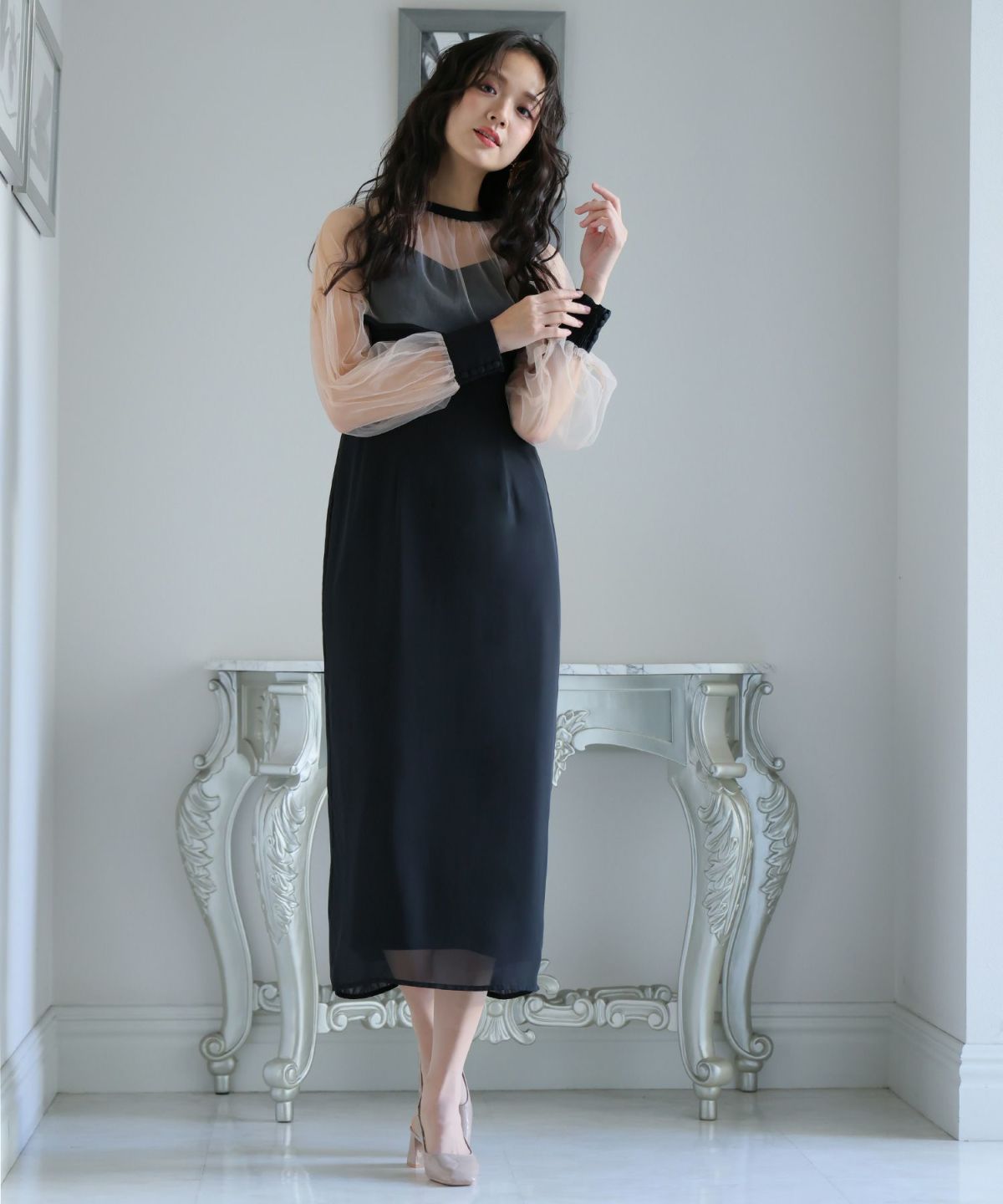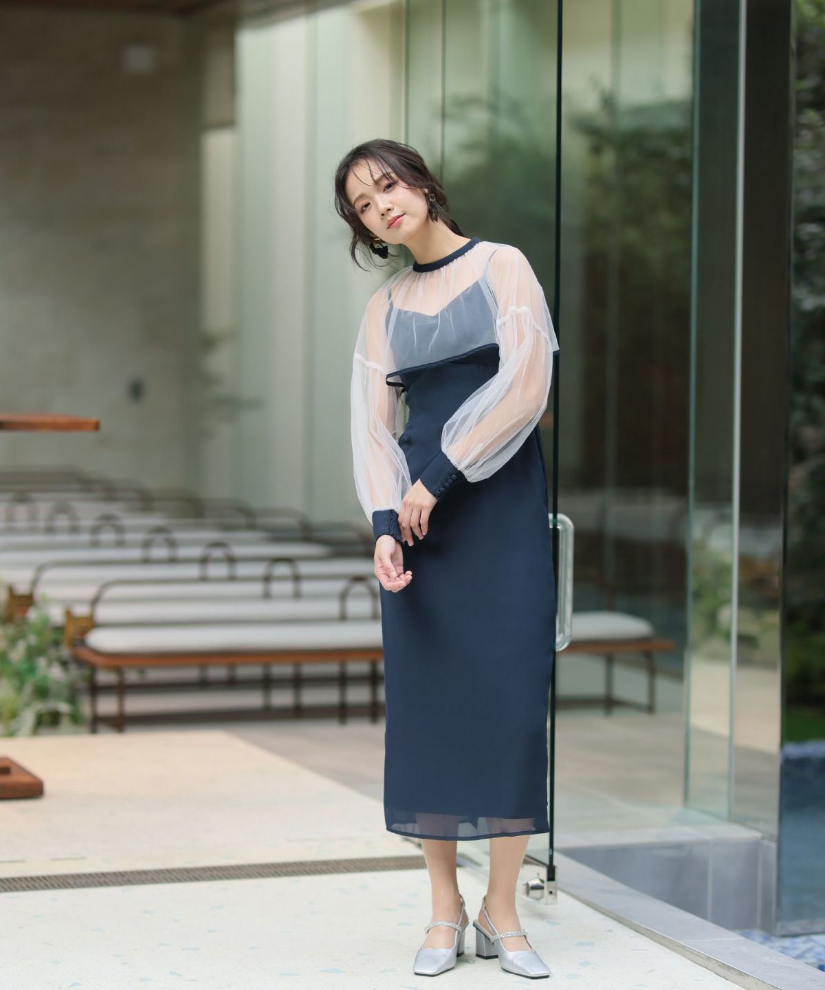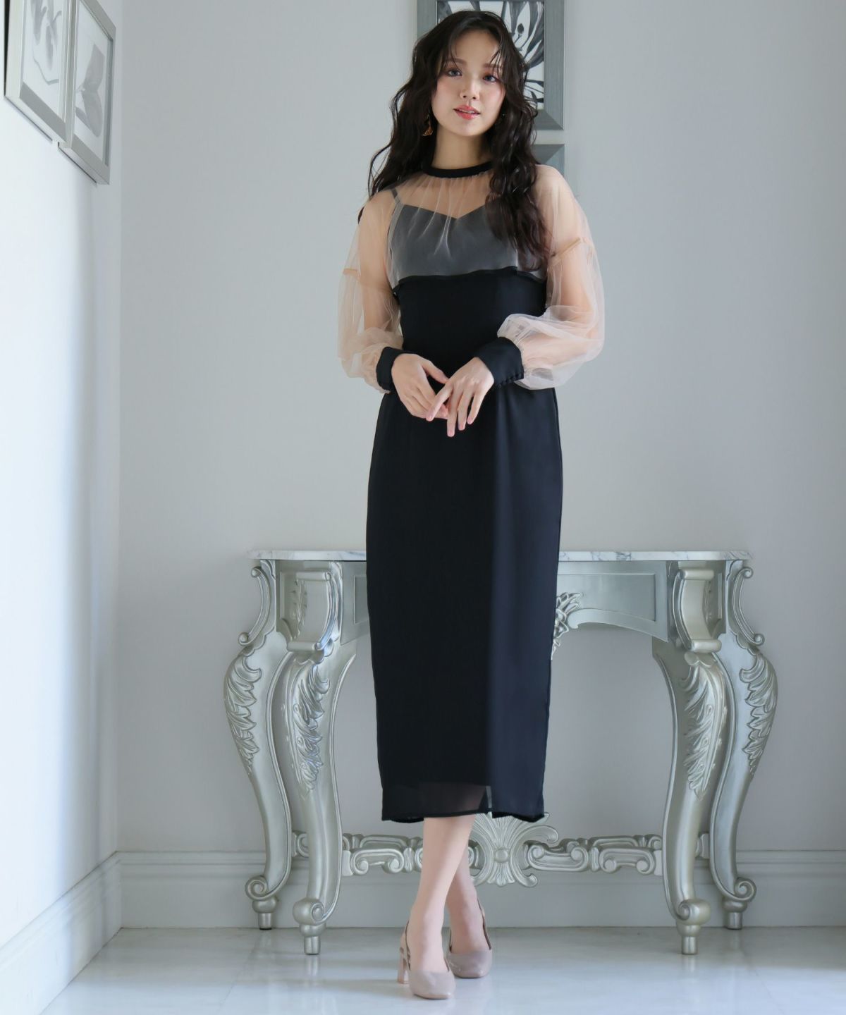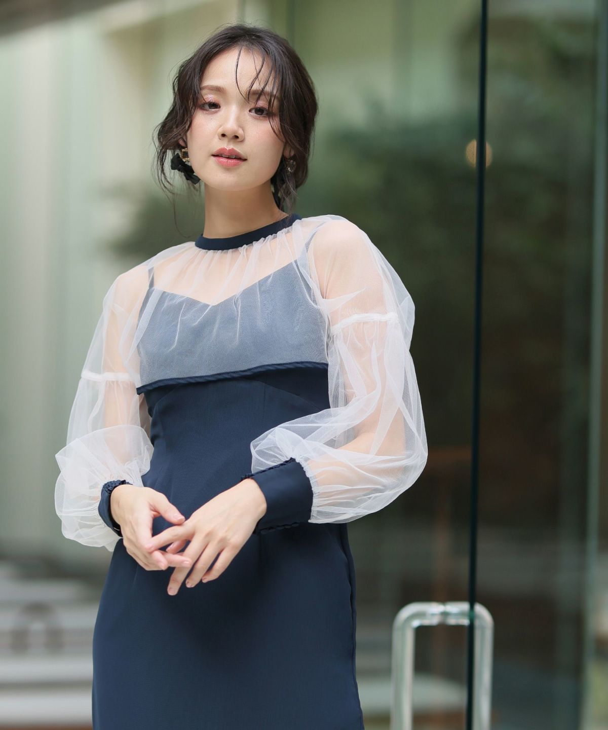 透け感のあるボリュームスリーブと、シルエットを美しく引き立てるタイトワンピースの組み合わせが今っぽいドレス。