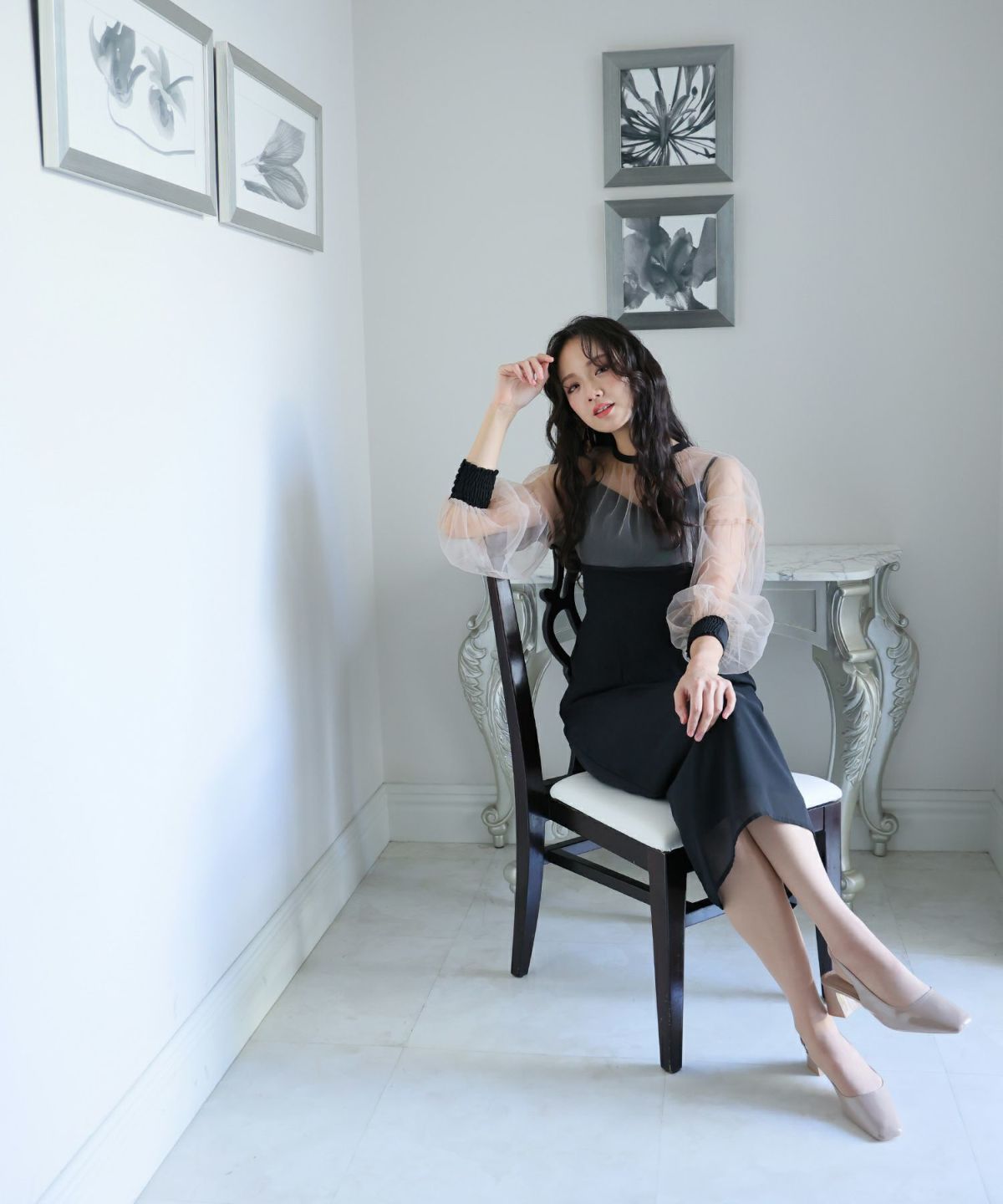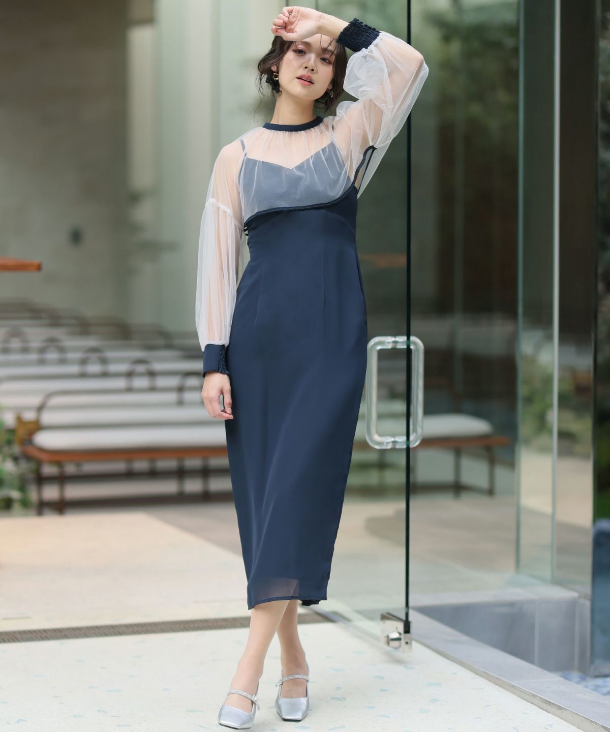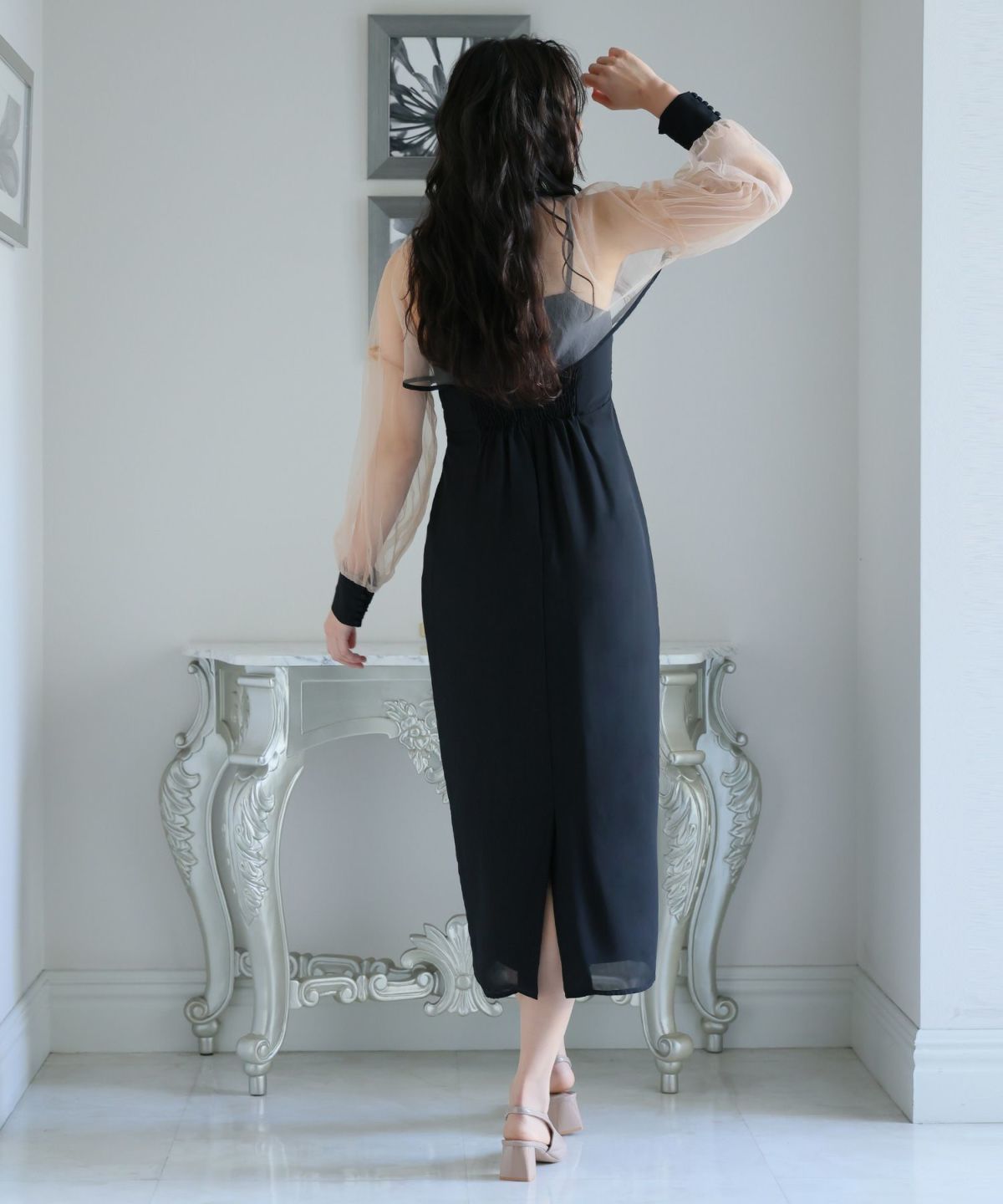 透け感のあるボリュームスリーブと、シルエットを美しく引き立てるタイトワンピースの組み合わせが今っぽいドレス。