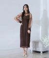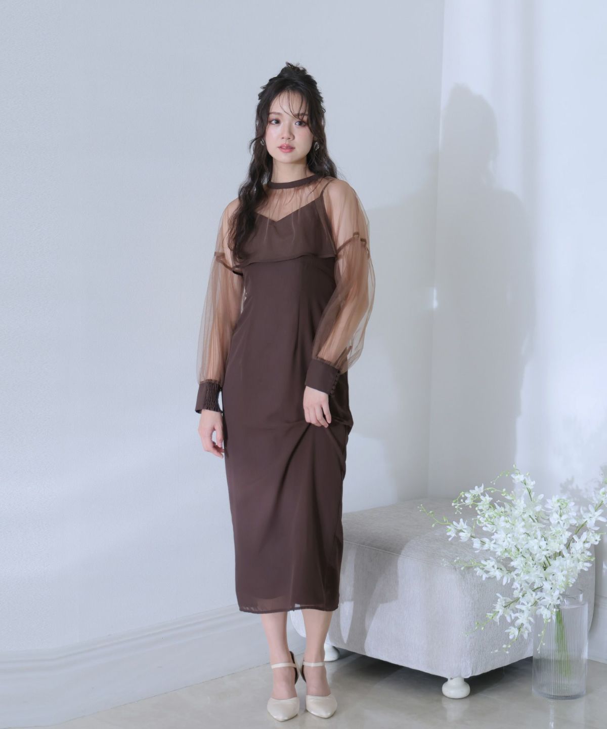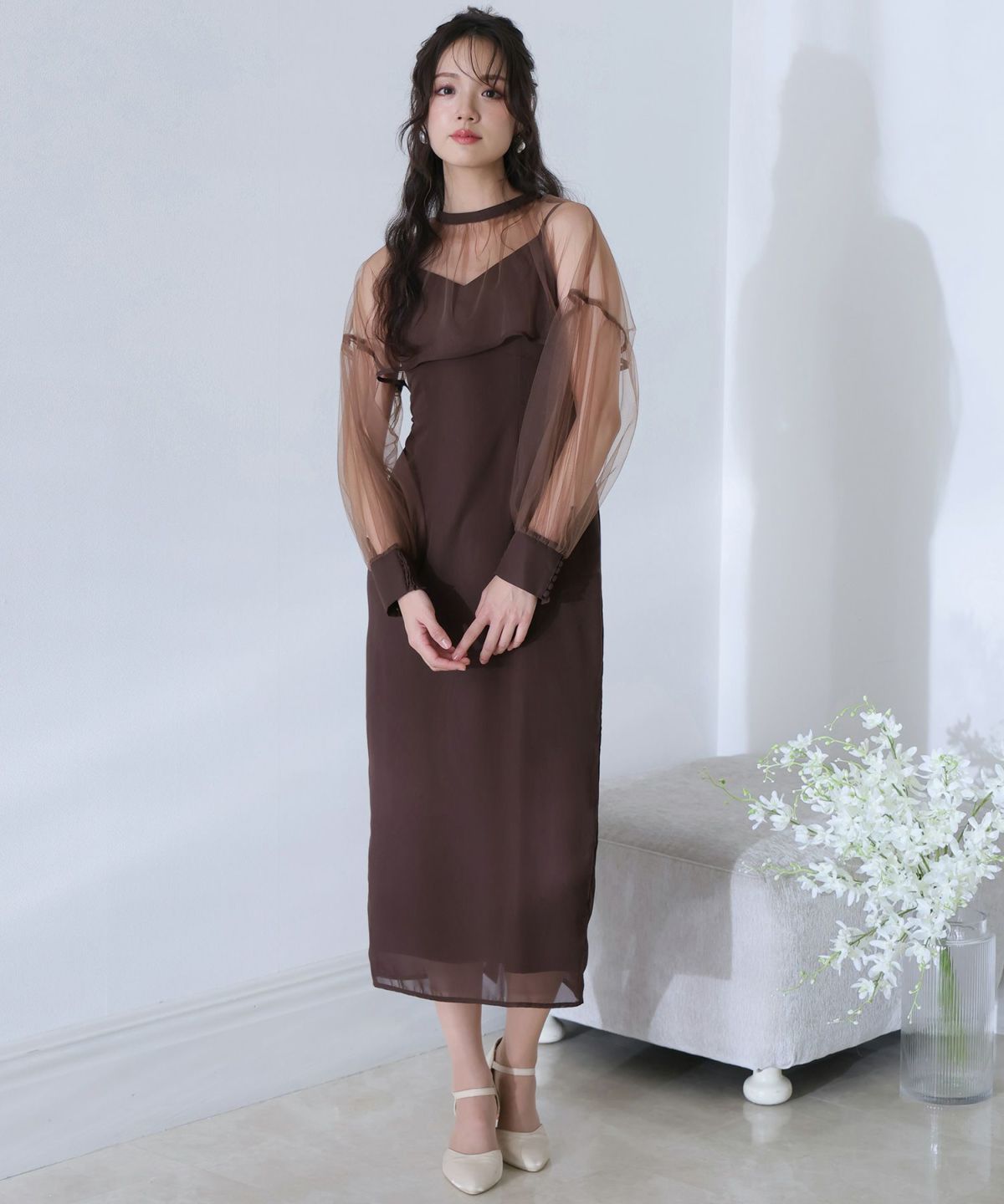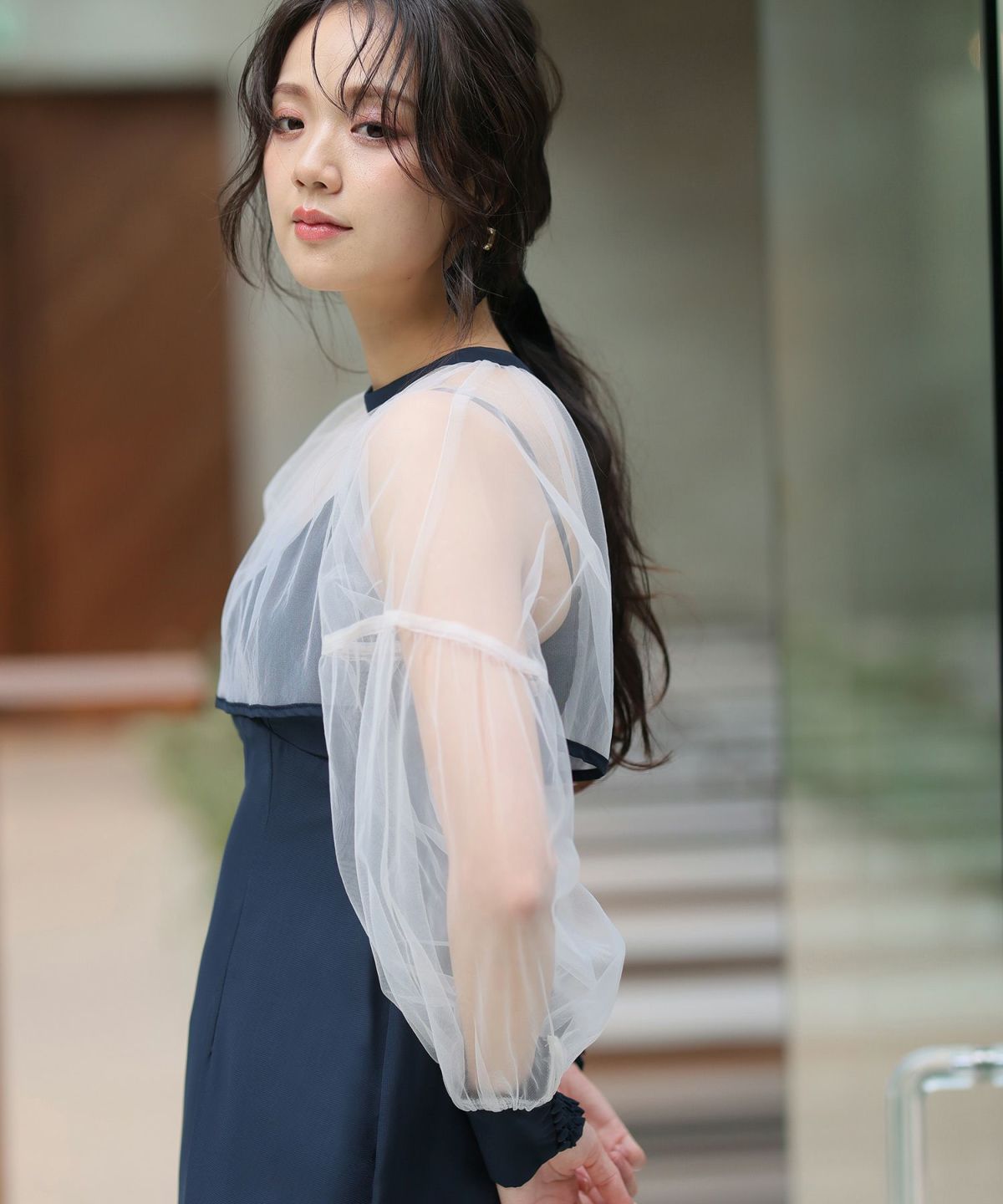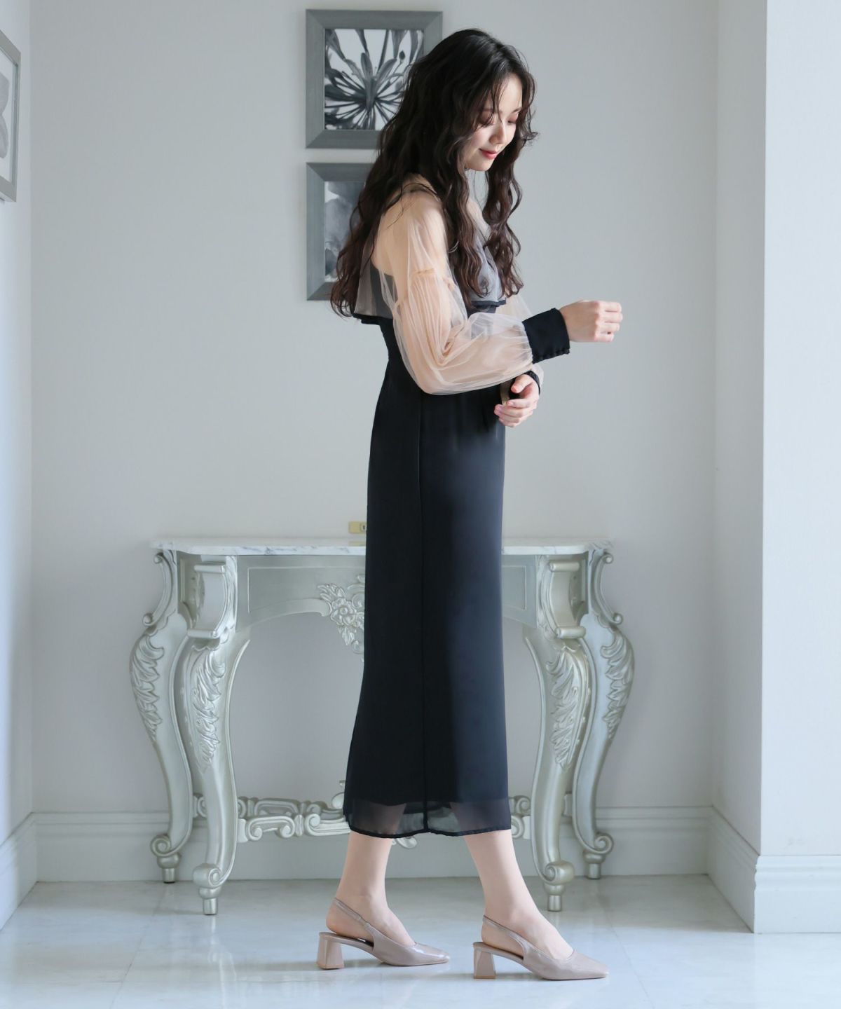 透け感のあるボリュームスリーブと、シルエットを美しく引き立てるタイトワンピースの組み合わせが今っぽいドレス。