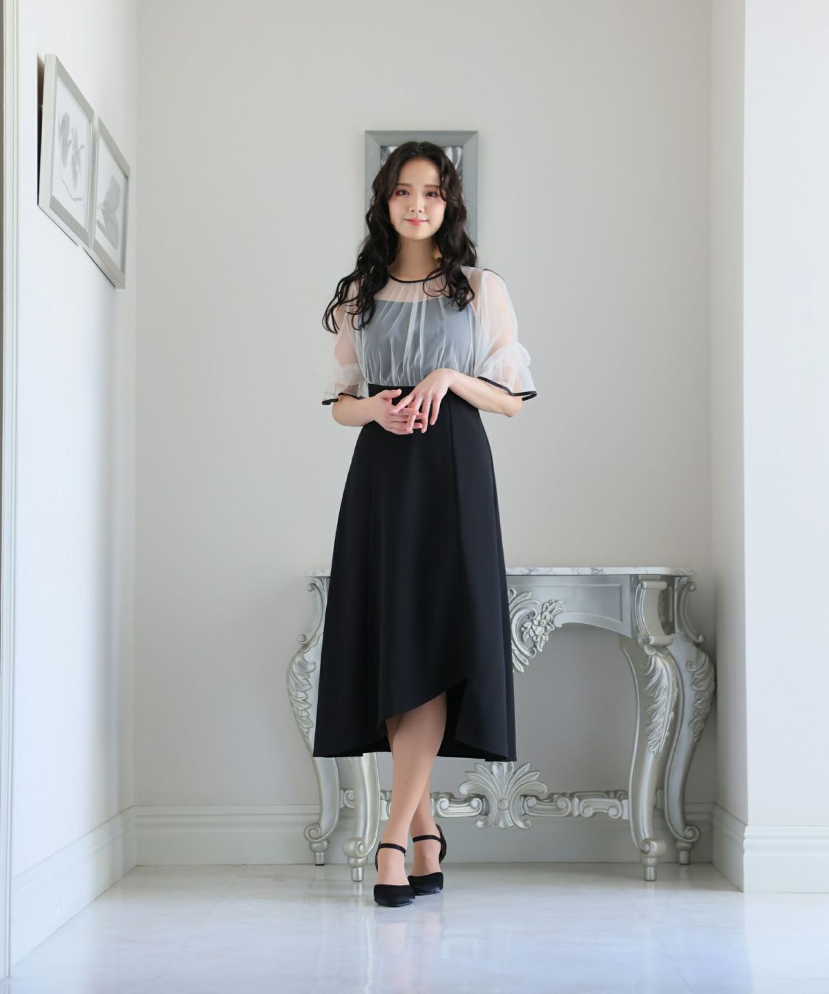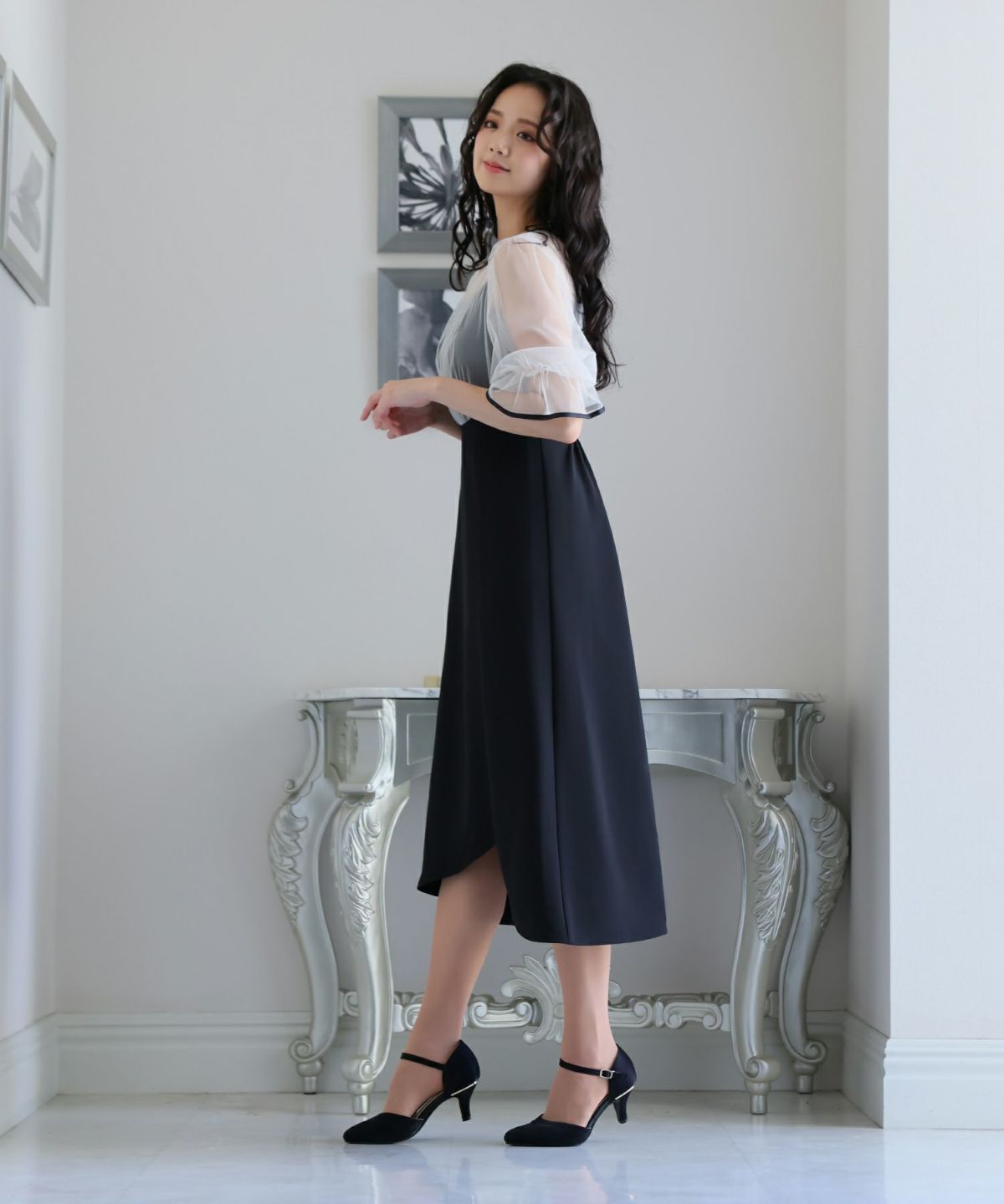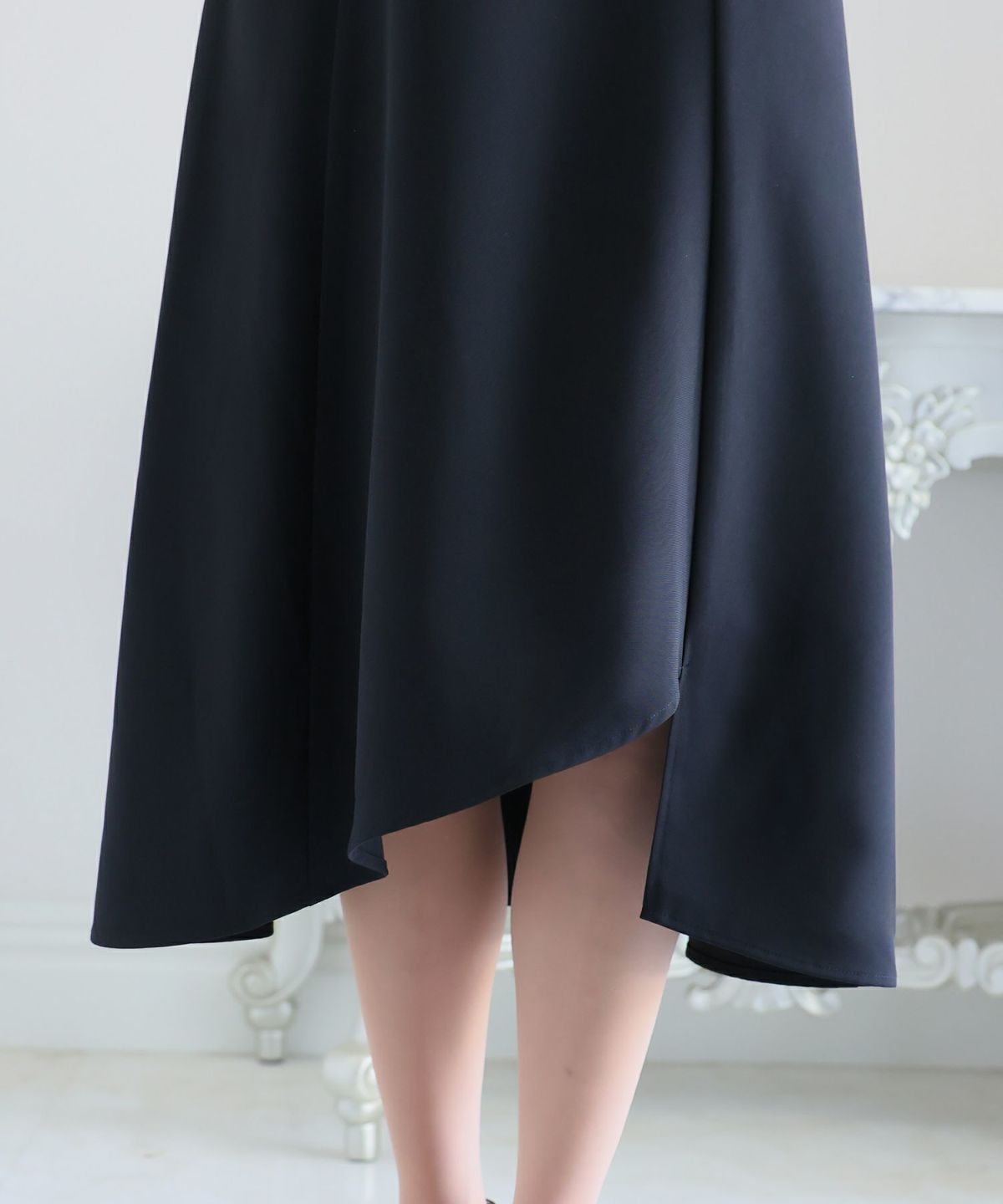 スカートのアシンメトリーデザインが、足元をすっきりと美しく演出。