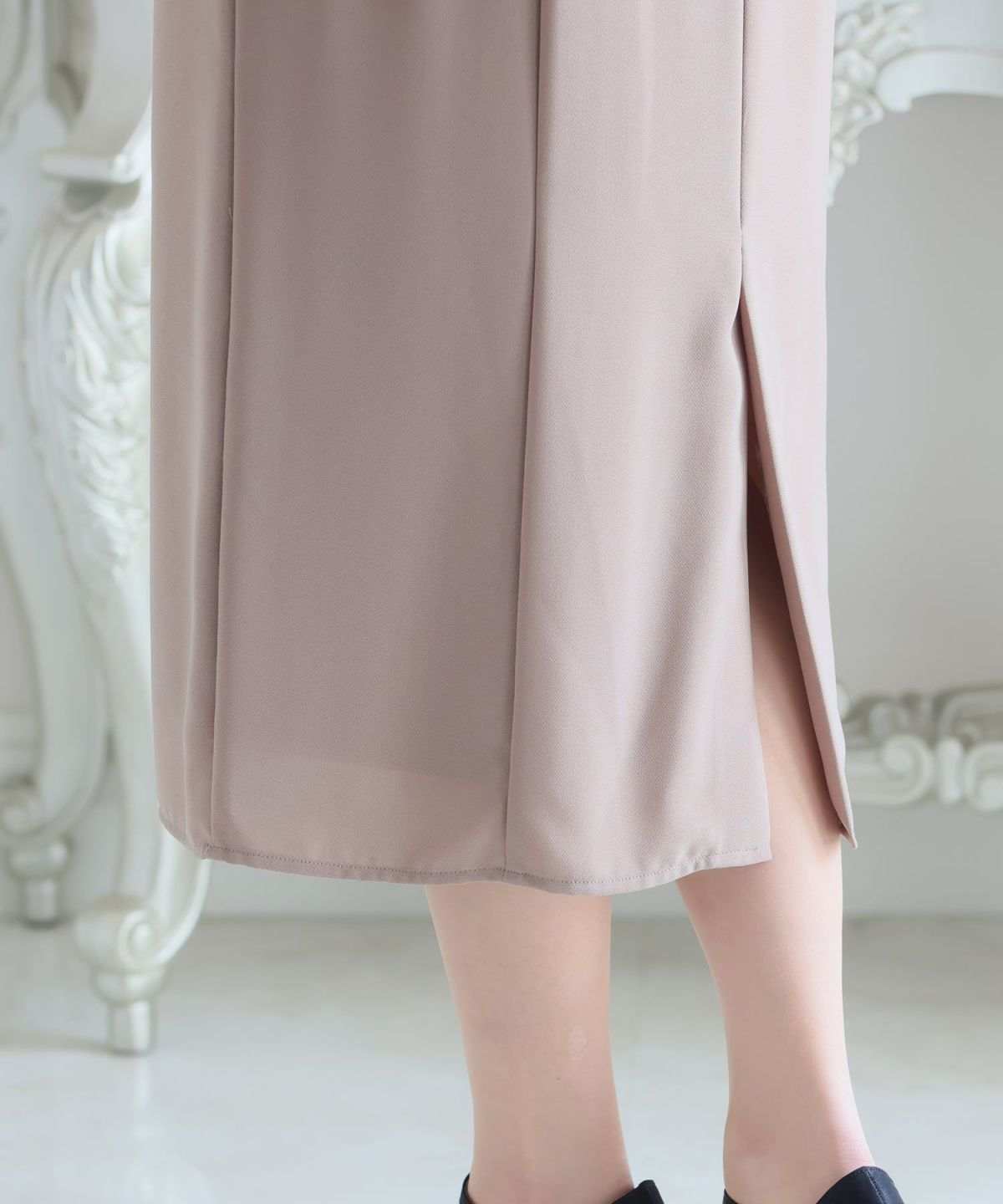 スカートは身体のラインを拾いすぎないタイトスカートで全体のイメージを落ち着かせます。