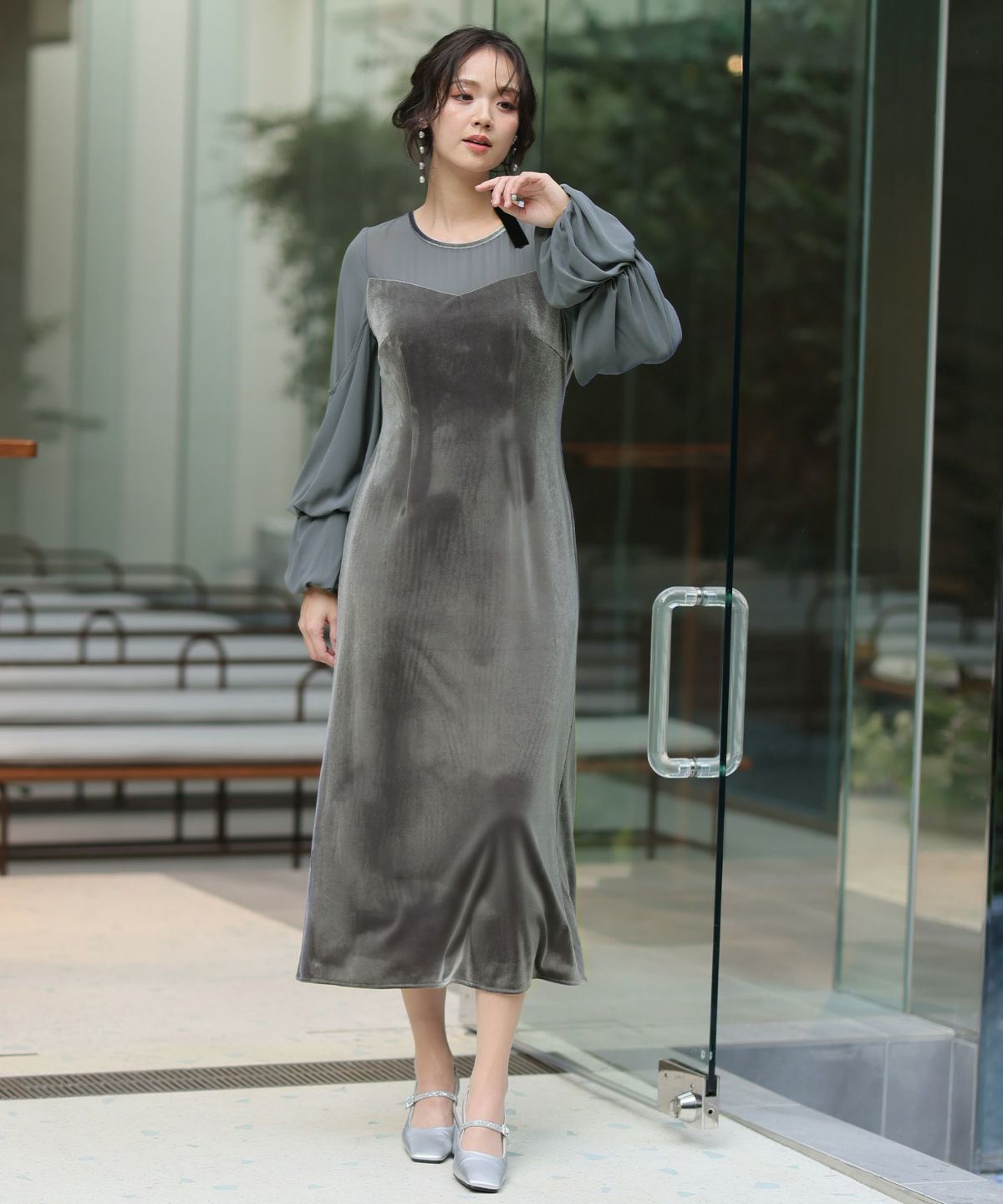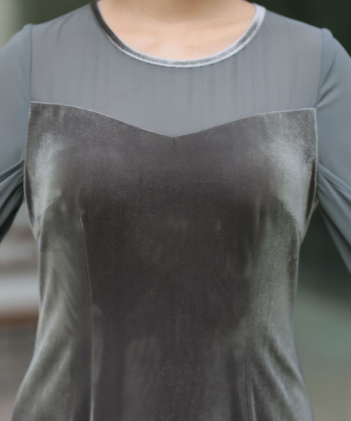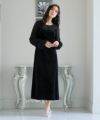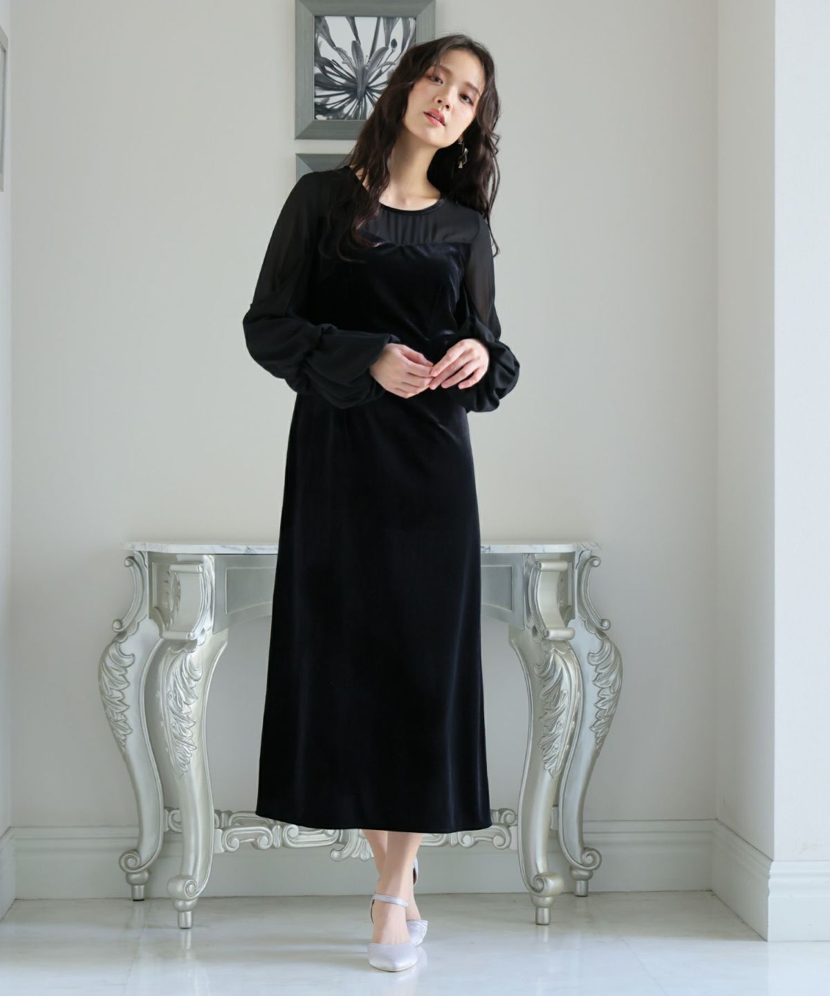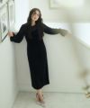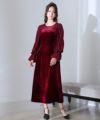 上質なベロアとシフォン素材を組み合わせたフレアドレス。