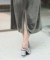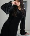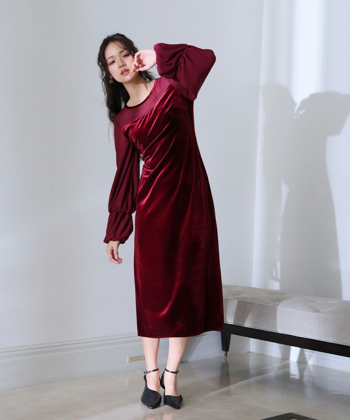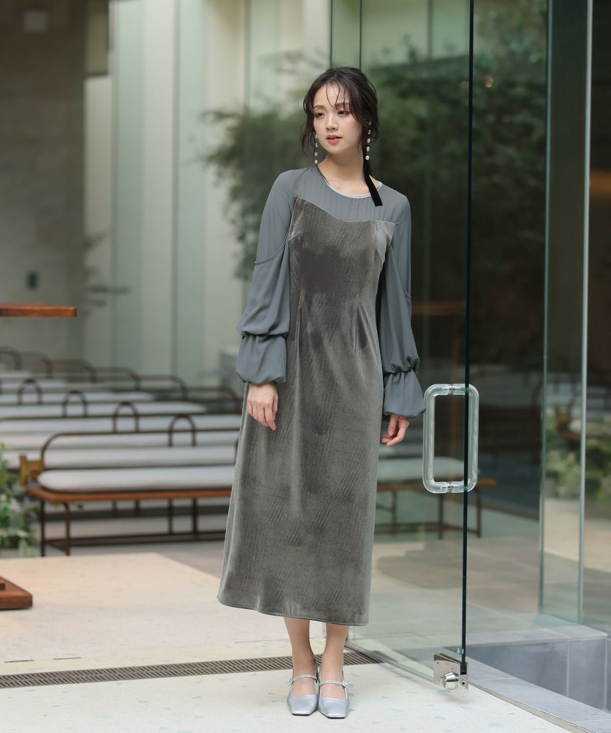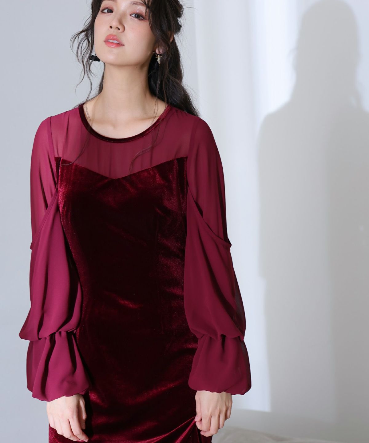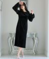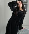上質なベロアとシフォン素材を組み合わせたフレアドレス。