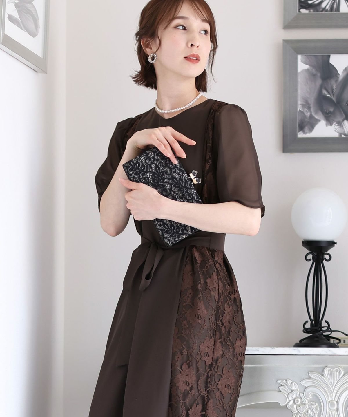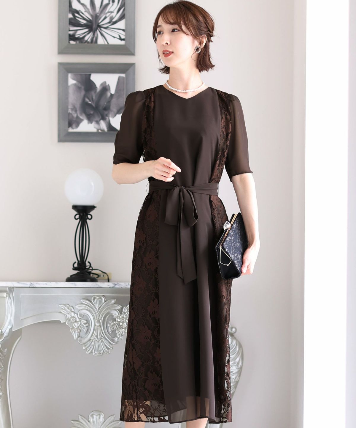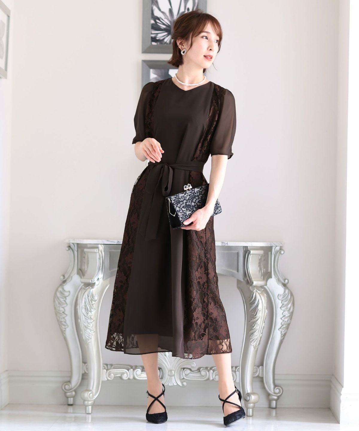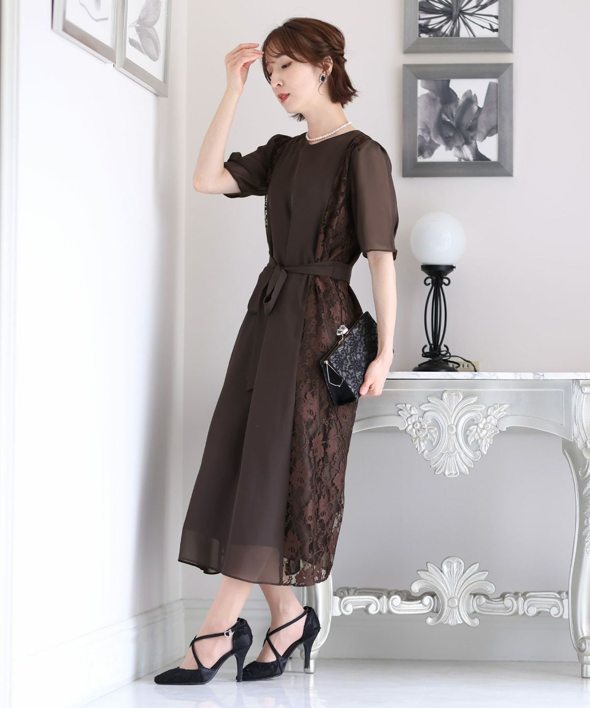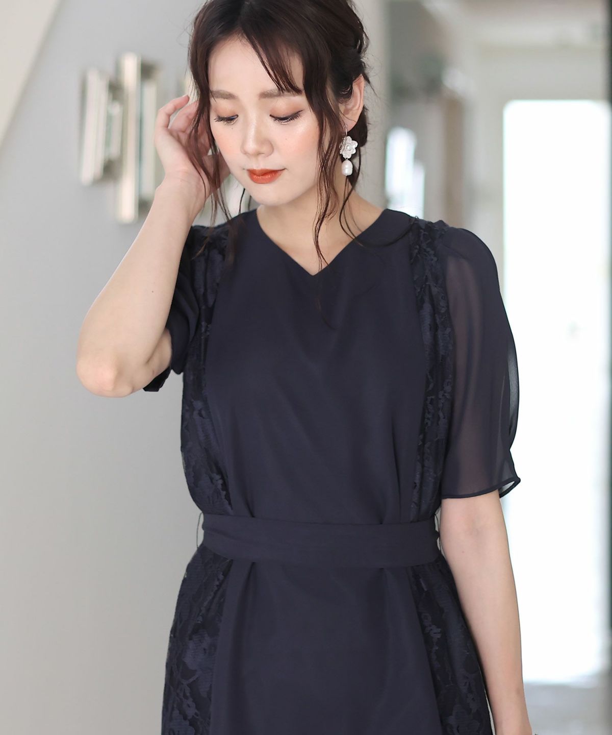 ■エレガント×女性らしいシフォンワンピースシフォンとレースが切り替えられたデザイン性のあるドレスです。エレガントなドレスなので、ジャケットなどと合わせて様々なオケージョンシーンにおすすめです。付属のリボンは取外し可能で2WAY仕様のワンピースです。切替レースで華やかですが、落ち着いたカラーバリエーションで甘すぎないワンピースに仕上がっています。