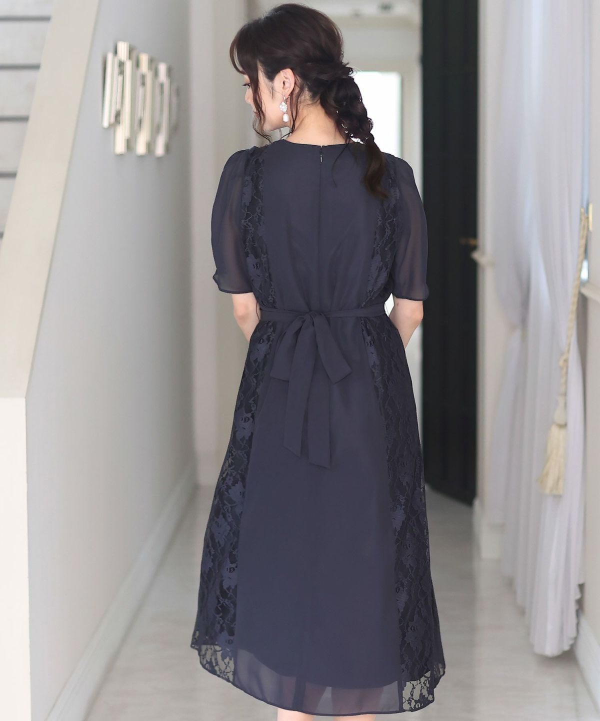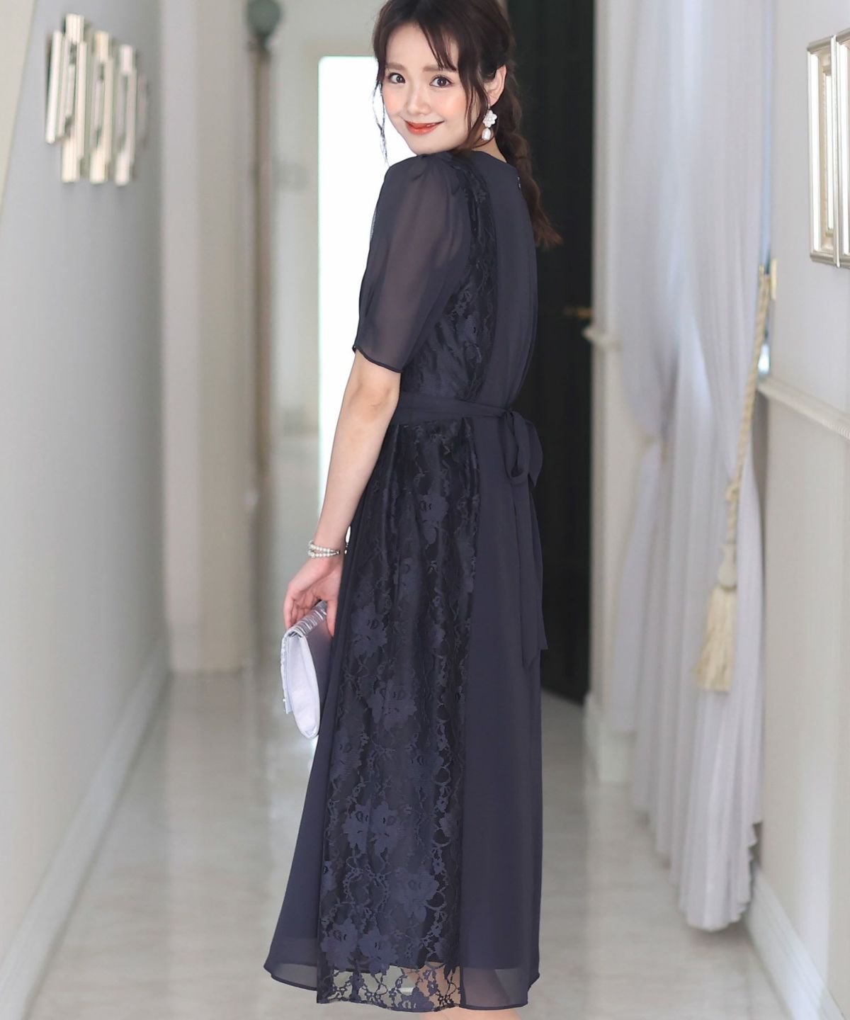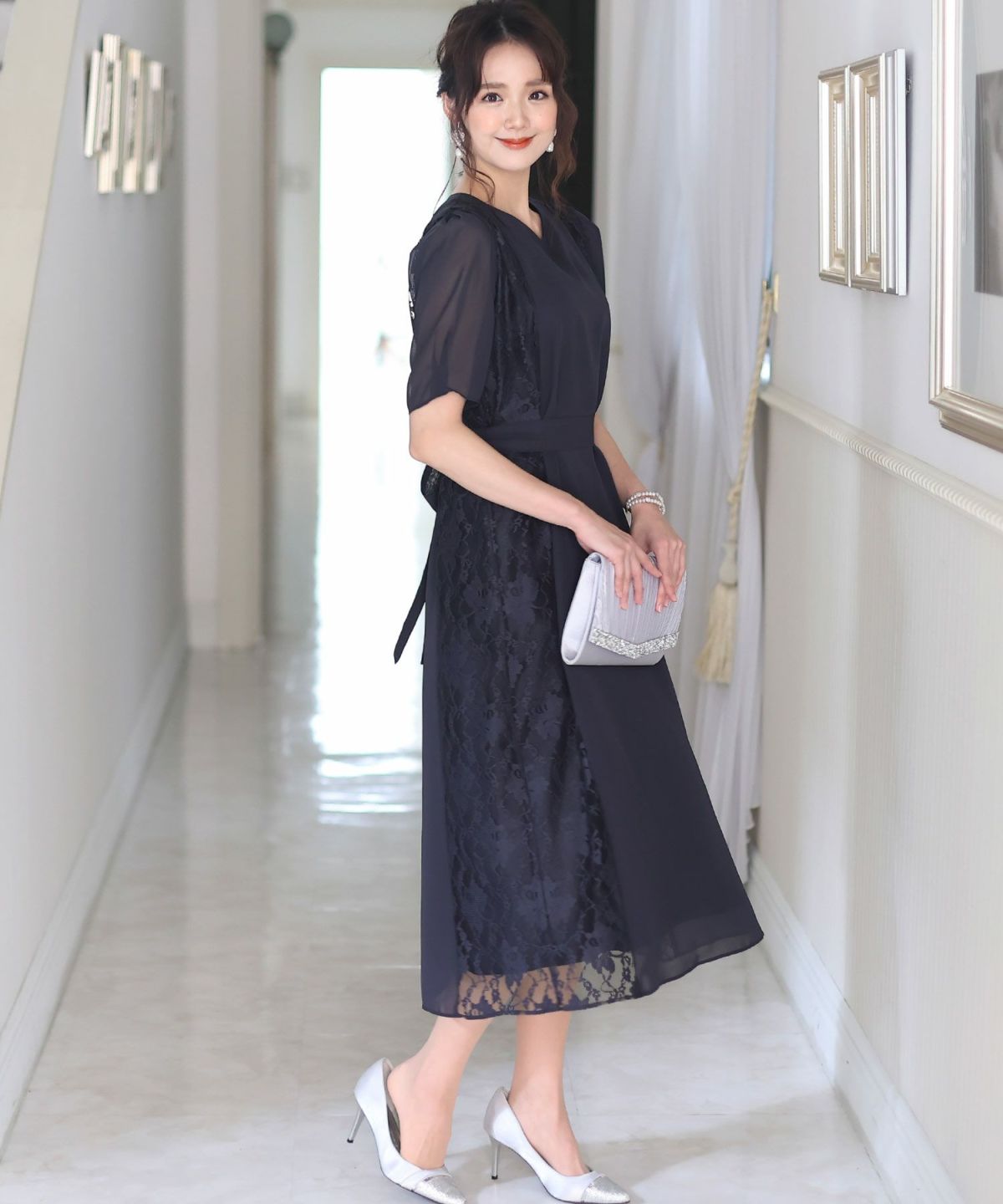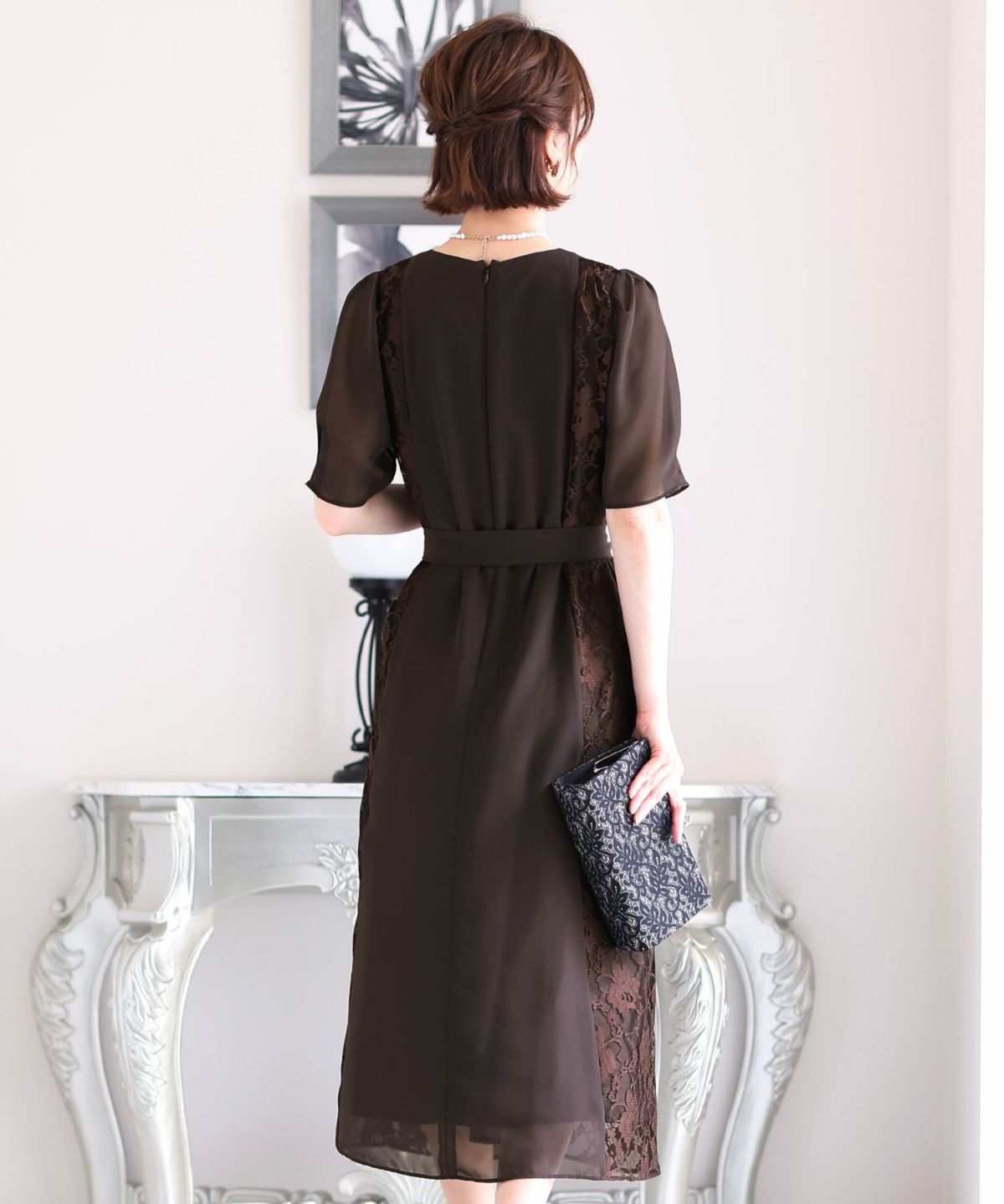 ■エレガント×女性らしいシフォンワンピースシフォンとレースが切り替えられたデザイン性のあるドレスです。エレガントなドレスなので、ジャケットなどと合わせて様々なオケージョンシーンにおすすめです。付属のリボンは取外し可能で2WAY仕様のワンピースです。切替レースで華やかですが、落ち着いたカラーバリエーションで甘すぎないワンピースに仕上がっています。