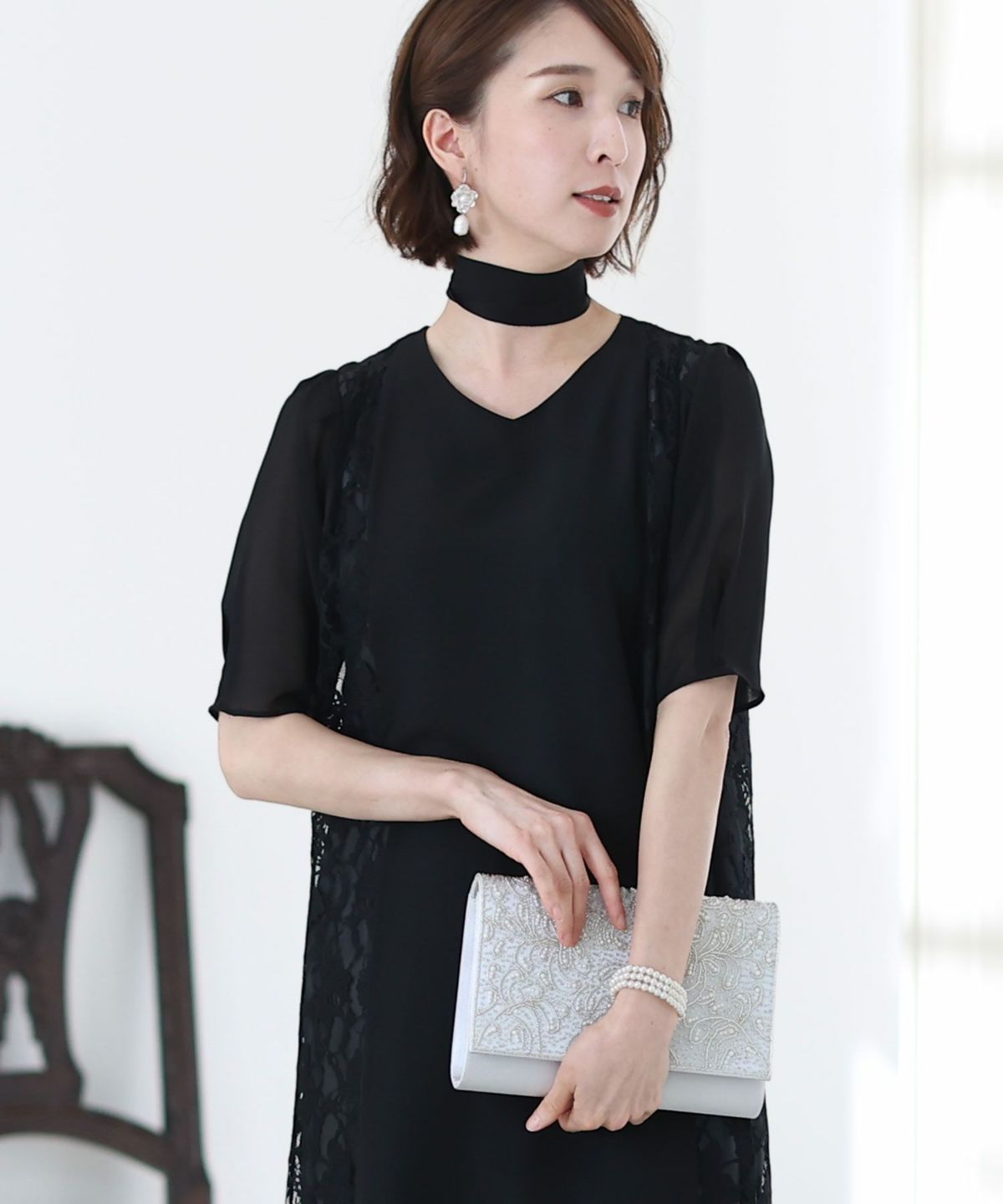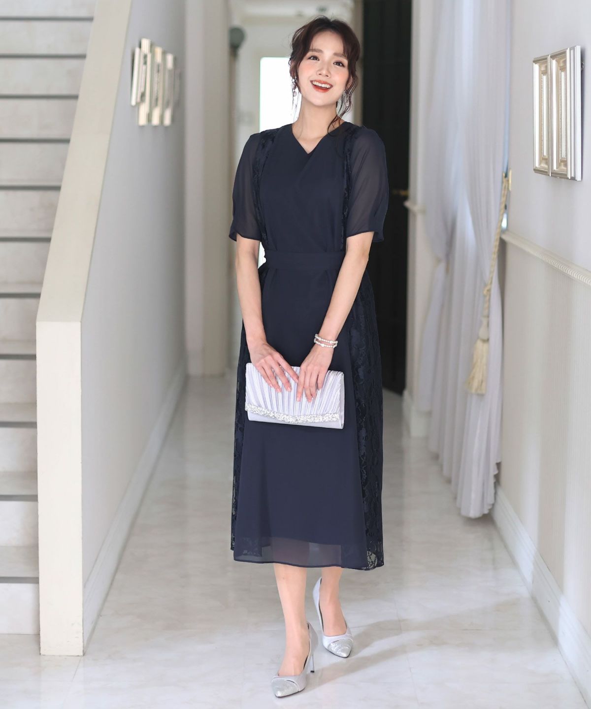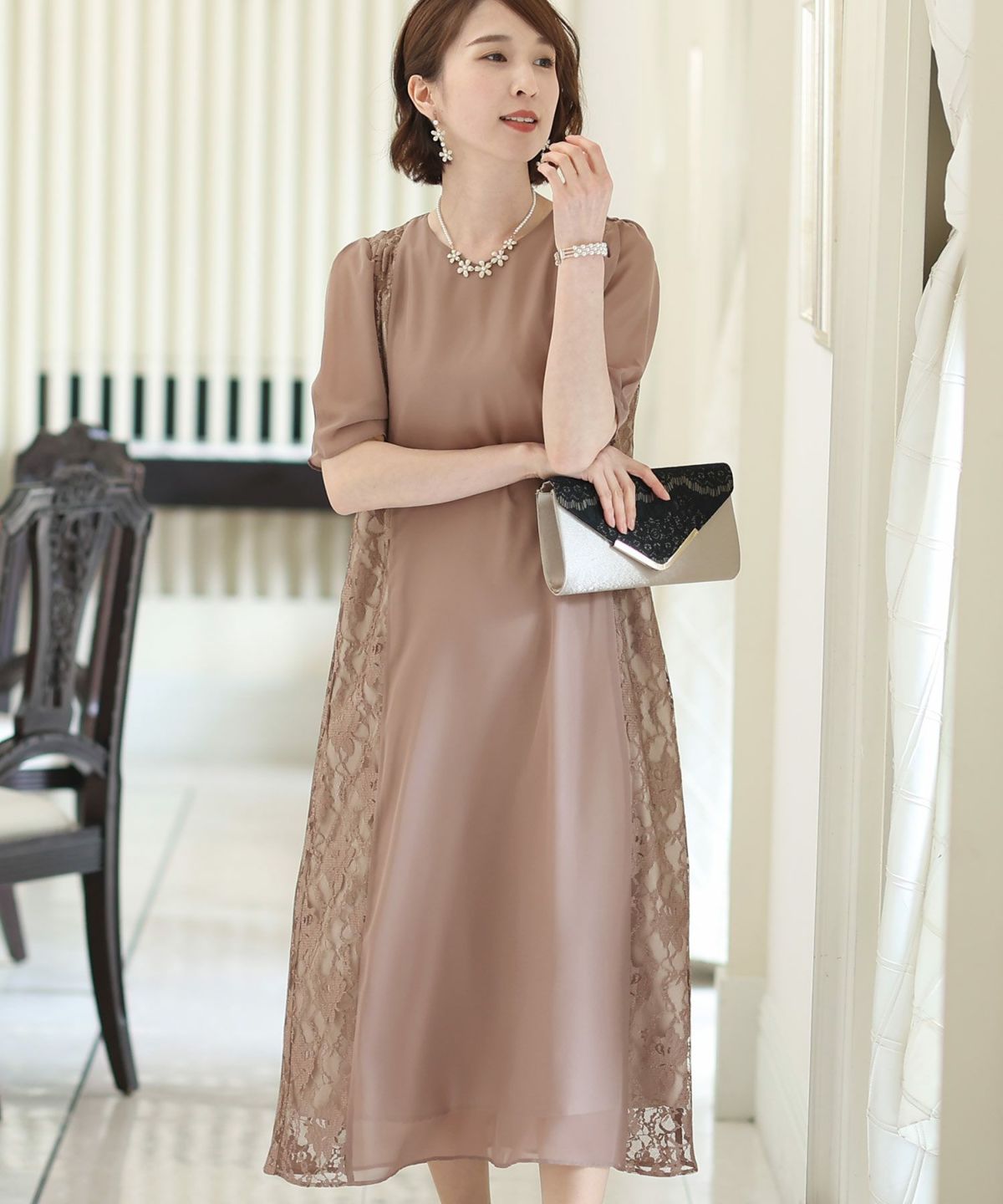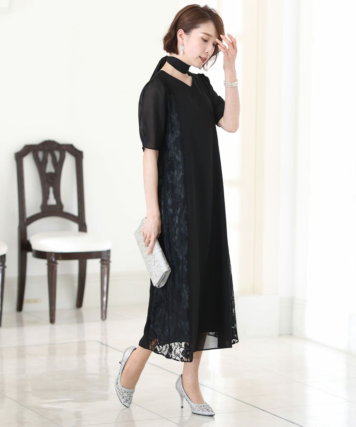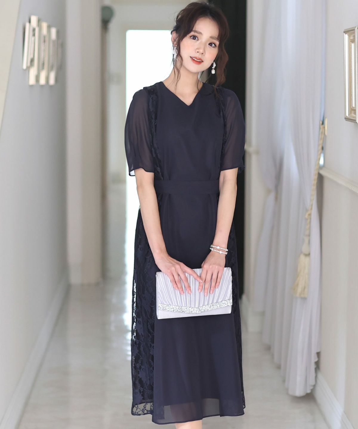 ■エレガント×女性らしいシフォンワンピースシフォンとレースが切り替えられたデザイン性のあるドレスです。エレガントなドレスなので、ジャケットなどと合わせて様々なオケージョンシーンにおすすめです。付属のリボンは取外し可能で2WAY仕様のワンピースです。切替レースで華やかですが、落ち着いたカラーバリエーションで甘すぎないワンピースに仕上がっています。