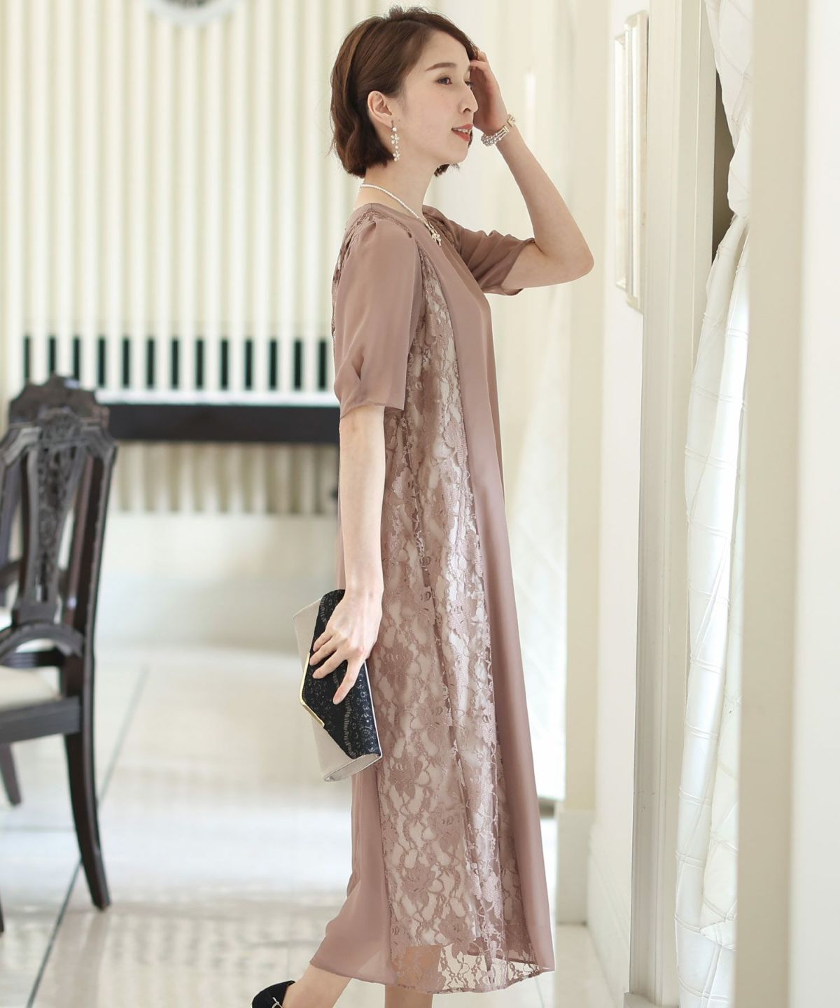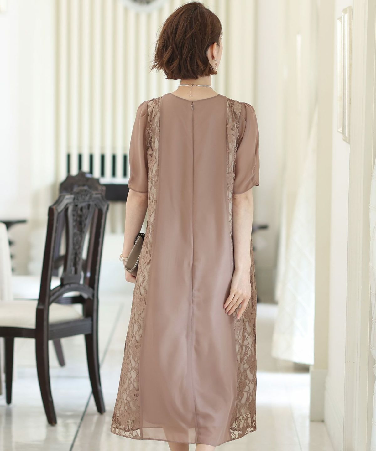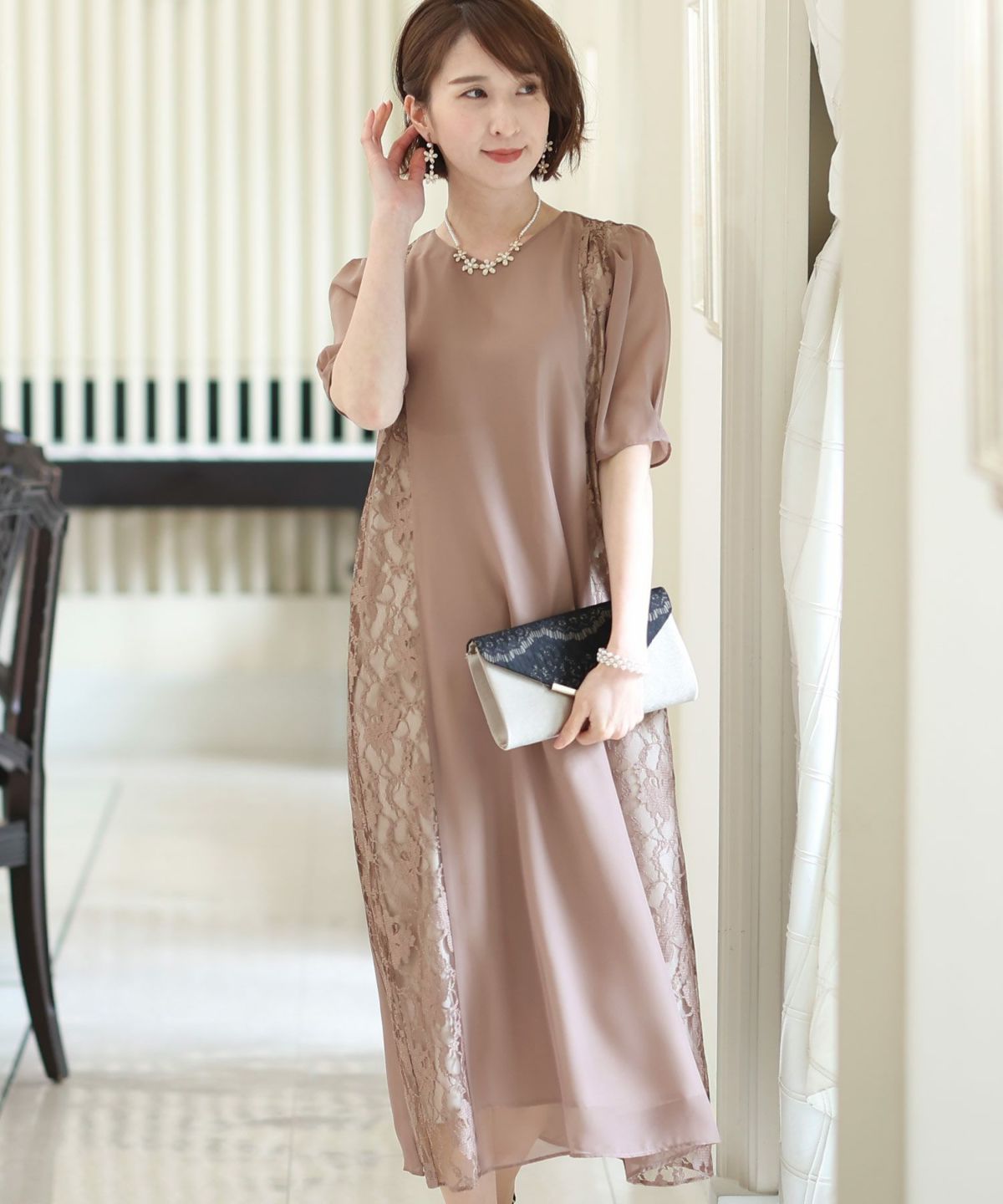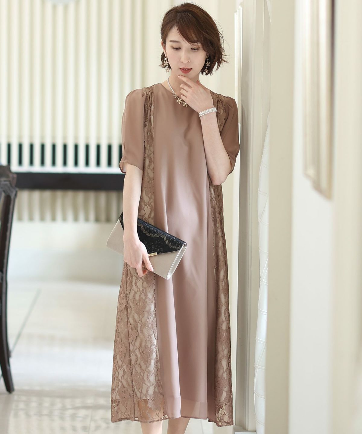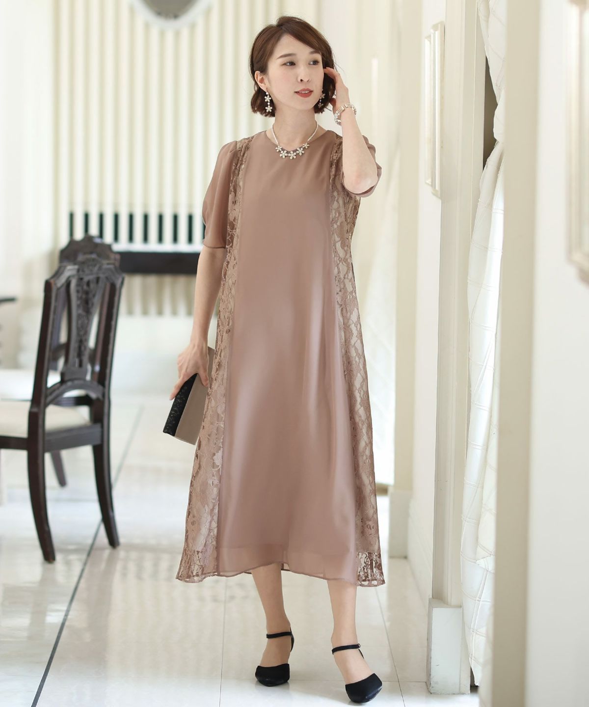 ■エレガント×女性らしいシフォンワンピースシフォンとレースが切り替えられたデザイン性のあるドレスです。エレガントなドレスなので、ジャケットなどと合わせて様々なオケージョンシーンにおすすめです。付属のリボンは取外し可能で2WAY仕様のワンピースです。切替レースで華やかですが、落ち着いたカラーバリエーションで甘すぎないワンピースに仕上がっています。