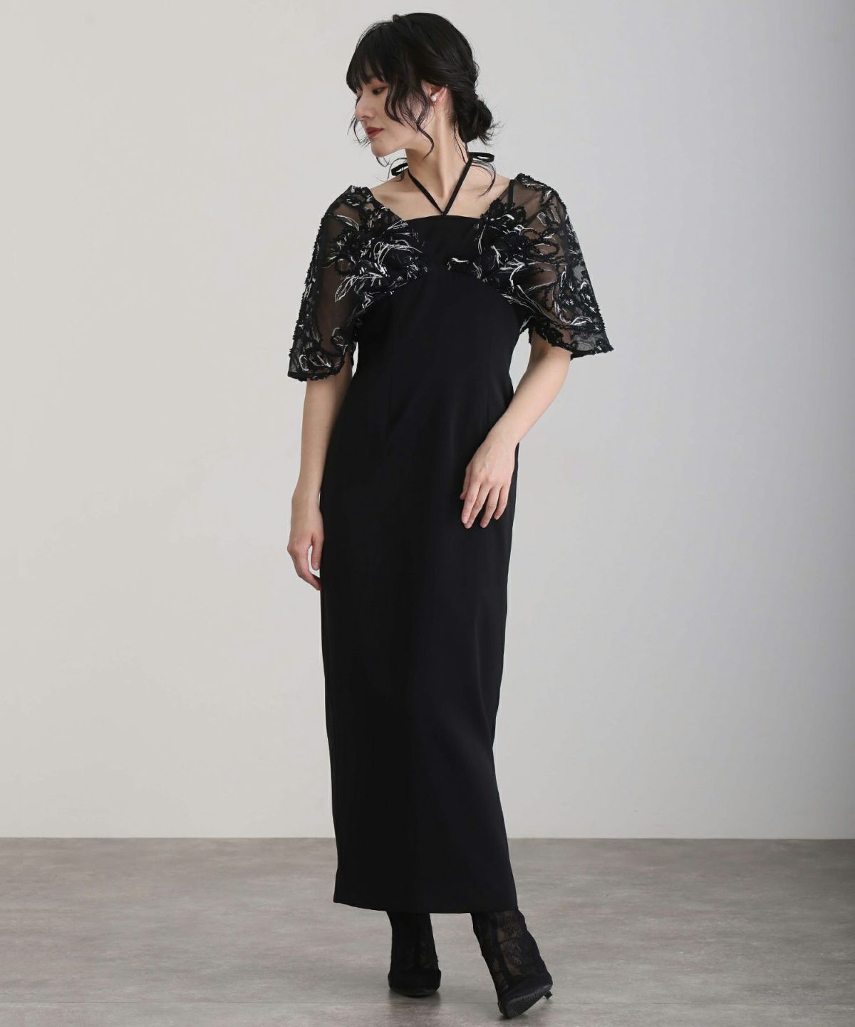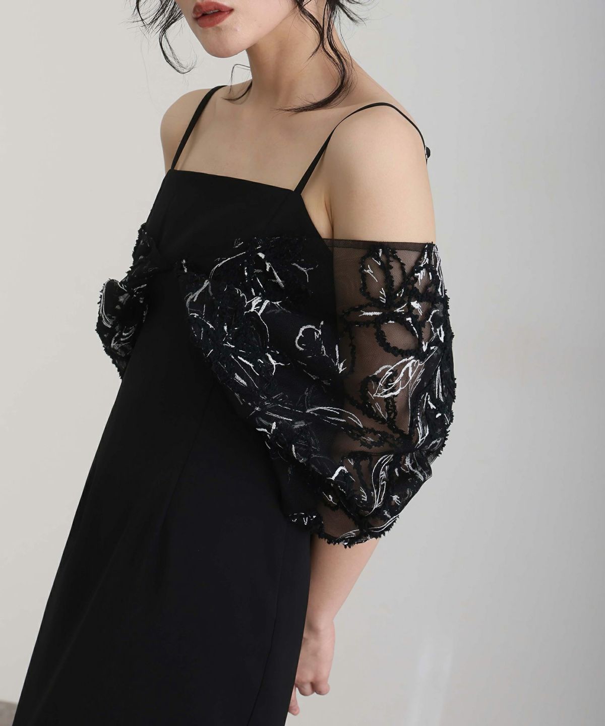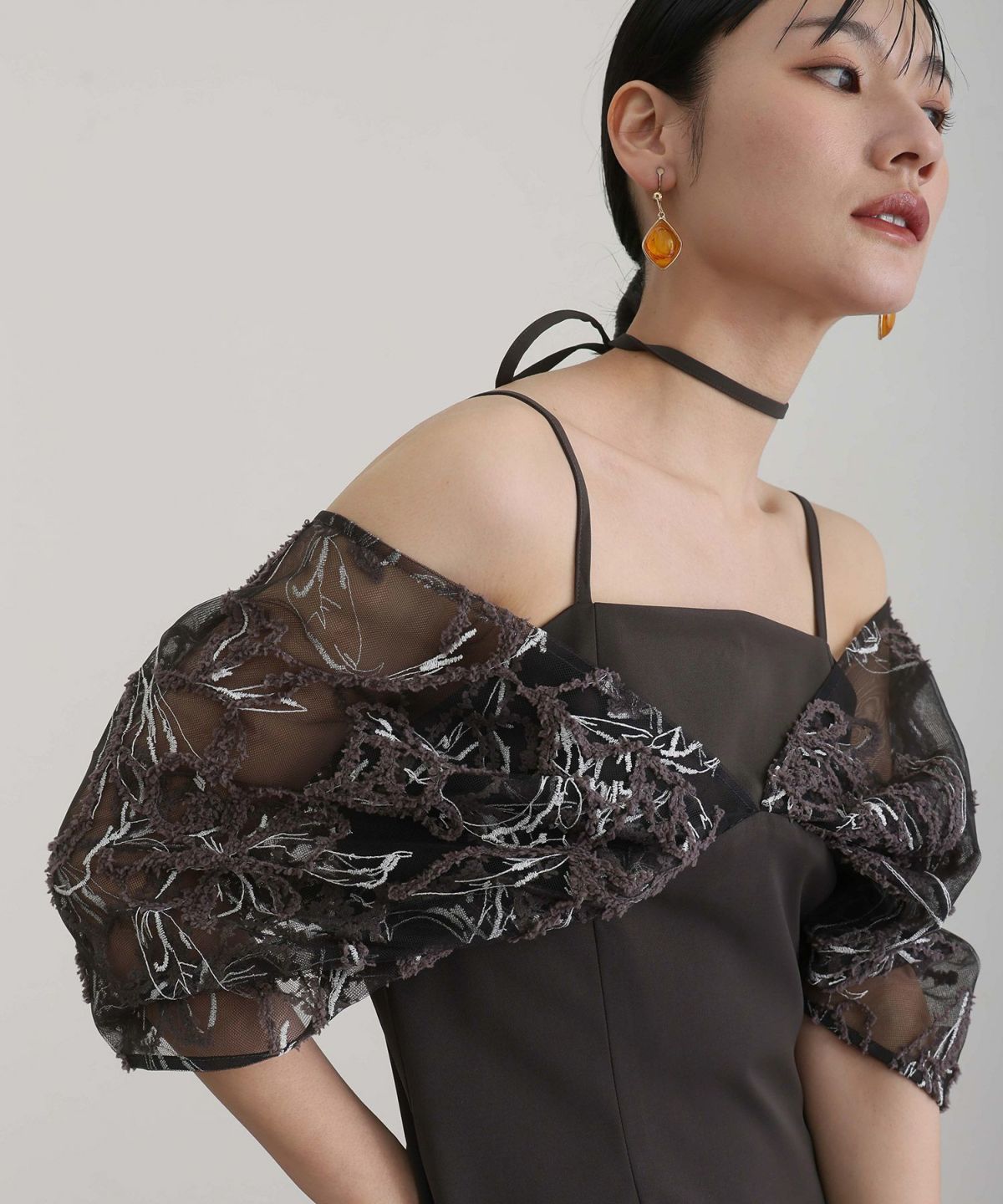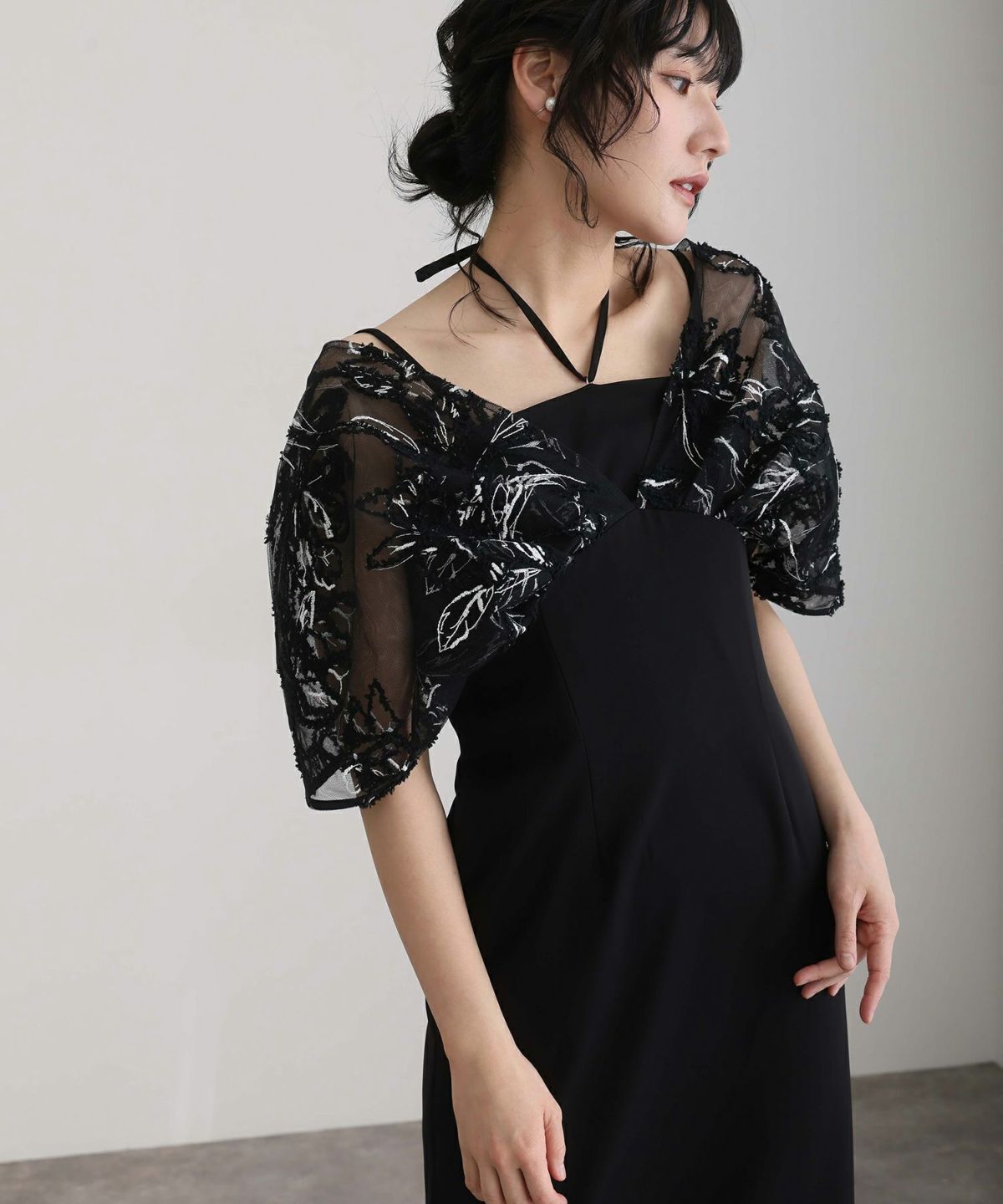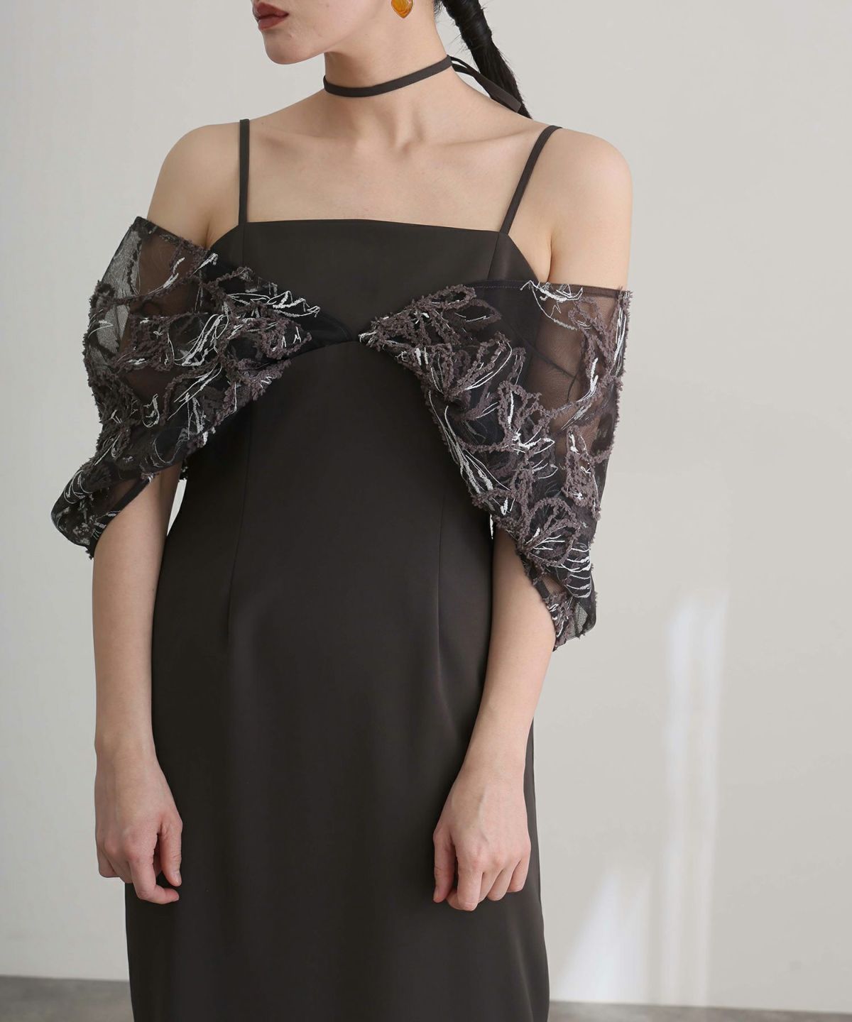 ラメ糸を使用した印象的な立体感のあるフラワー刺繍がデザインのポイント。