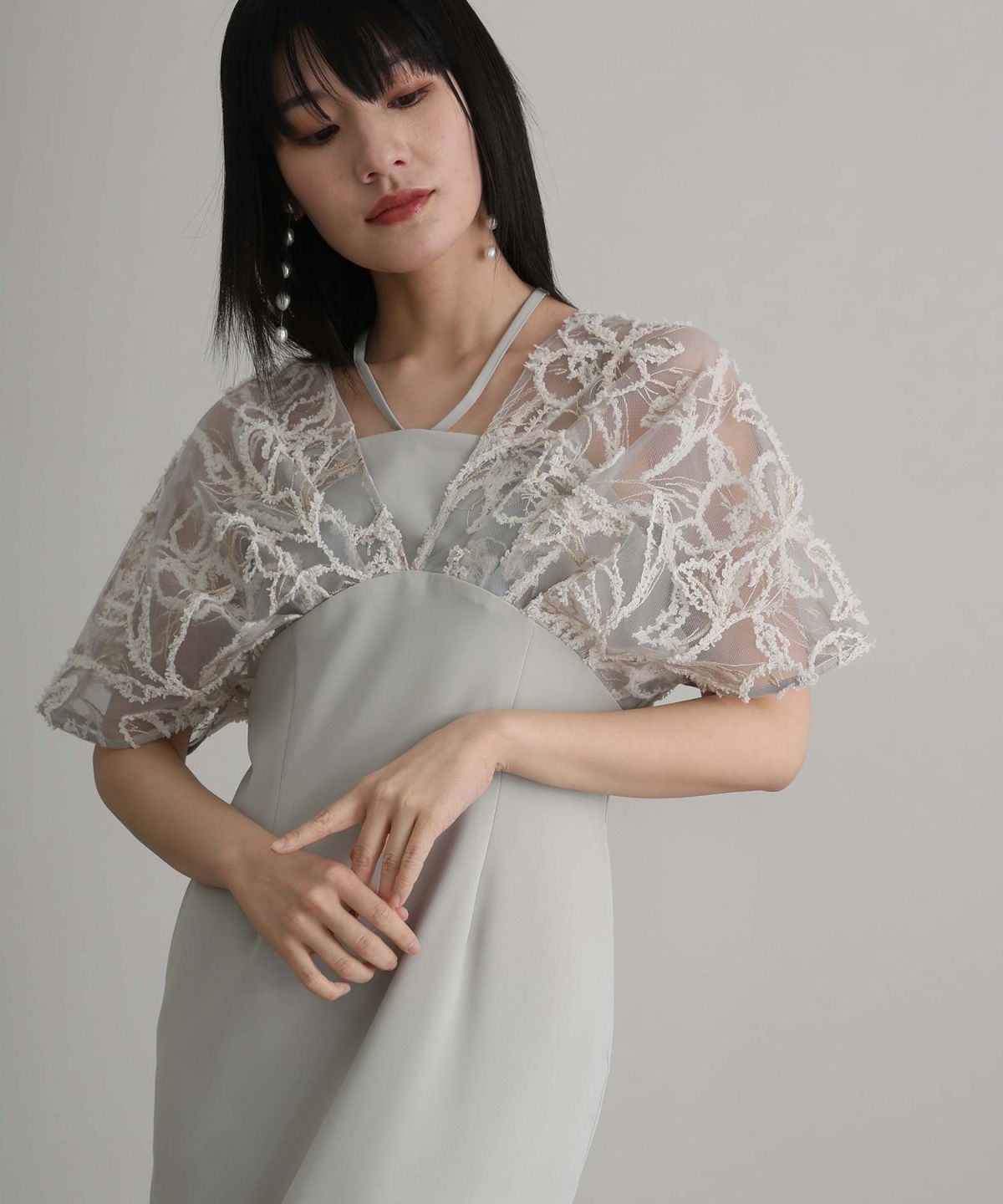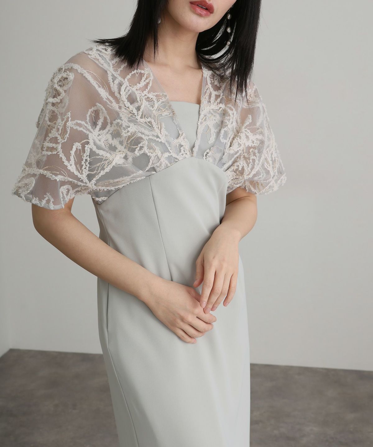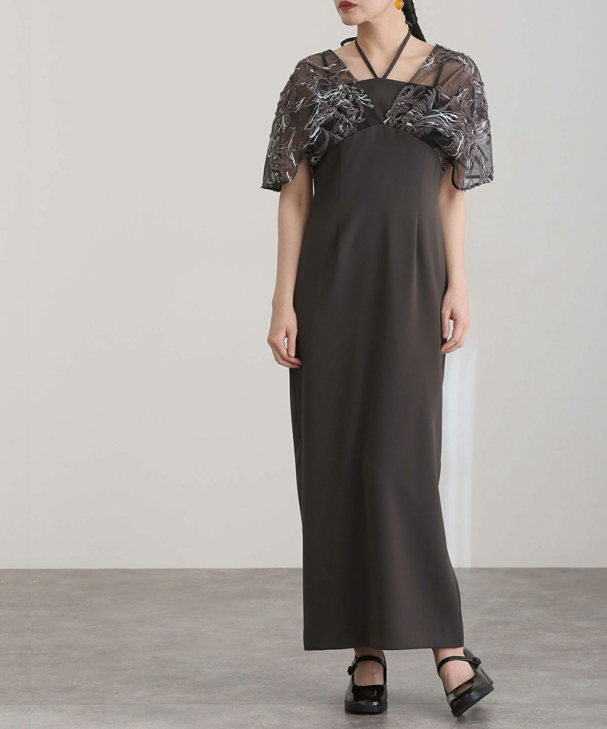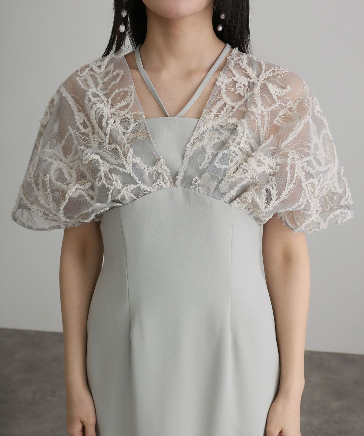 ラメ糸を使用した印象的な立体感のあるフラワー刺繍がデザインのポイント。