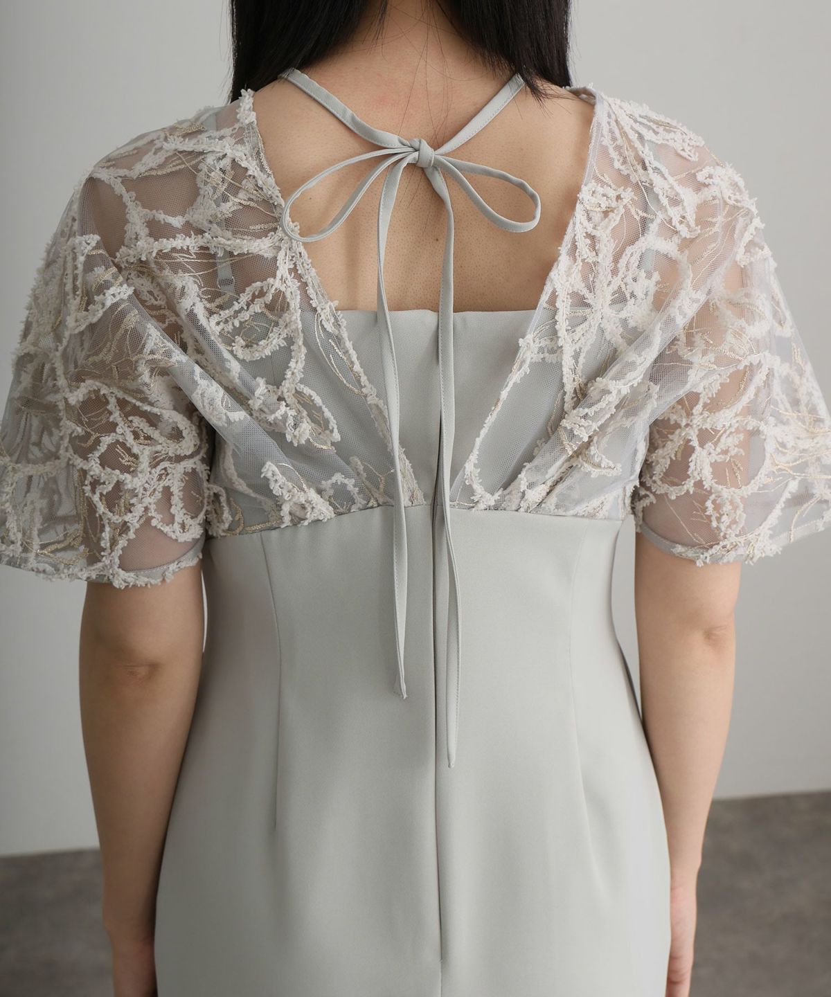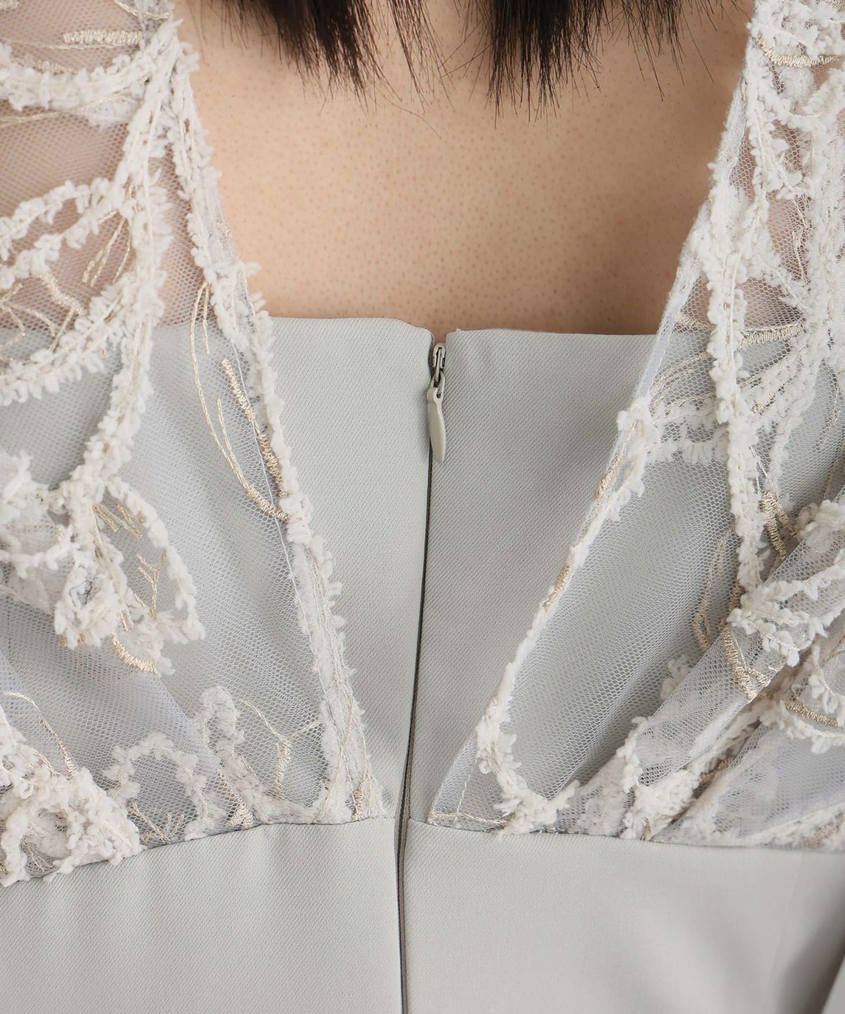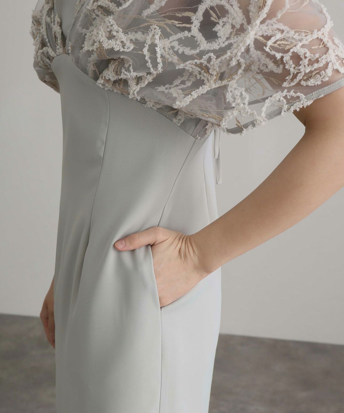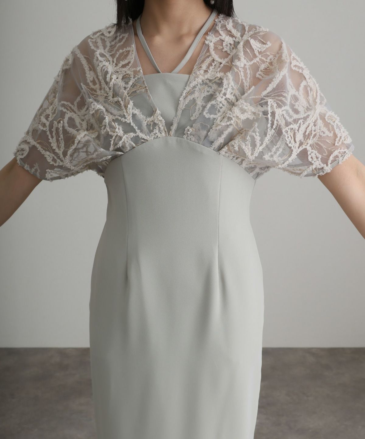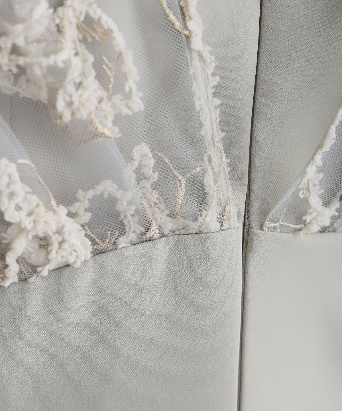 ラメ糸を使用した印象的な立体感のあるフラワー刺繍がデザインのポイント。