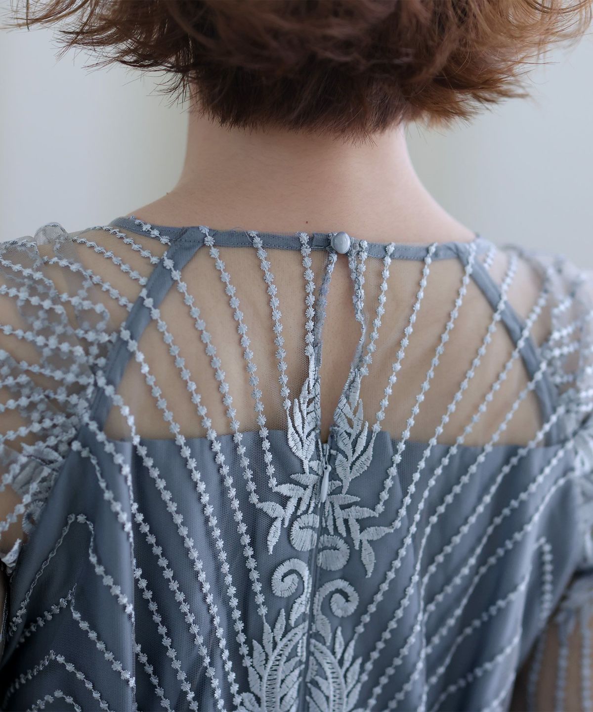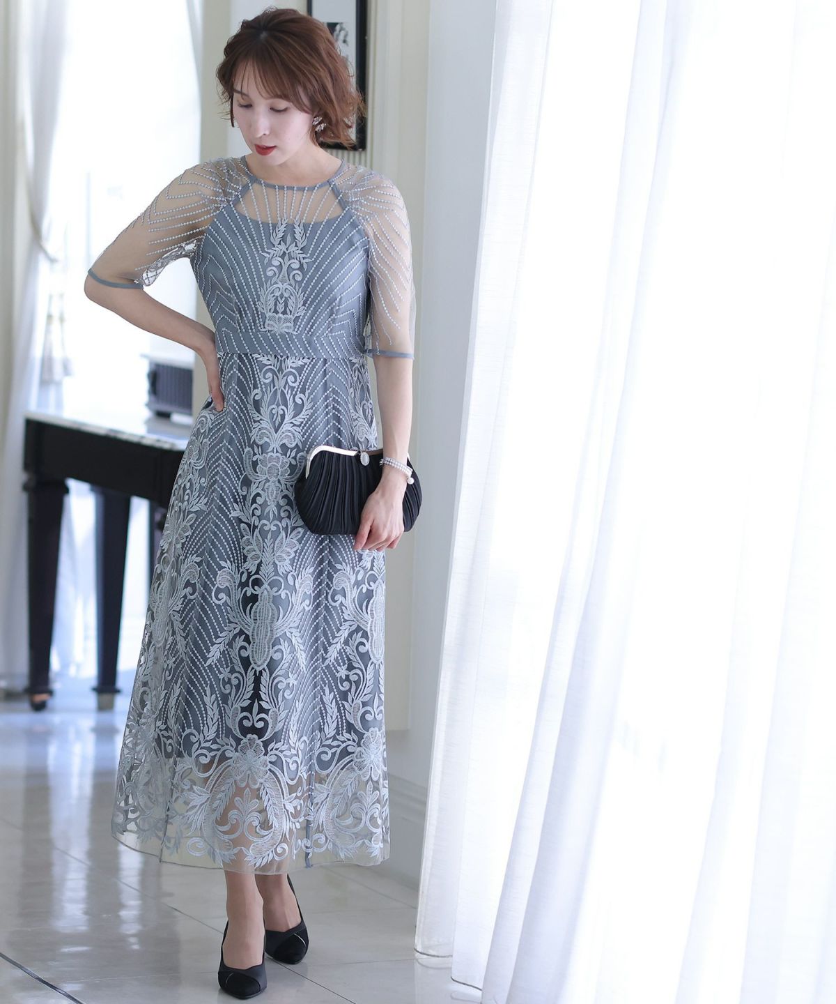 ■デコルテからスリーブにかけた透け感が上品高めのウエストラインで自然なスタイルアップが期待できます。