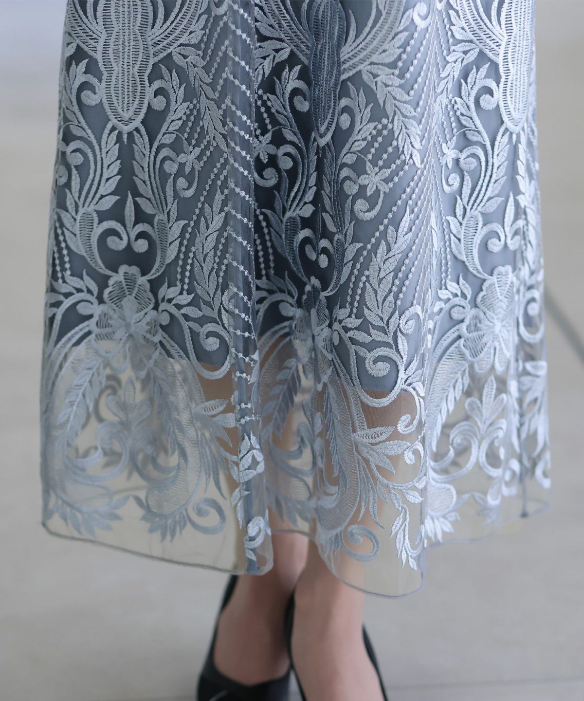 ■透け感×刺繍レース光沢感のある刺繍レースが煌びやかで上品なデザインワンピースです。程よい透け感で甘くなりすぎず、抜け感をプラス。立体感のある刺繍がエレガントな印象に。オケージョンシーンやパーティーなどにぴったりの華やかなアイテム。