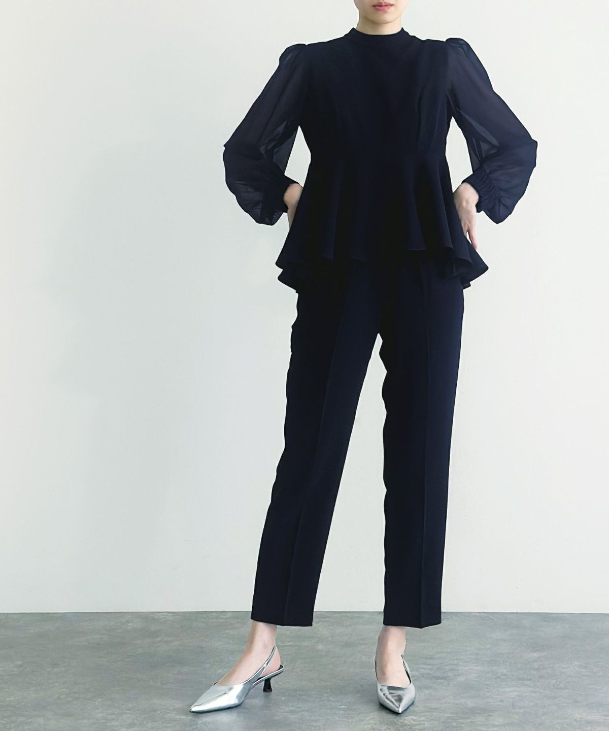 袖はシアー素材で抜け感があり、品よく肌見せができるため、華やかなシーンでも好印象です。