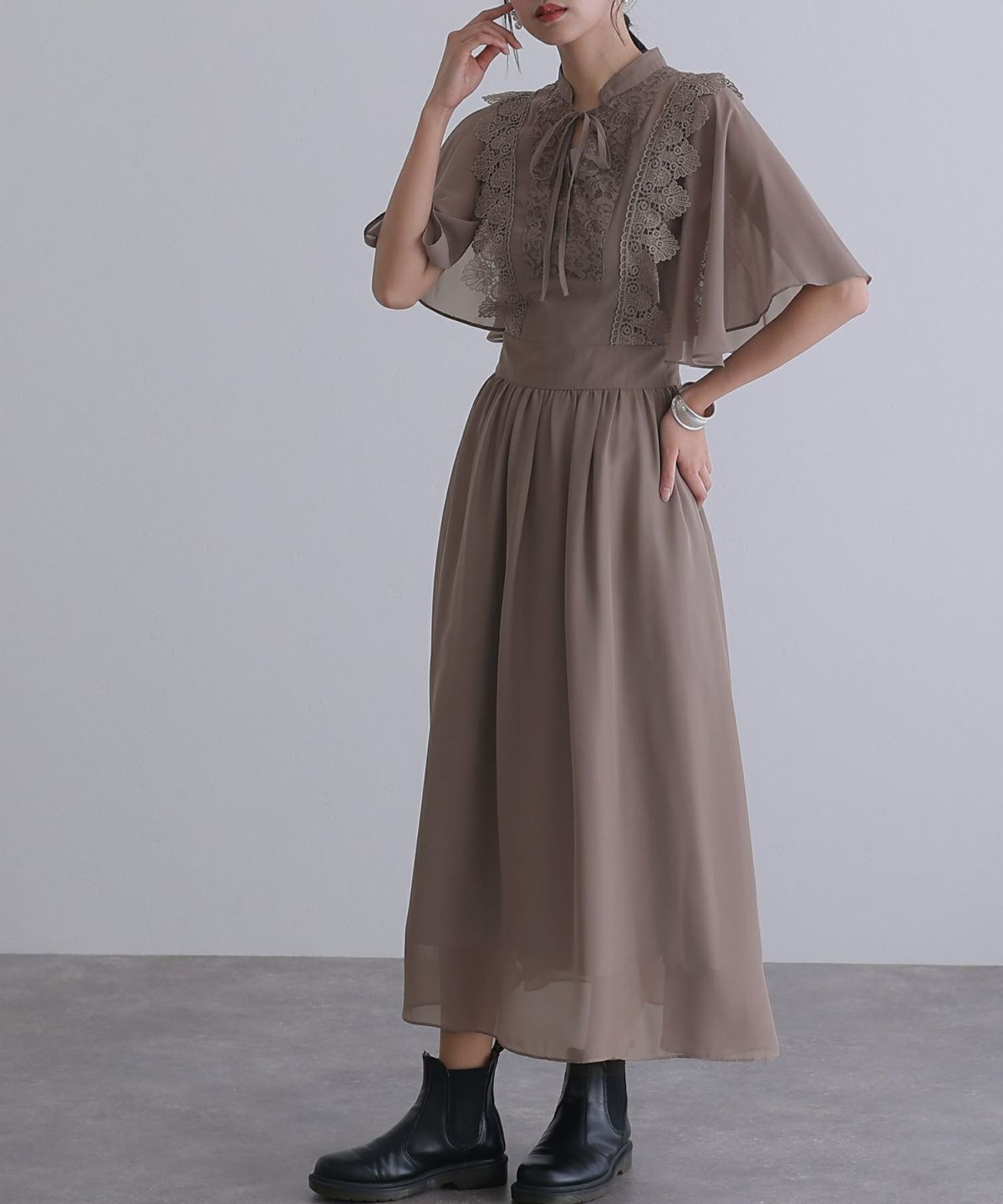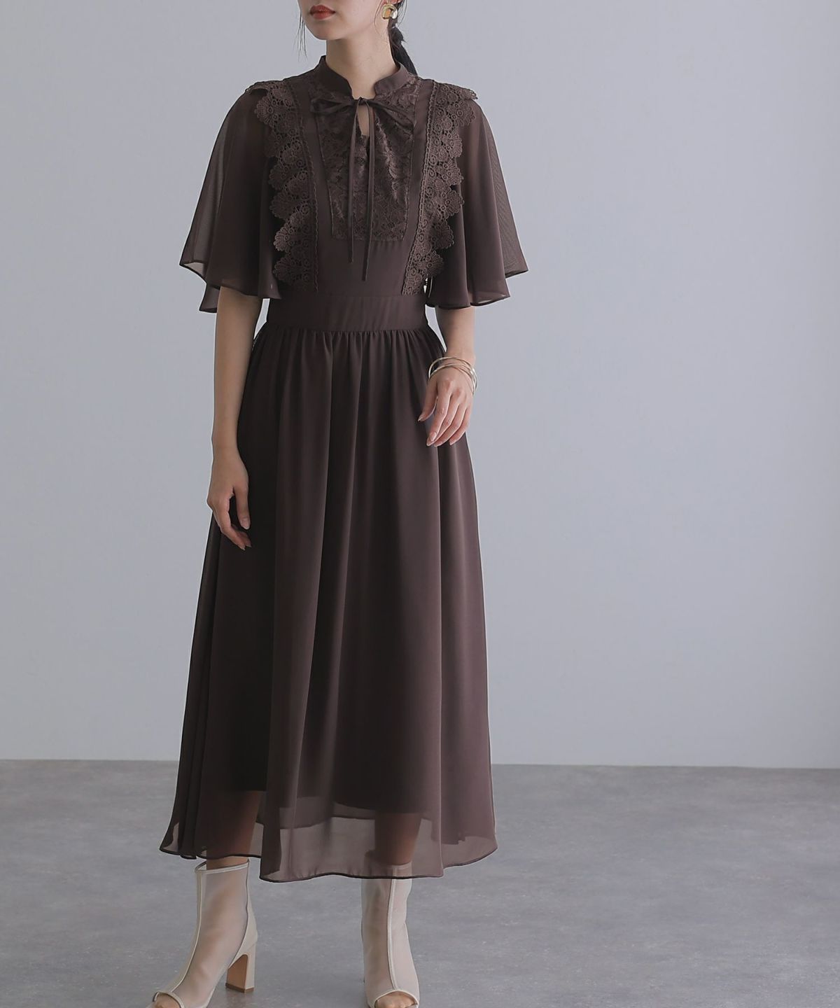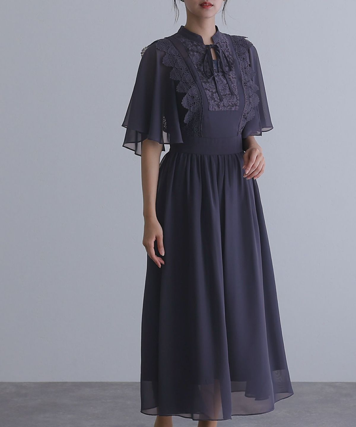 ■ケープカラー×シフォン総シフォンなので着心地も軽やかで裾の広がりも綺麗なドレスです。胸元のリボンでさらに可愛らしさアップ。肩部分のケミカルレースが華やかで、周りと差を付けたい方におすすめ。オケージョンや女子会など様々なシーンでお使いいただけます。
