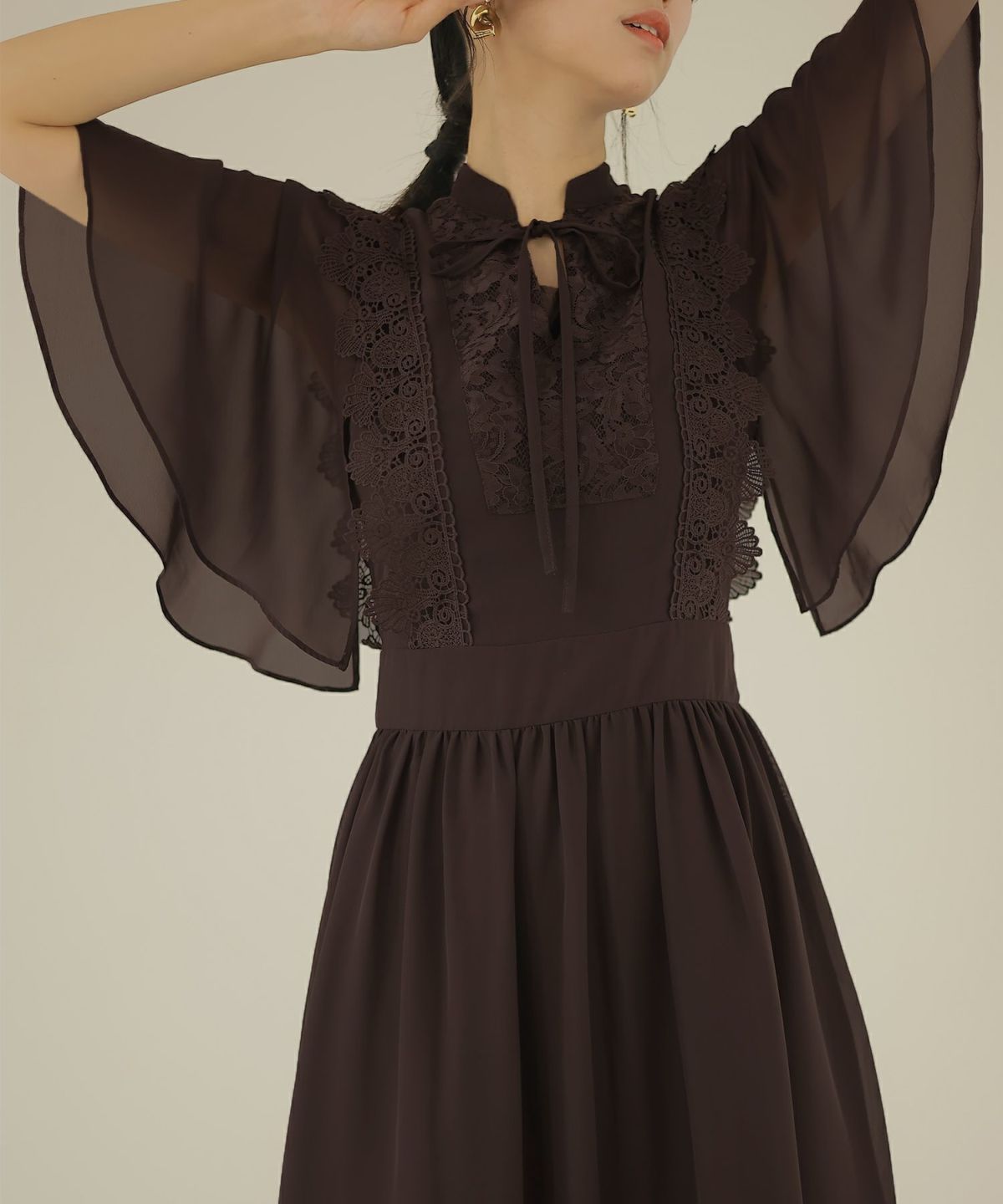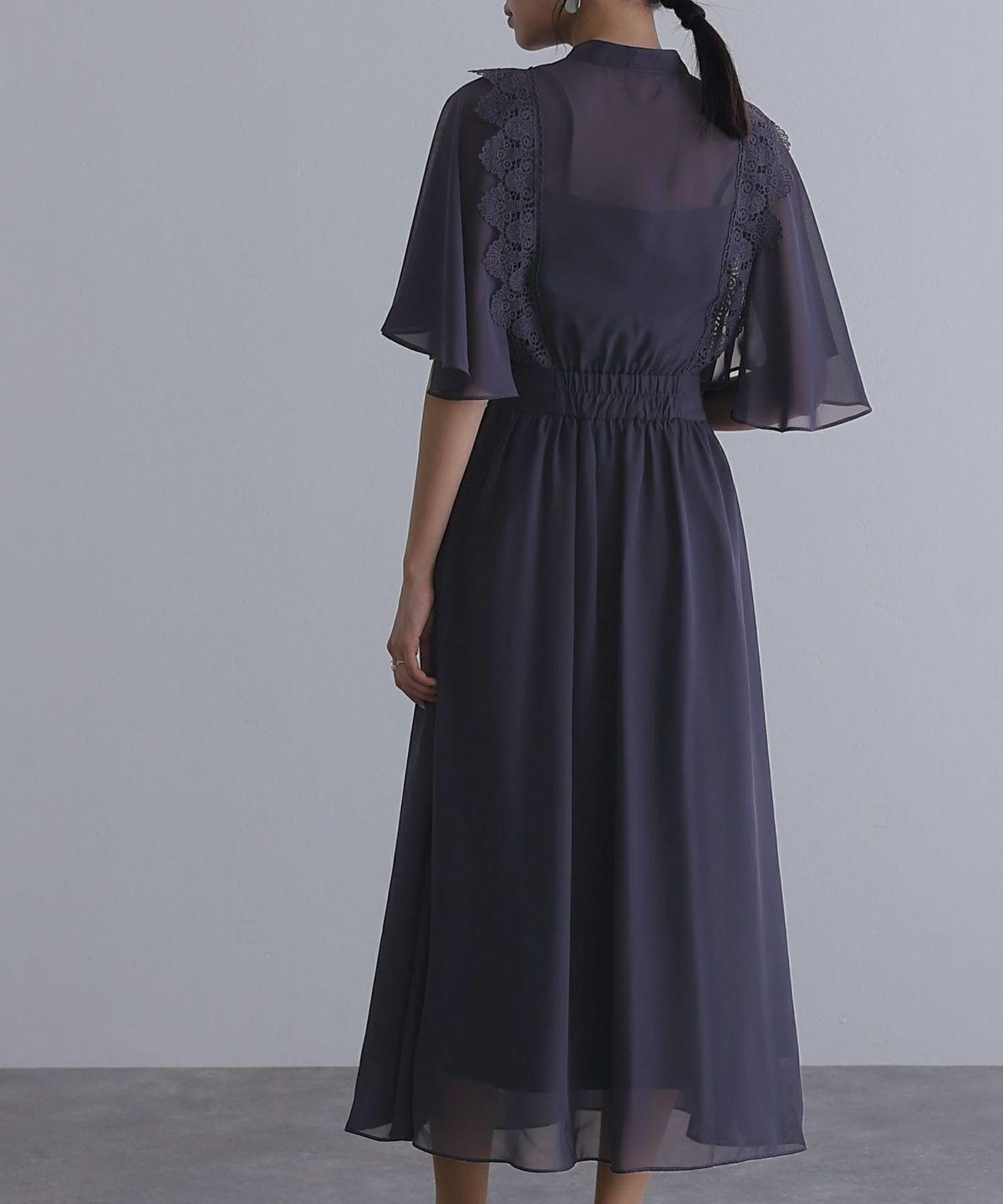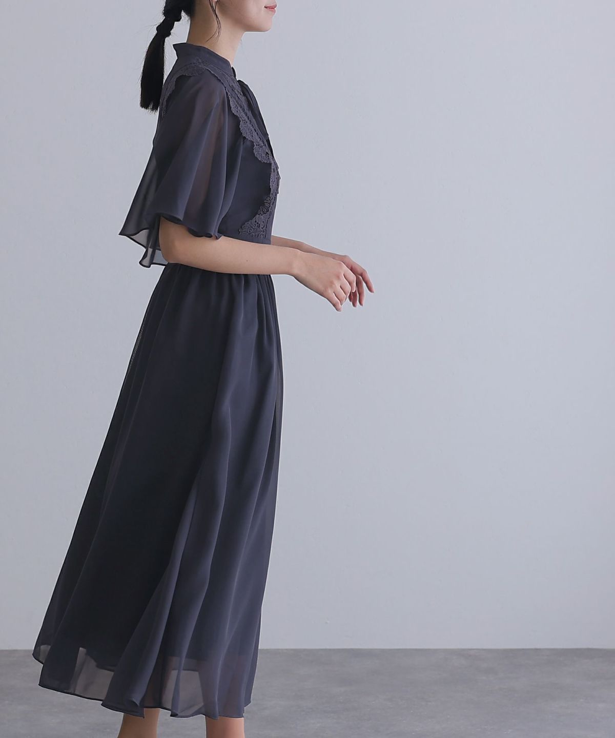 ■ケープカラー×シフォン総シフォンなので着心地も軽やかで裾の広がりも綺麗なドレスです。胸元のリボンでさらに可愛らしさアップ。肩部分のケミカルレースが華やかで、周りと差を付けたい方におすすめ。オケージョンや女子会など様々なシーンでお使いいただけます。