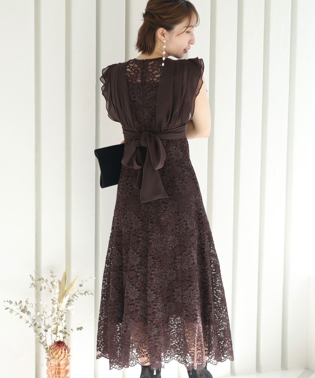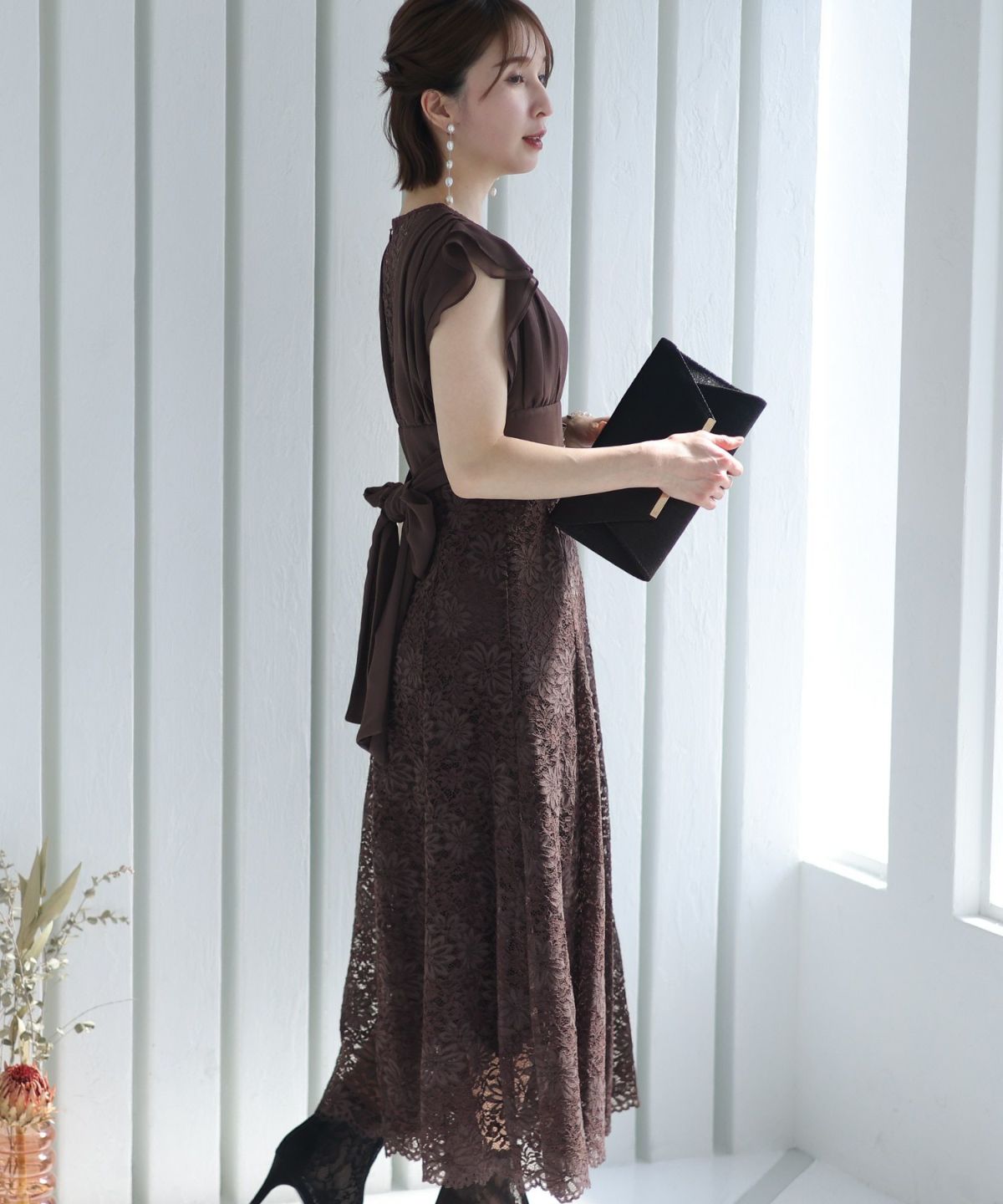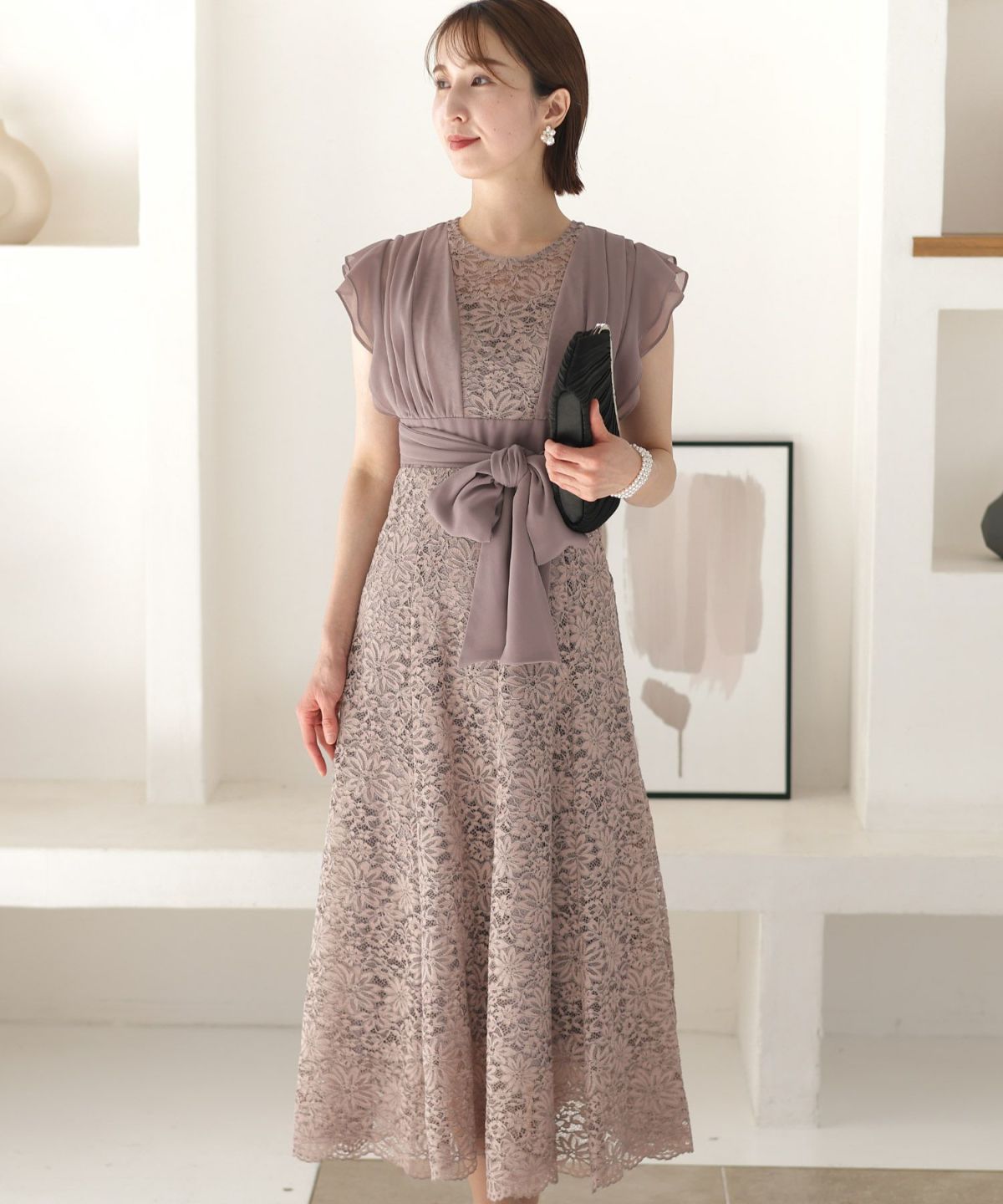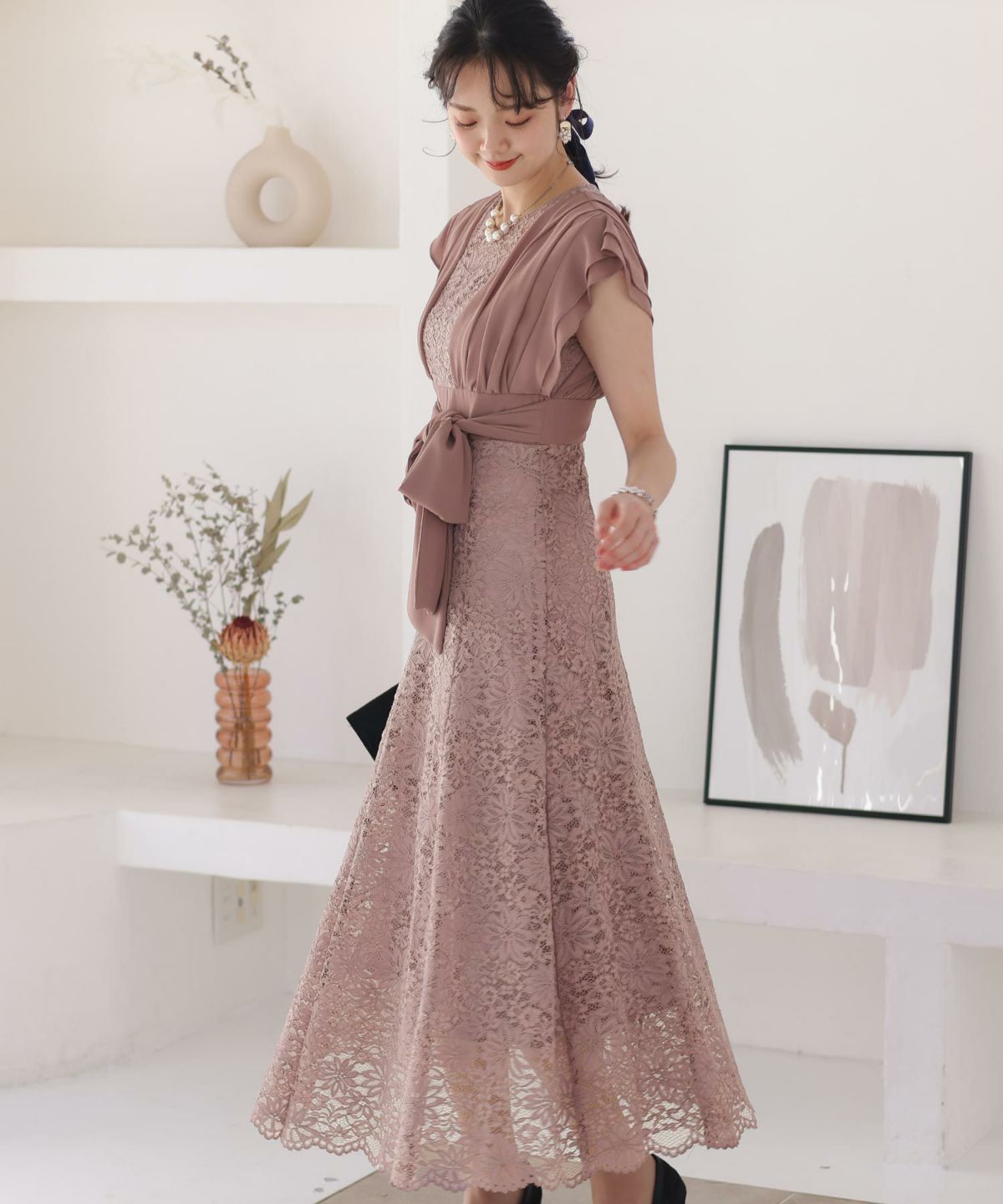 ■花柄レースが華やかで女性らしい体型カバーポイント:【脚】【ウエスト】【ヒップ】フレンチスリーブ丈ですがシフォンのふわっと感が気になる肩周りをカバー。太目のウエストマークでスタイルアップ効果も。