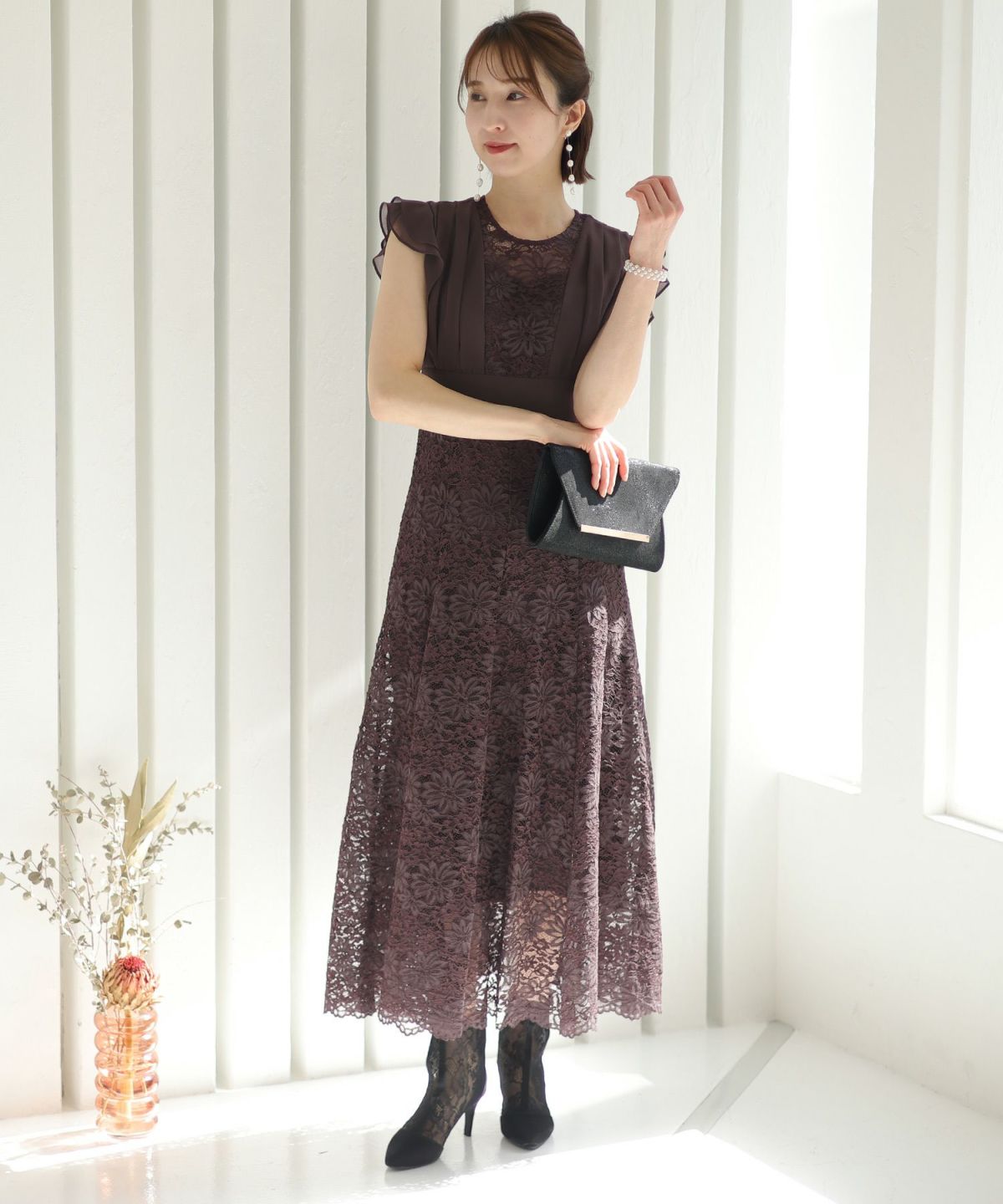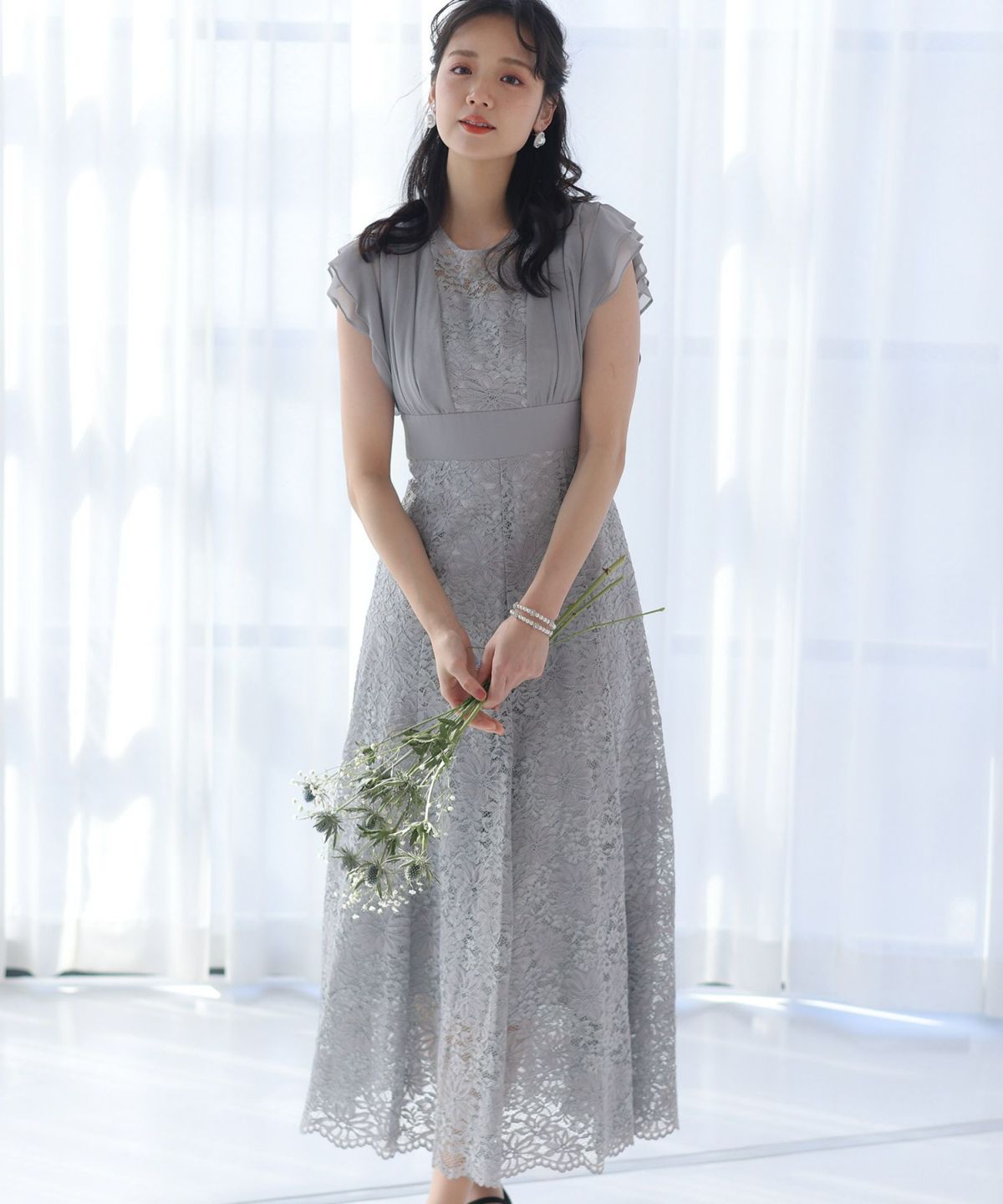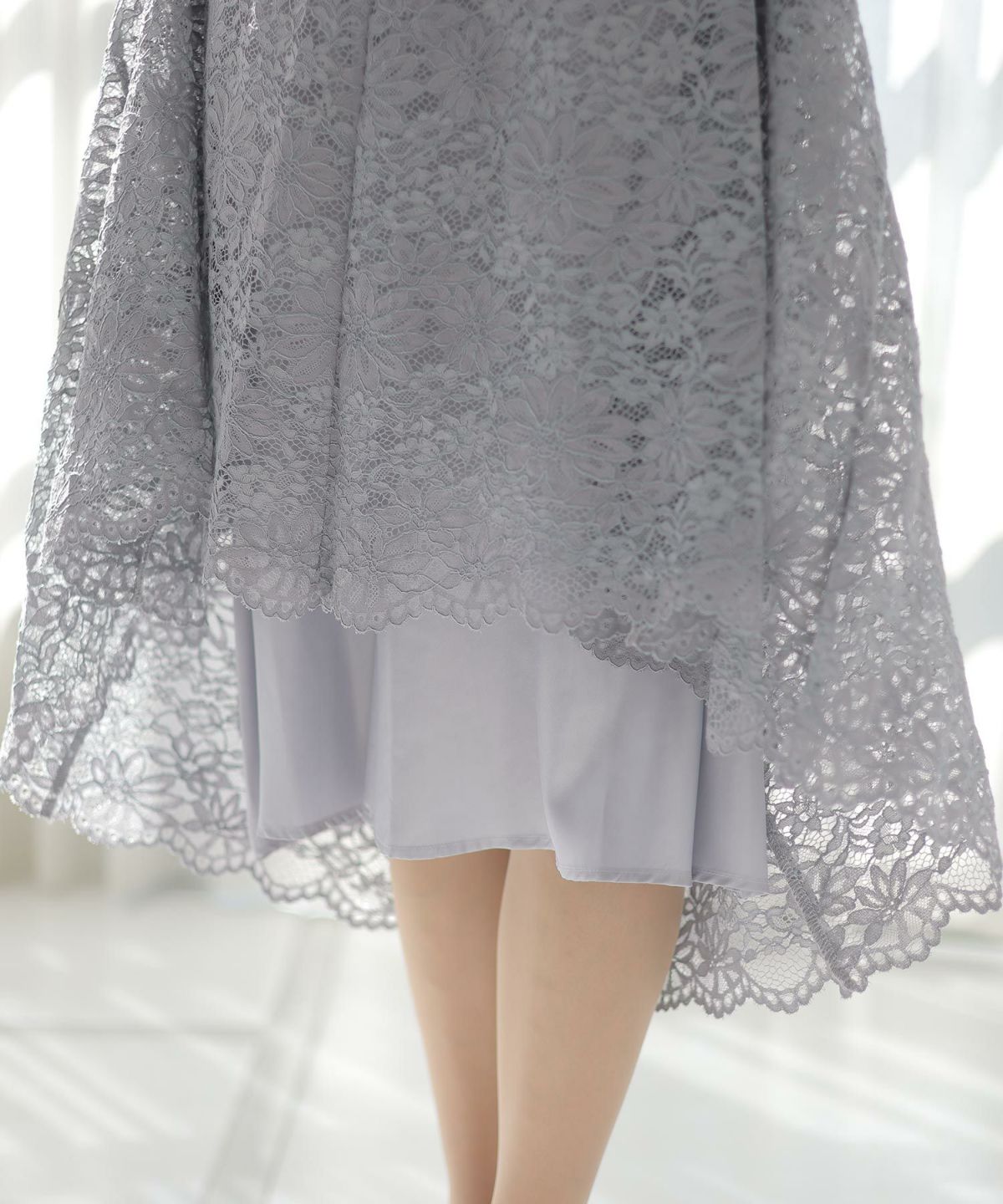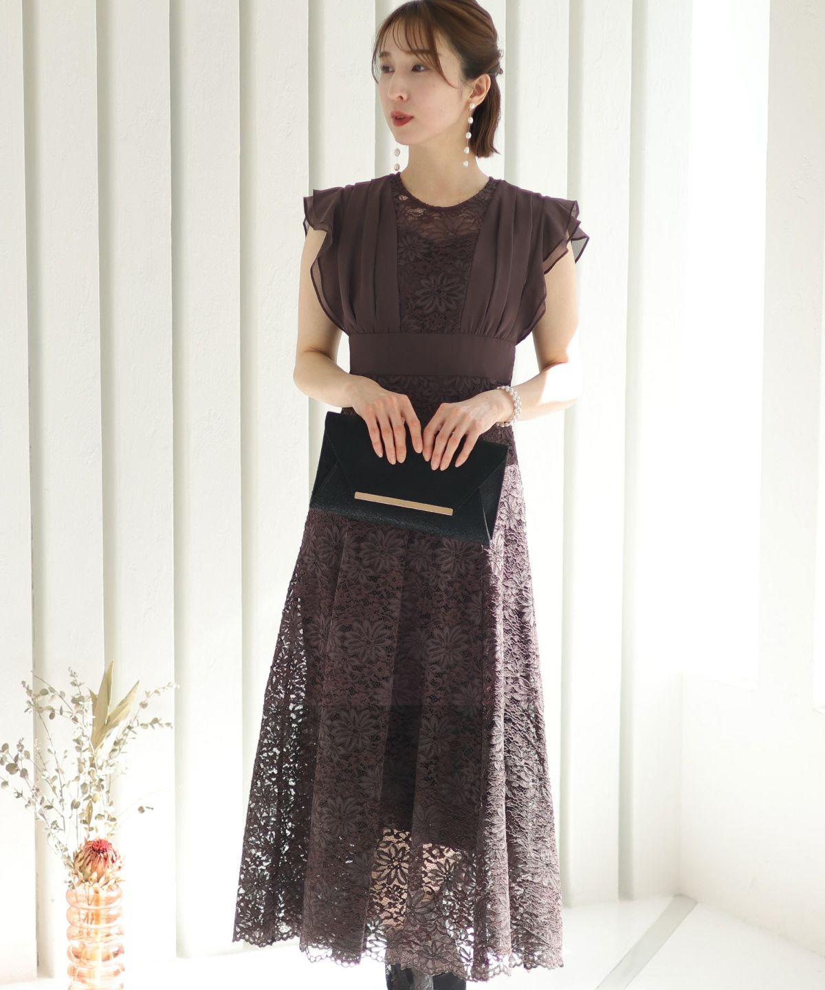 ■花柄レースが華やかで女性らしい体型カバーポイント:【脚】【ウエスト】【ヒップ】フレンチスリーブ丈ですがシフォンのふわっと感が気になる肩周りをカバー。太目のウエストマークでスタイルアップ効果も。