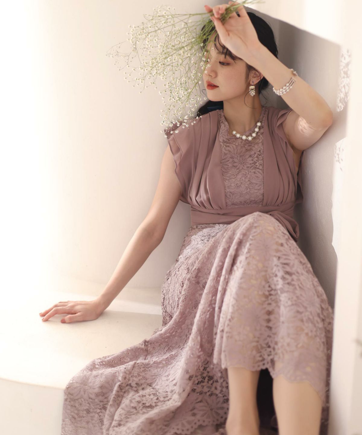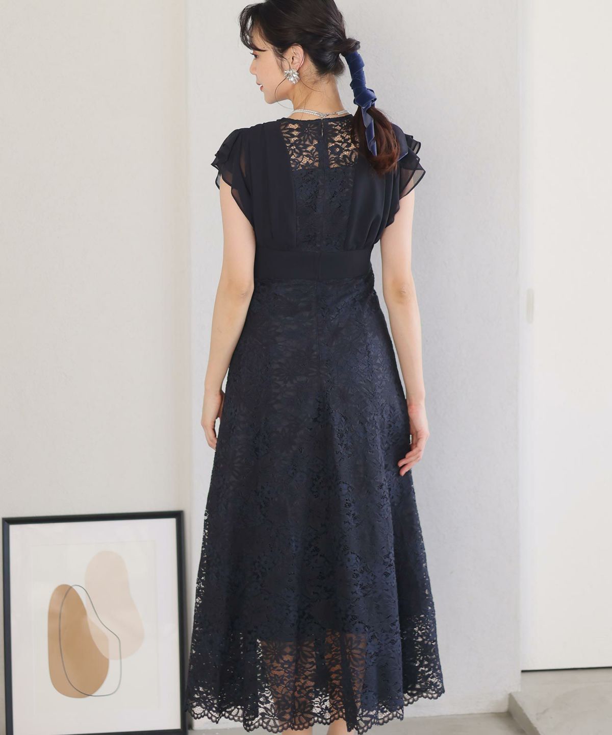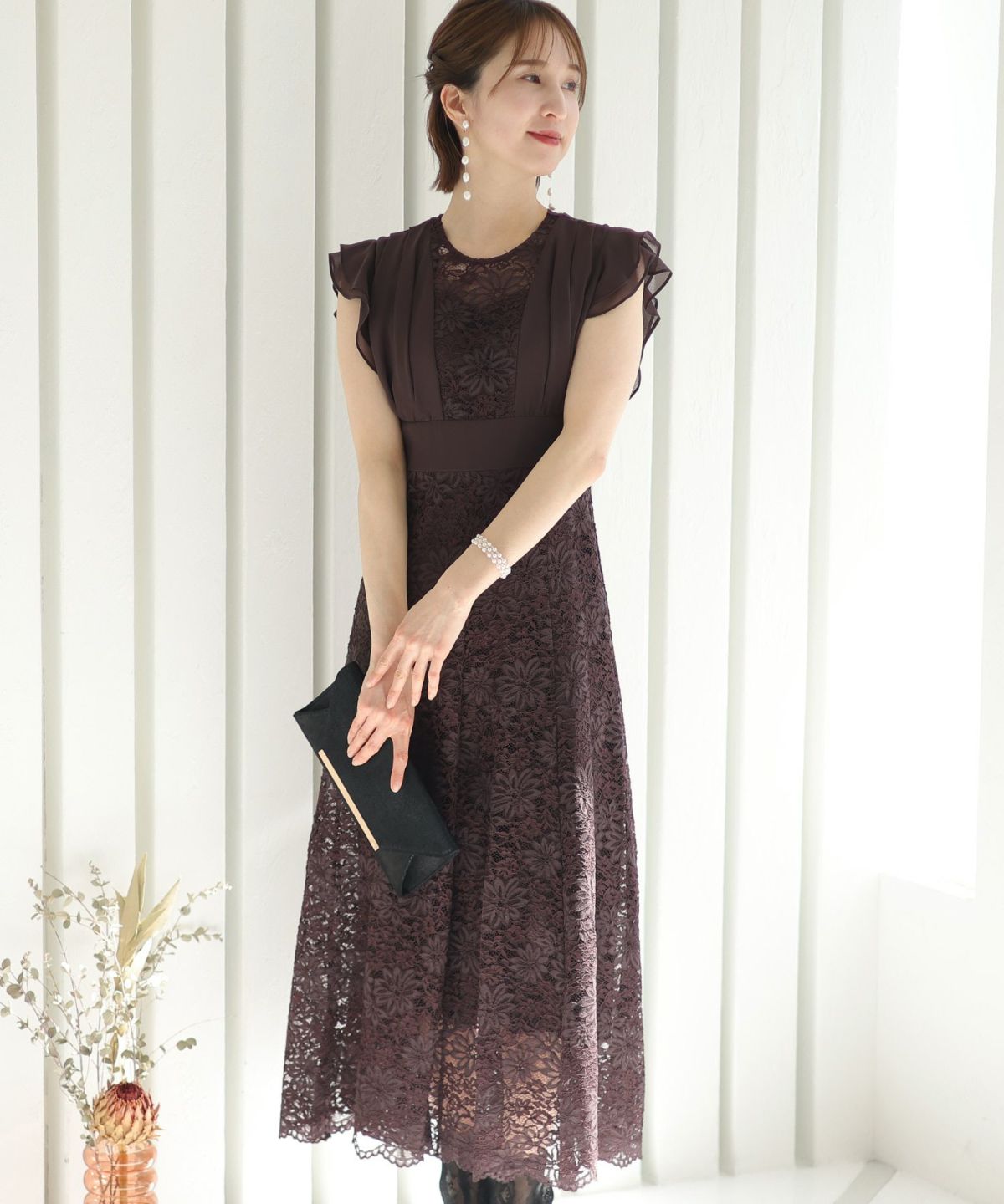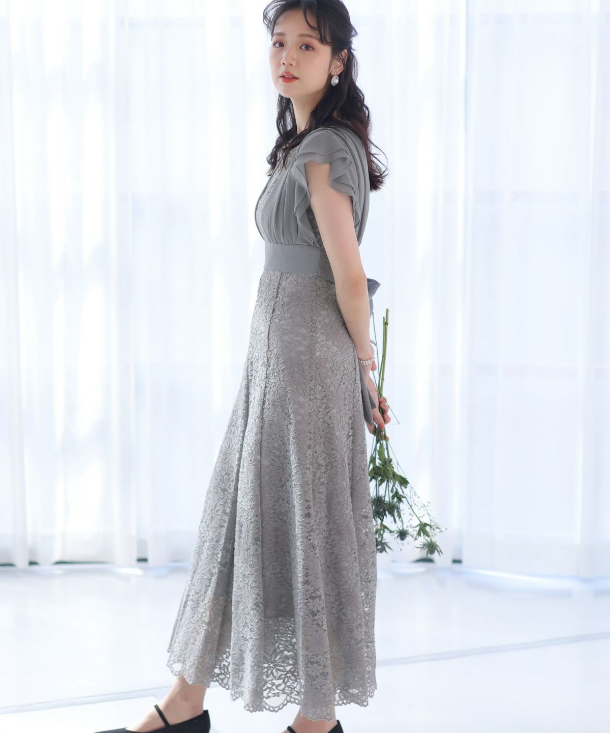 ■花柄レースが華やかで女性らしい体型カバーポイント:【脚】【ウエスト】【ヒップ】フレンチスリーブ丈ですがシフォンのふわっと感が気になる肩周りをカバー。太目のウエストマークでスタイルアップ効果も。
