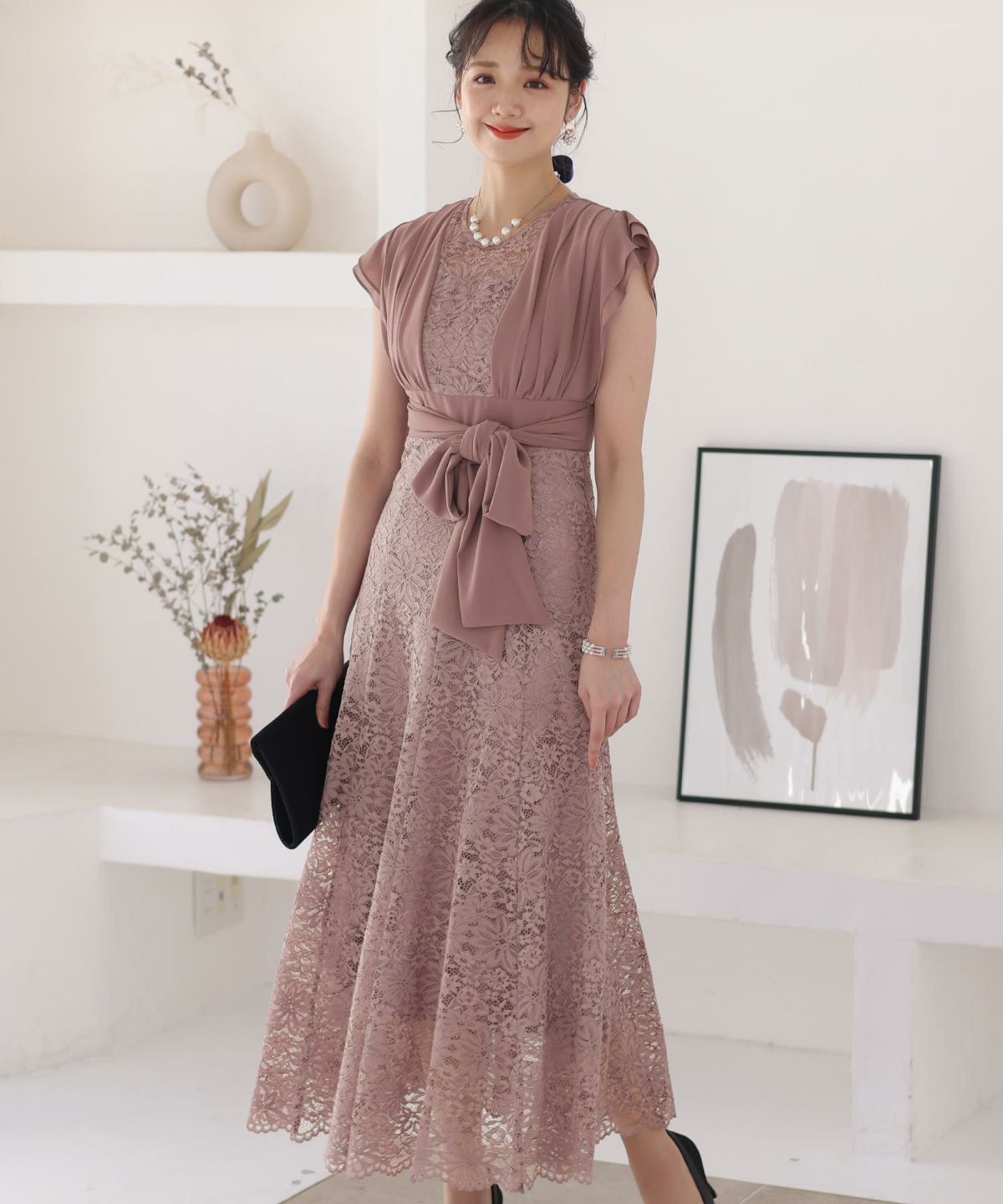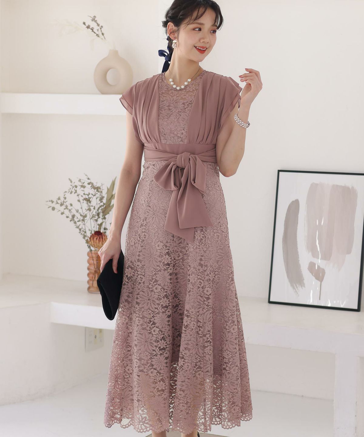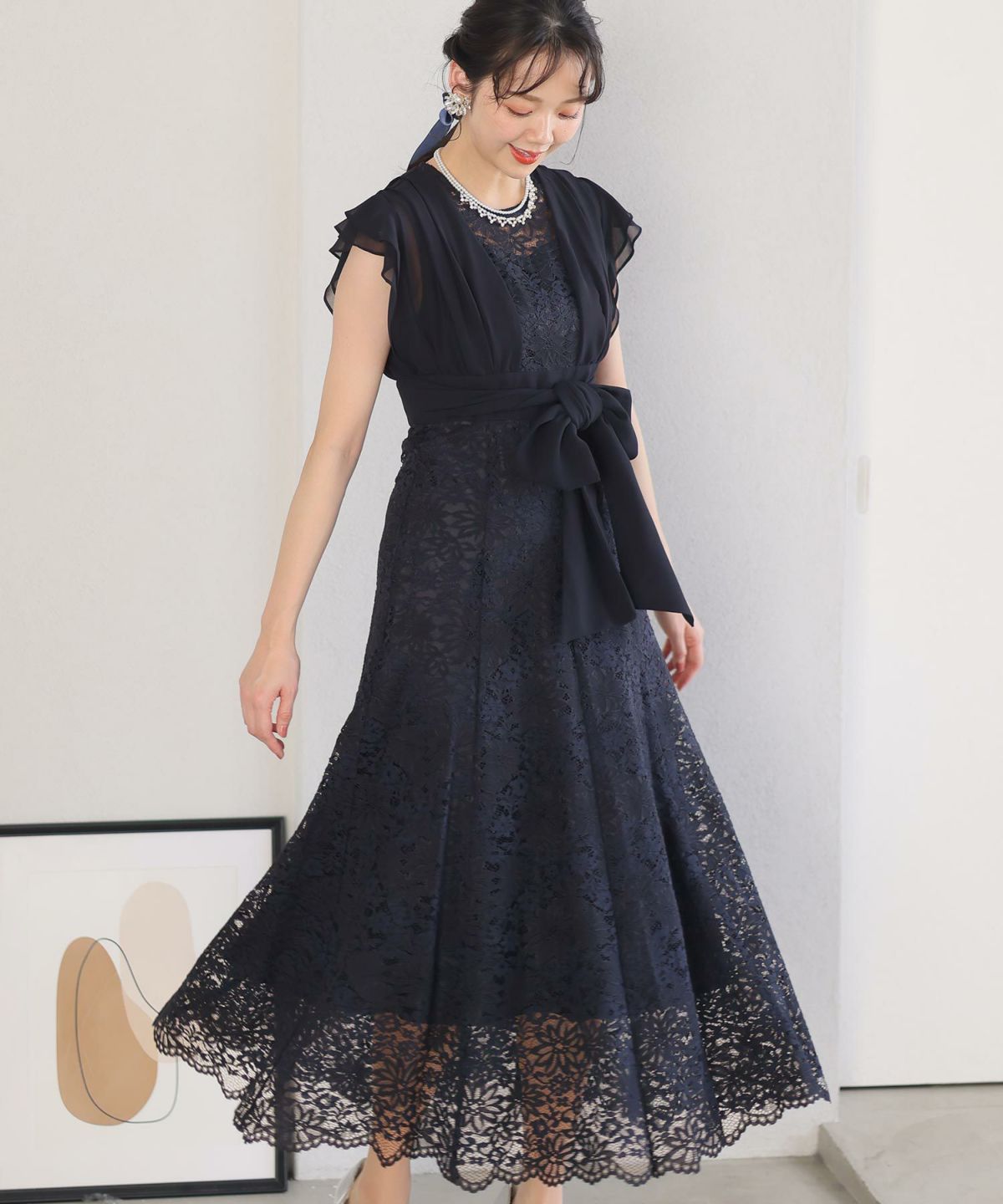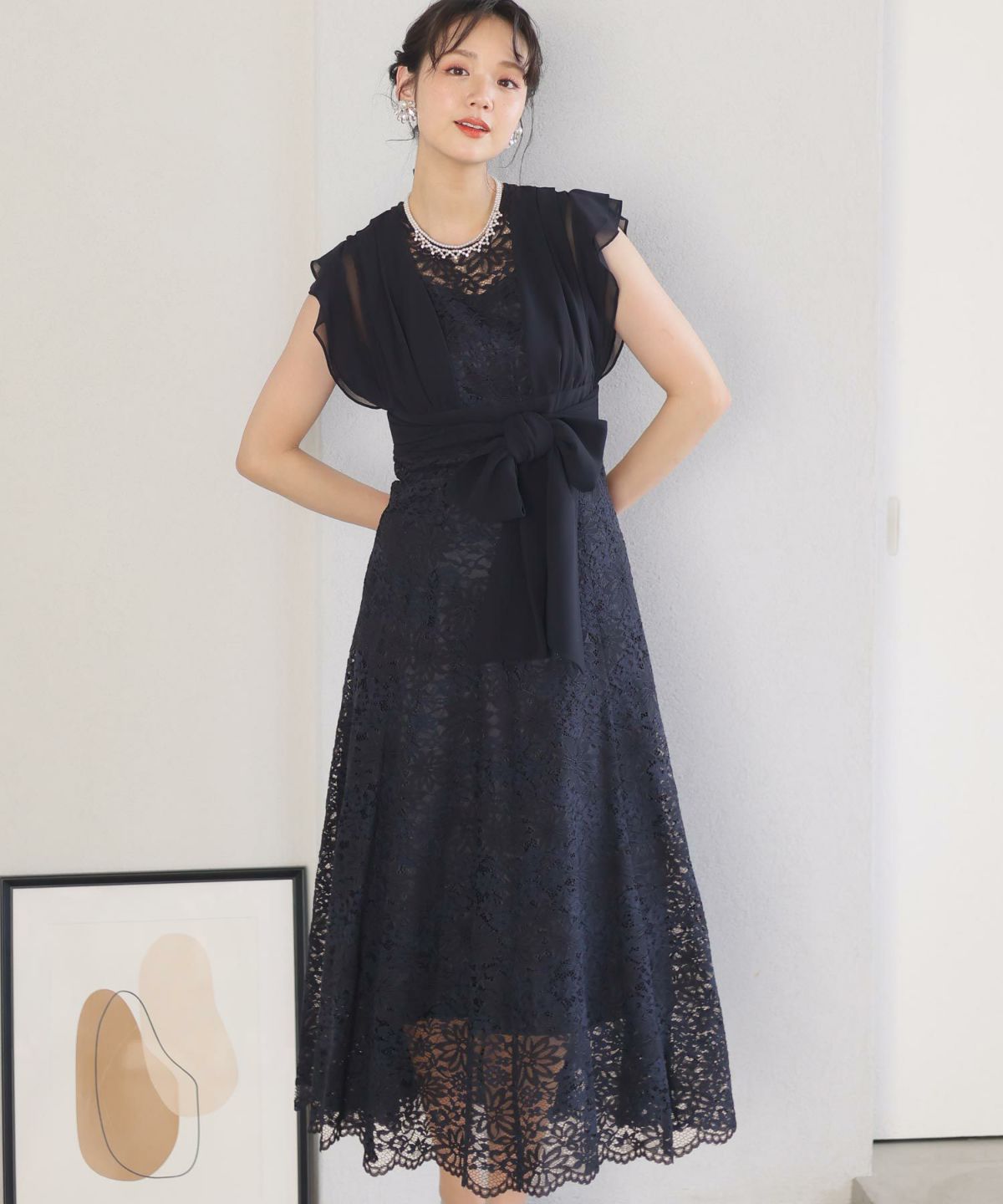 ■フレンチスリーブ×シフォン大振りのシフォンリボンのついたレースワンピースです。ひらひらとしたフレンチスリーブがポイント。リボンは前後どちらで結んでも可愛いデザイン。オケージョンシーンや特別なお食事会におすすめです。