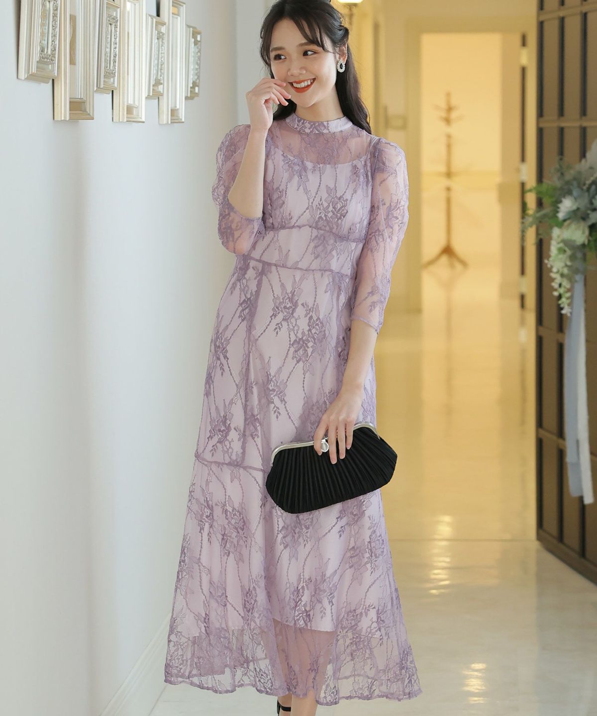 ■フラワーレース×バックリボン大ぶりのフラワー柄のレースが華やかなワンピースです。バックリボンで後ろ姿も可愛いアイテム。インナーワンピースとの配色がレースの繊細さを際立たせて上品な印象に。オケージョンはもちろん、特別な日のお食事会にもおすすめです。