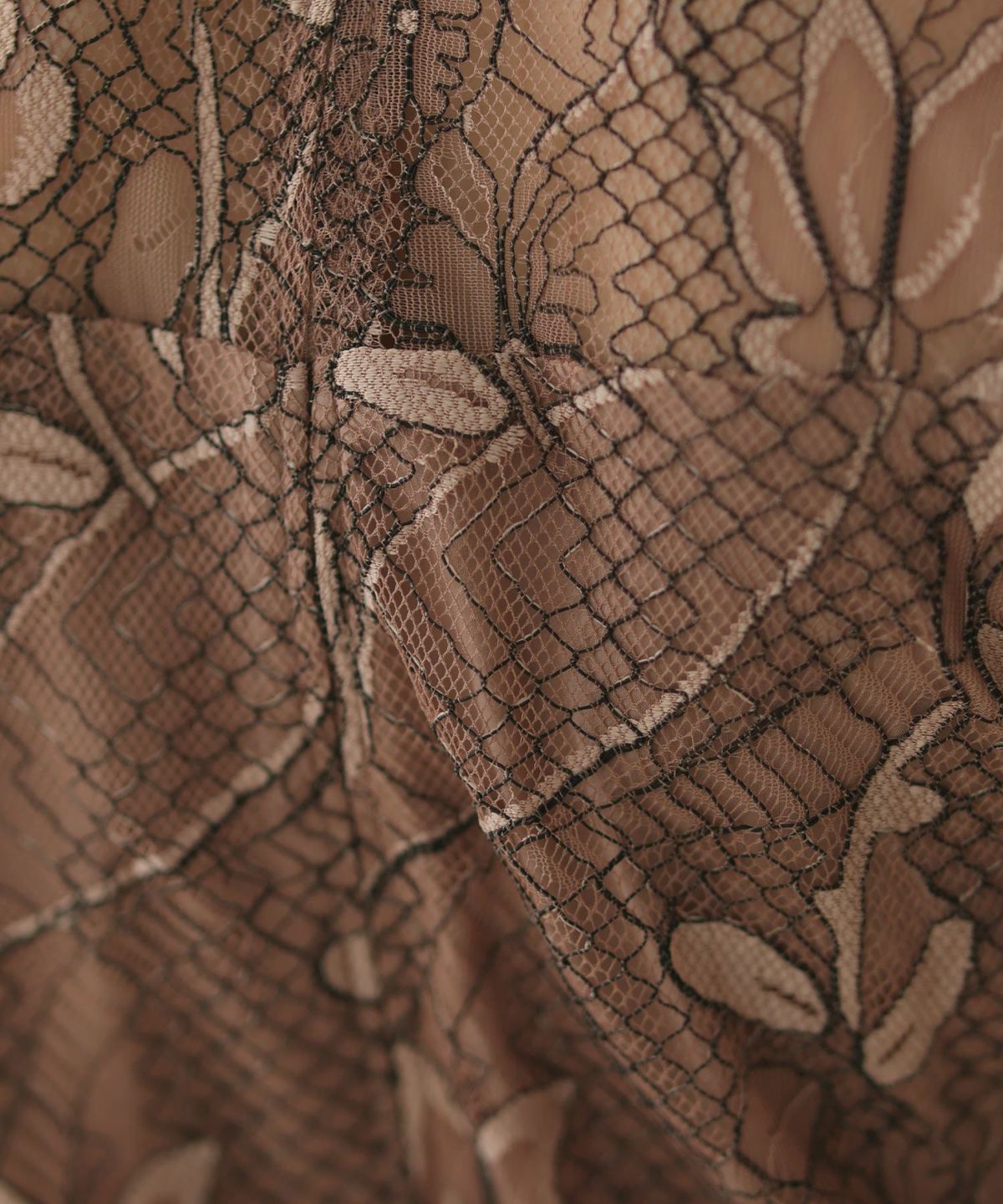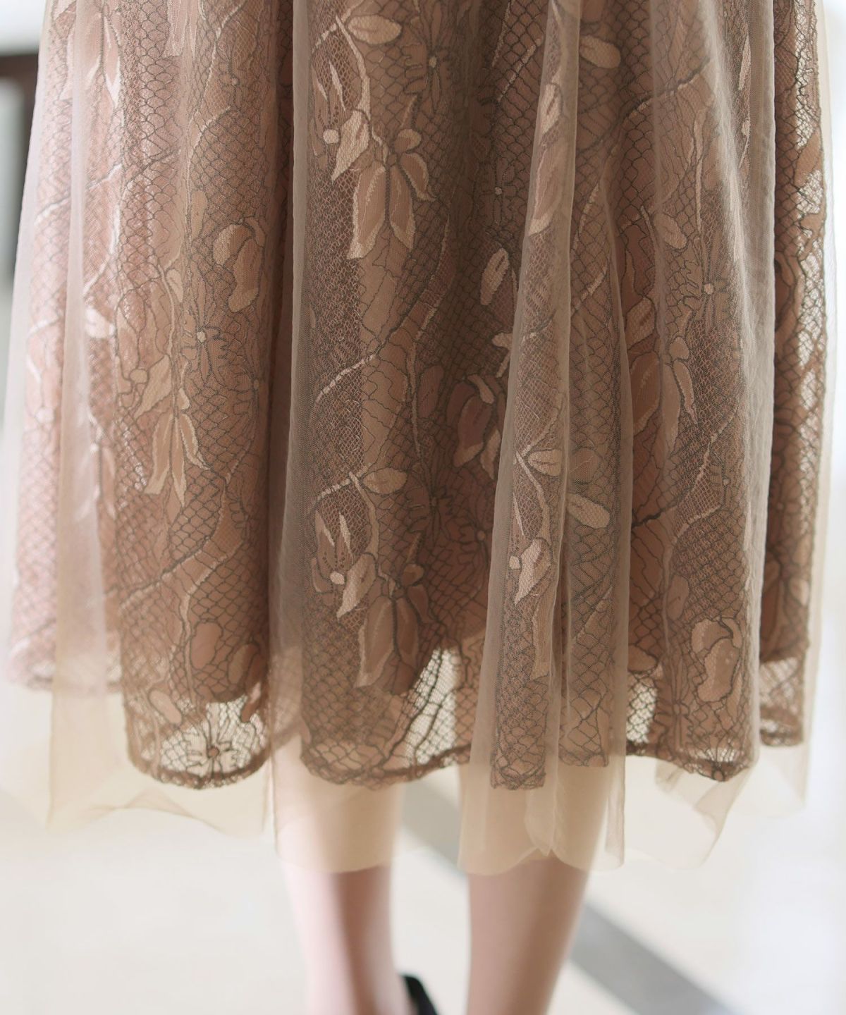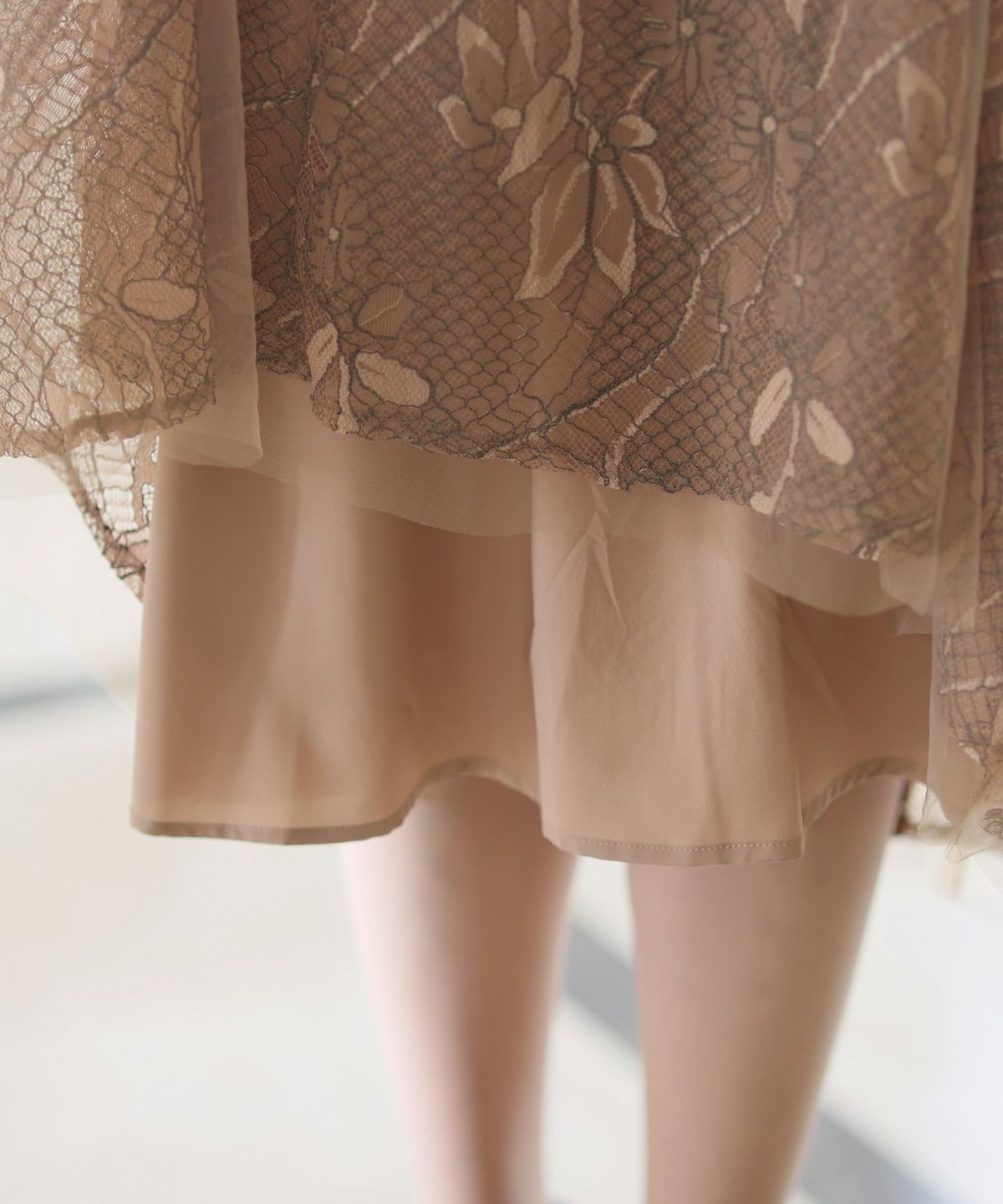 ■タイトめなAラインシルエットが女性らしい歩くとチュールレースがふんわりと広がって華やかさをプラスします。