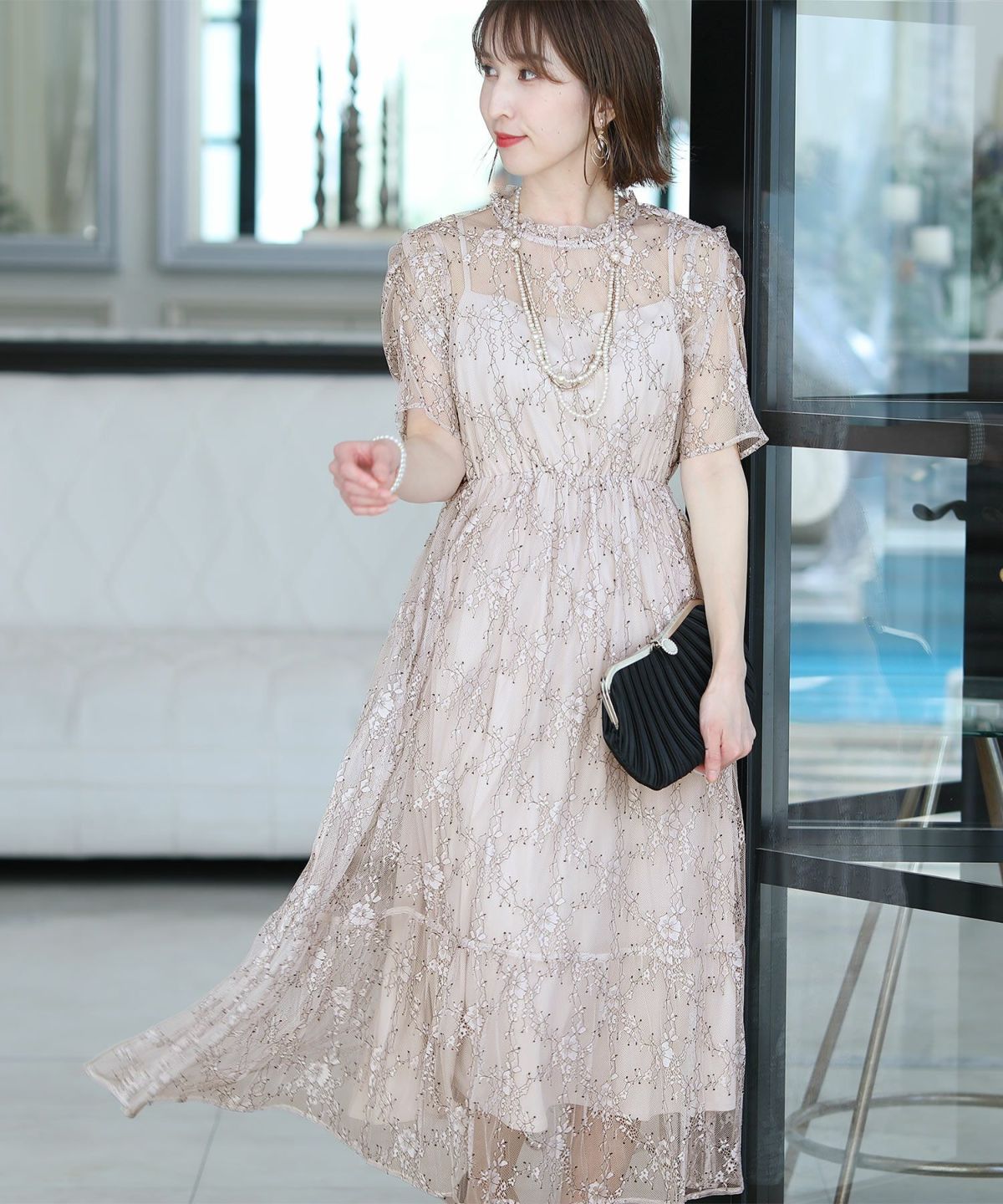 黒縁取りレースとロング丈のデザインが大人可愛いを叶えます。シアーな透け感が軽やか。1枚で着れてアウター要らず。