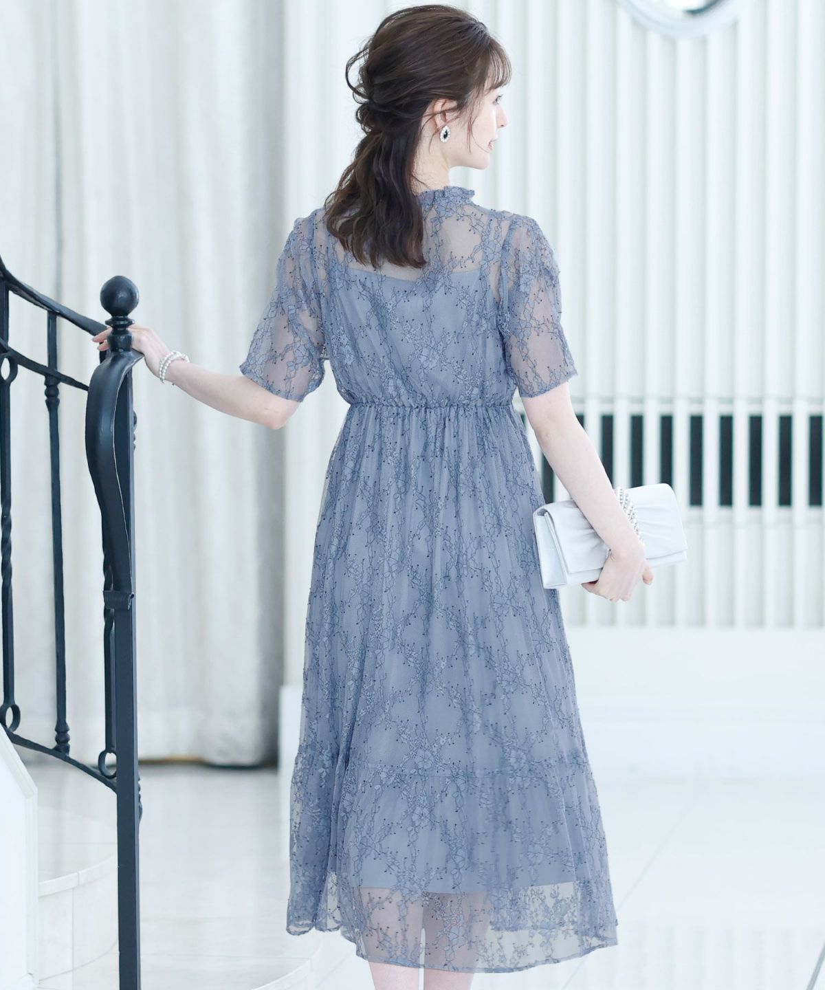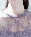少し高めのネックとフリルで首長効果。アクセサリーなしでも華やかな印象に。首後ろはくるみボタン仕様で、細部までこだわりが詰まっています。