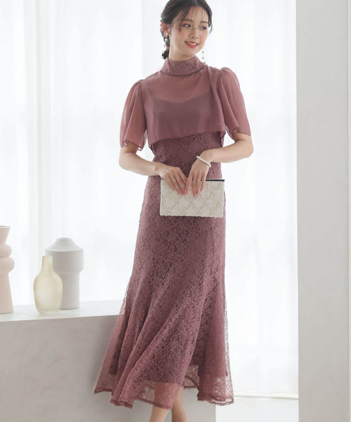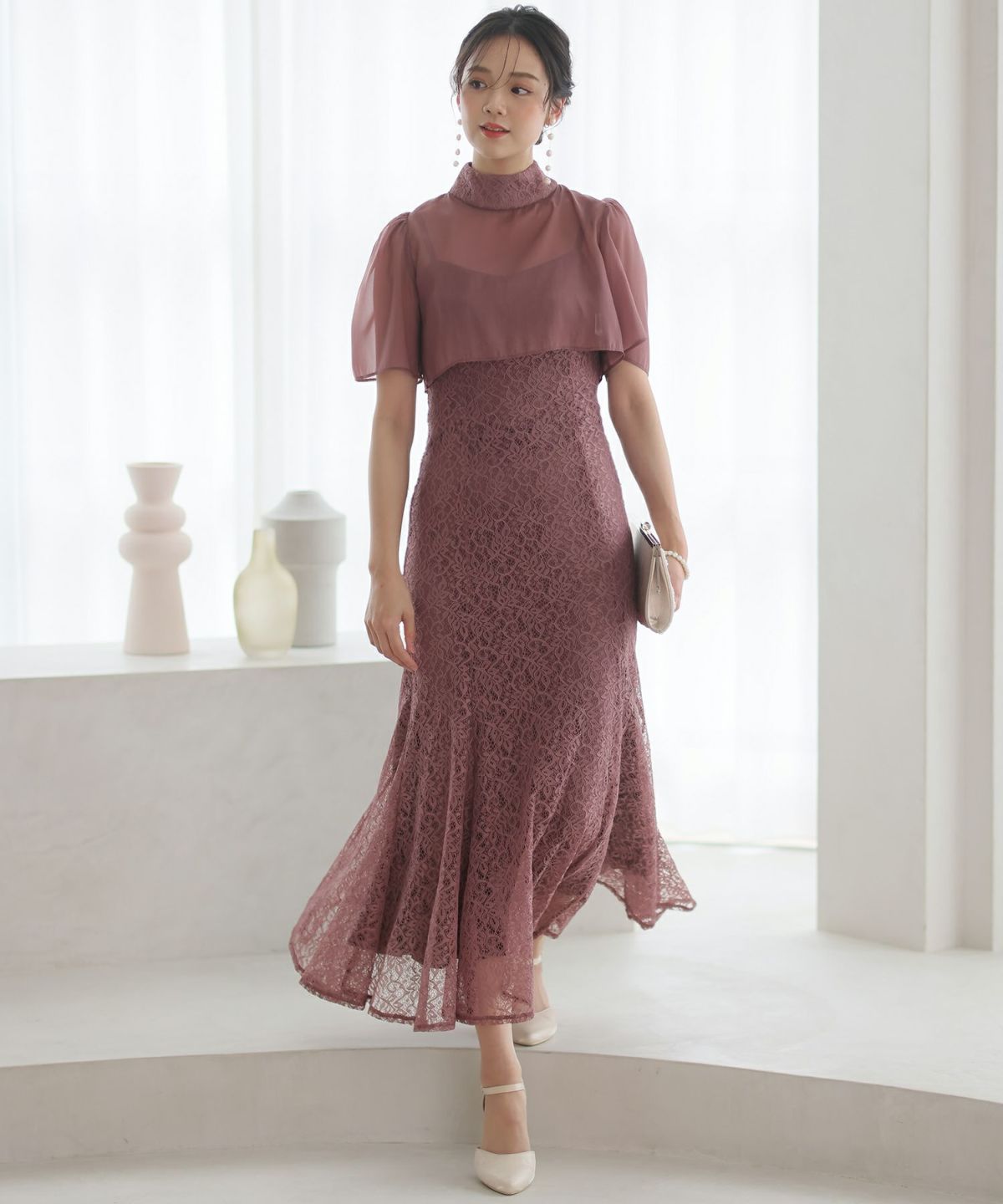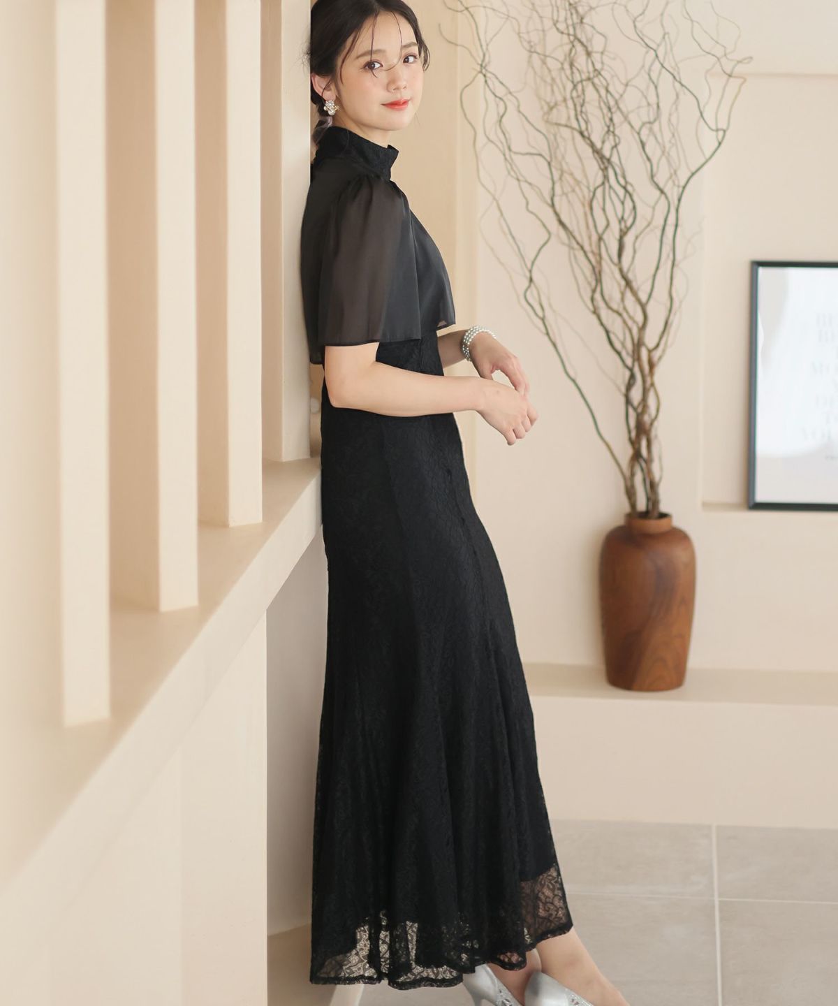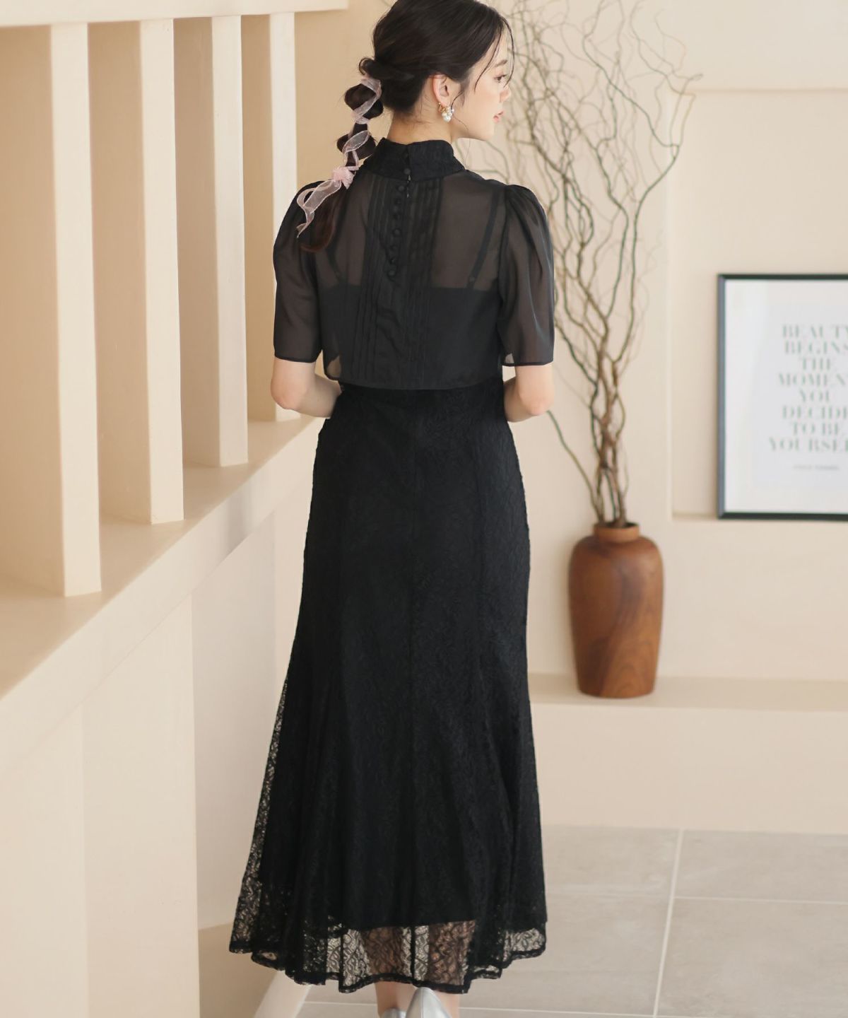 ■キャミワンピースは総レースで女性らしいシルエット体型カバーポイント:【二の腕】【脚】【ウエスト】【ヒップ】ショート丈ブラウスでスタイルアップ効果もハイネックデザインが顔周りを美しく見せてくれます