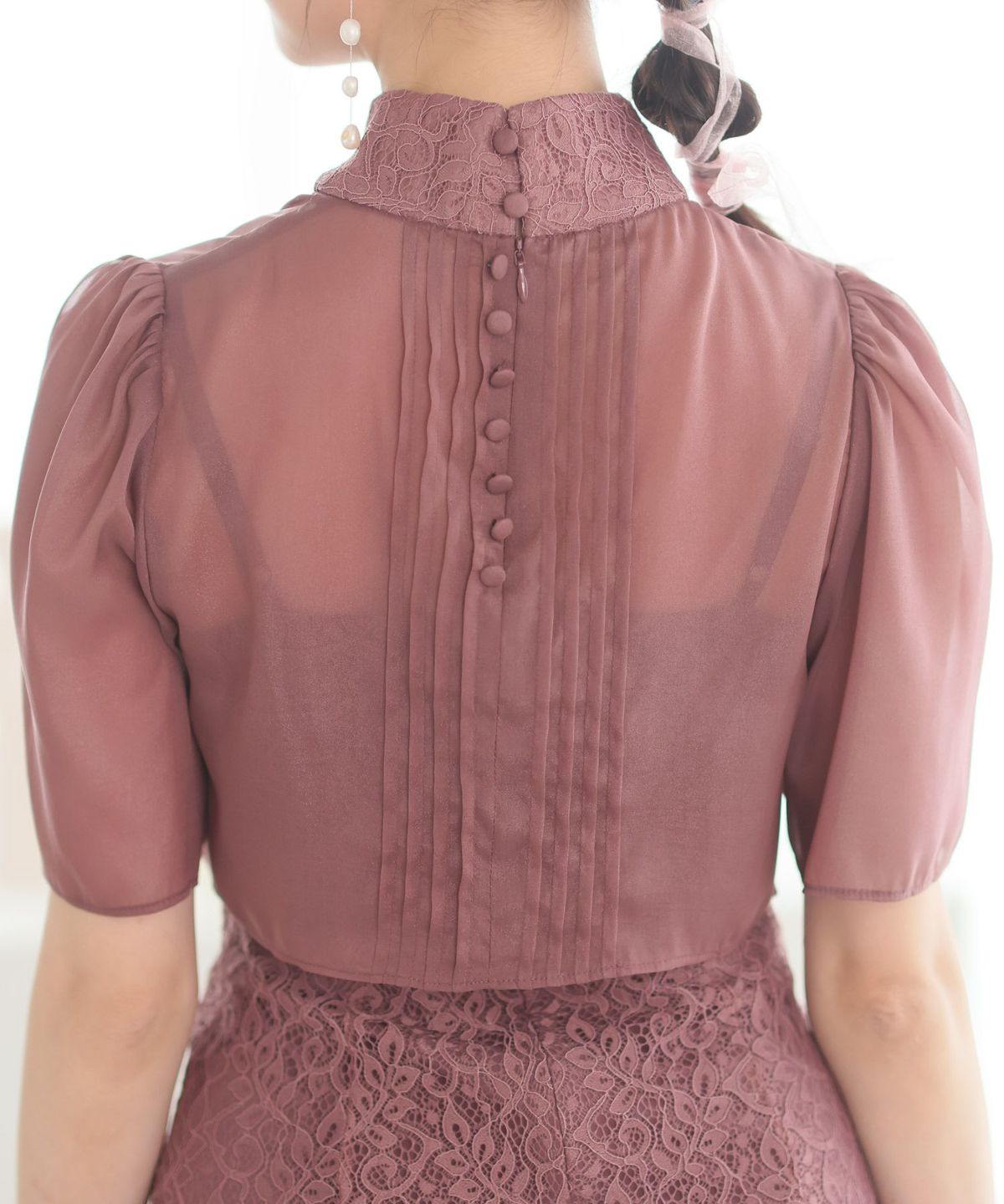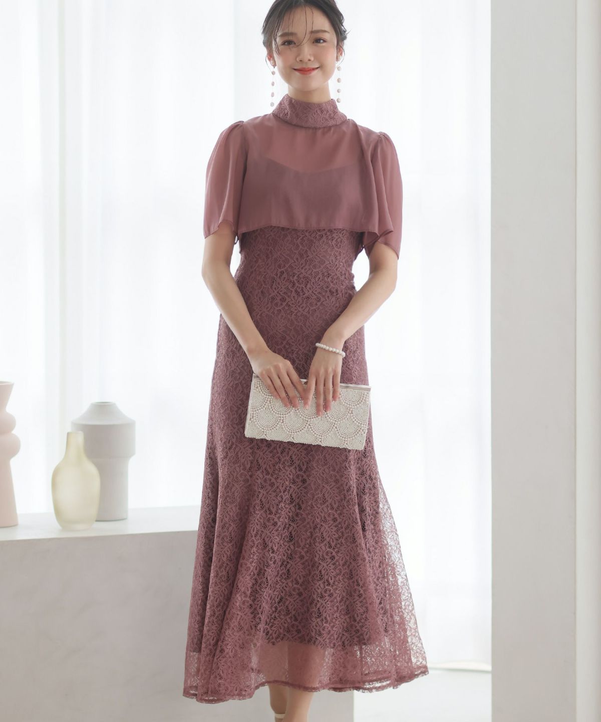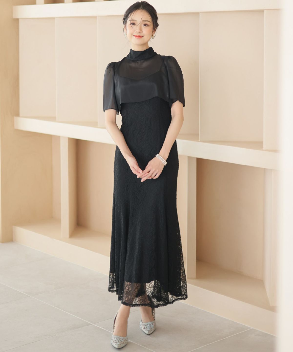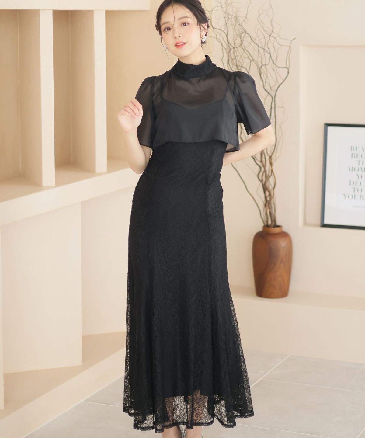 ■キャミワンピースは総レースで女性らしいシルエット体型カバーポイント:【二の腕】【脚】【ウエスト】【ヒップ】ショート丈ブラウスでスタイルアップ効果もハイネックデザインが顔周りを美しく見せてくれます