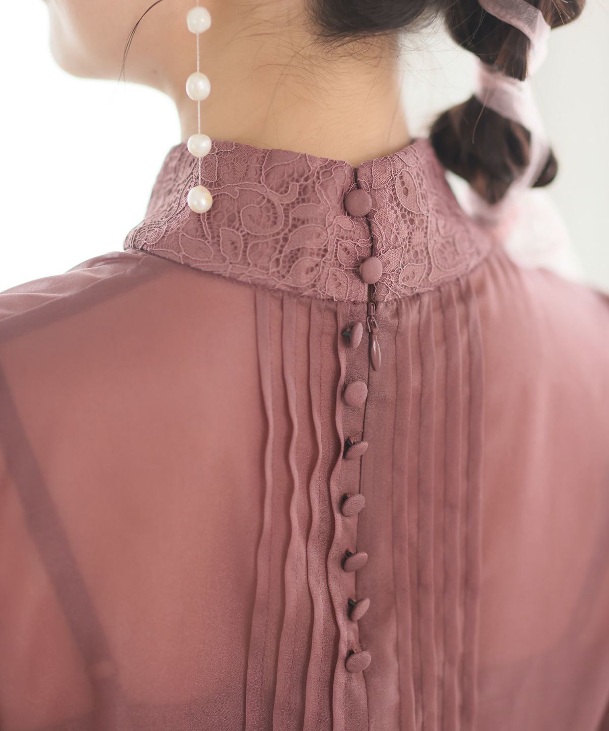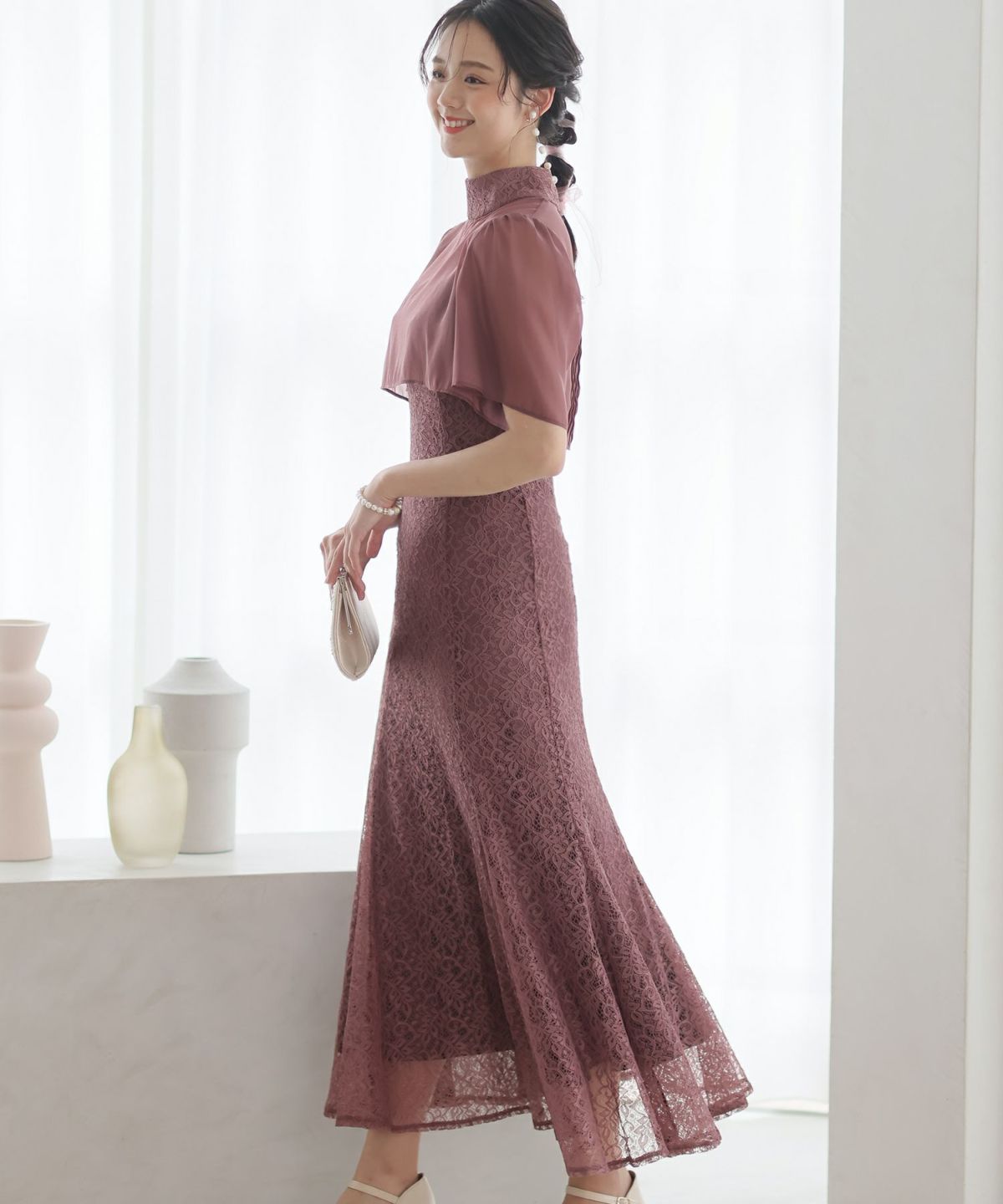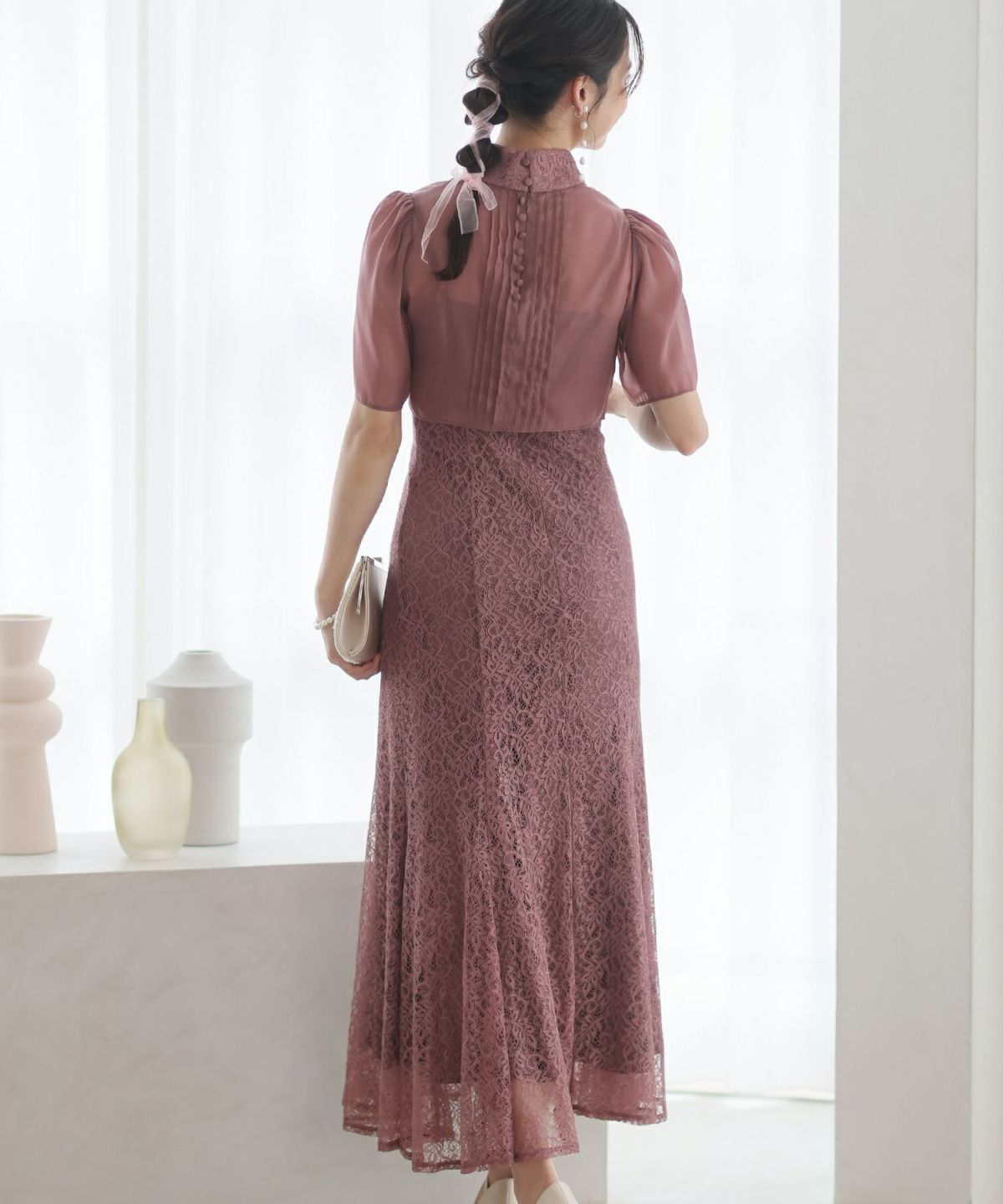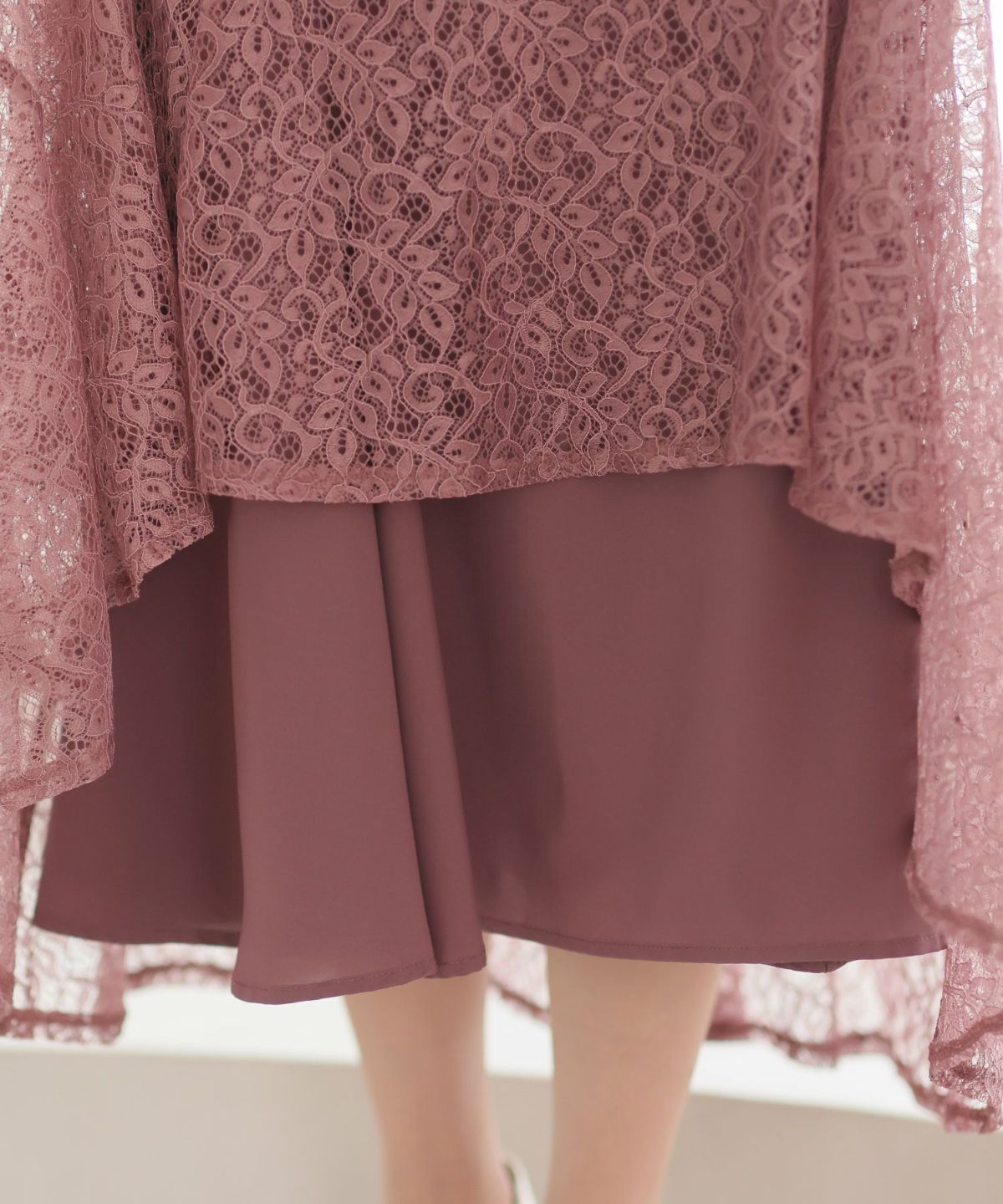 ■キャミワンピースは総レースで女性らしいシルエット体型カバーポイント:【二の腕】【脚】【ウエスト】【ヒップ】ショート丈ブラウスでスタイルアップ効果もハイネックデザインが顔周りを美しく見せてくれます