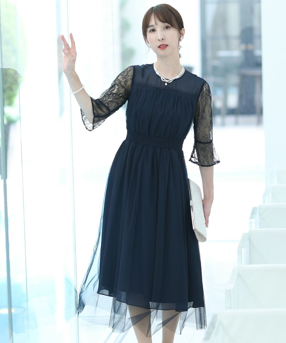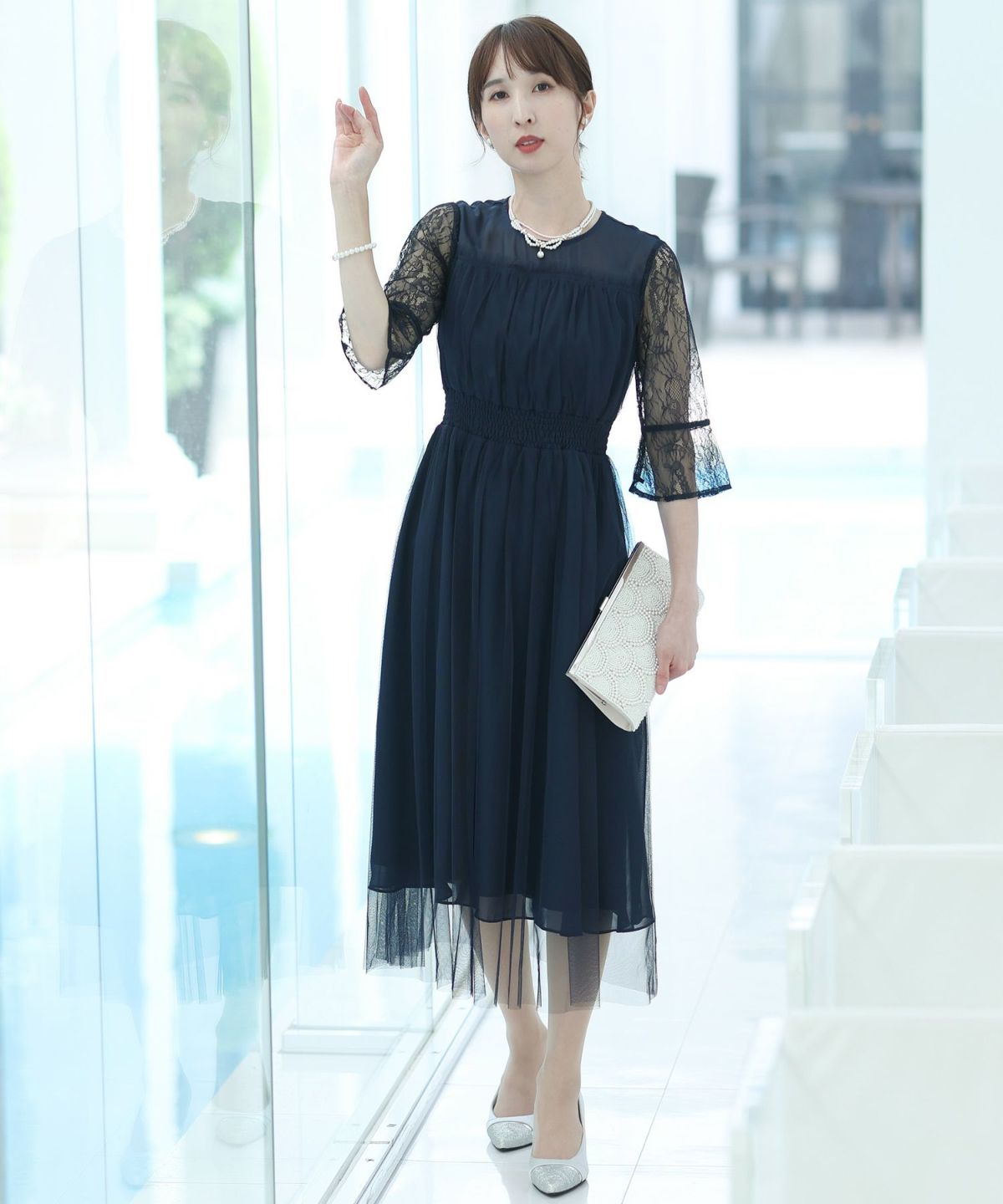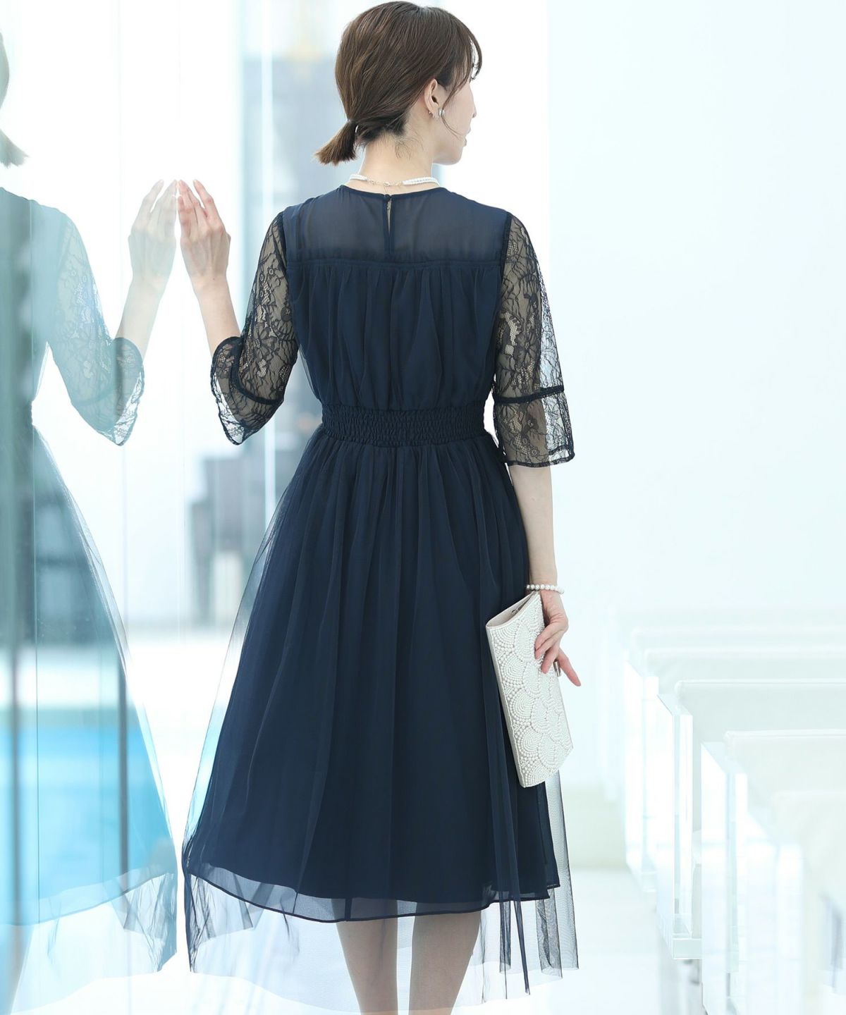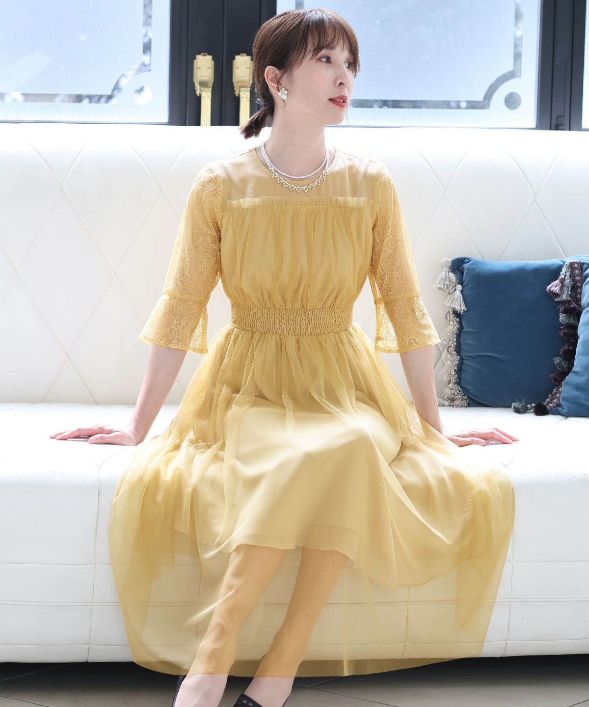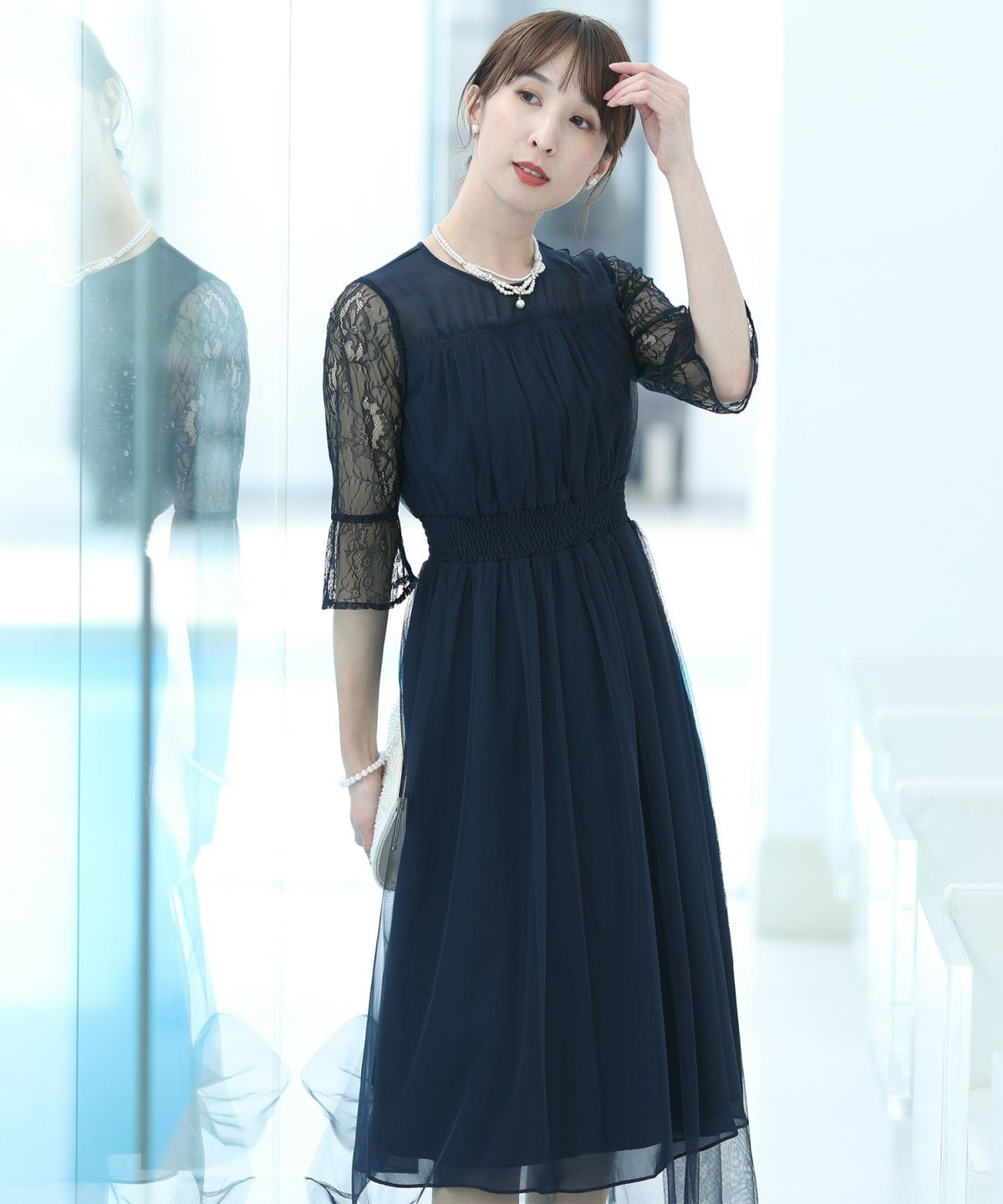 【二の腕】【脚】【ウエスト】【ヒップ】透け感のある5分袖のレースが気になる二の腕をさり気なくカバー。ウエスト位置も高く自然にスタイルアップしてくれます。
