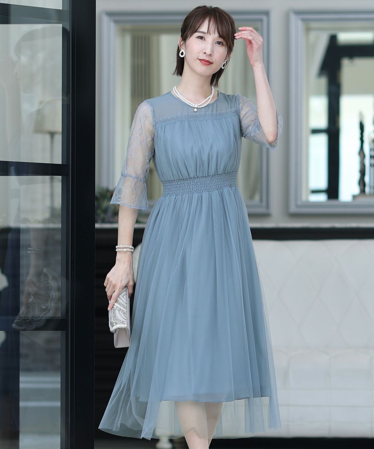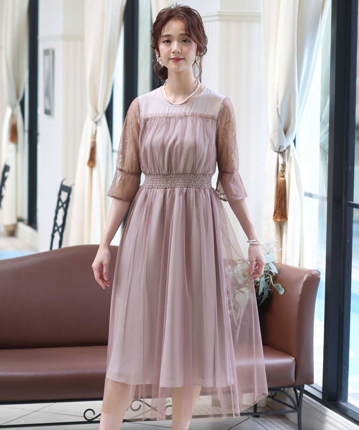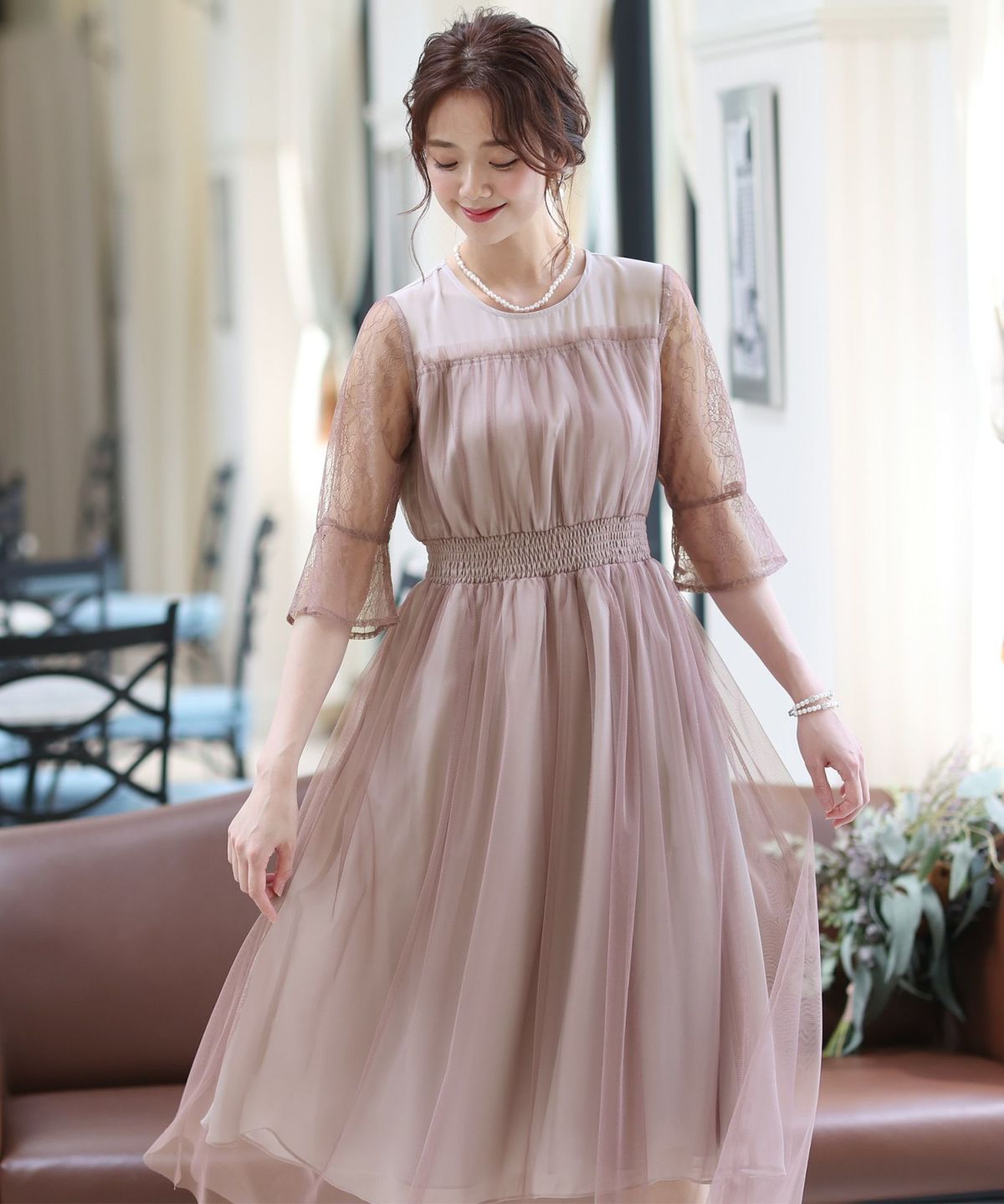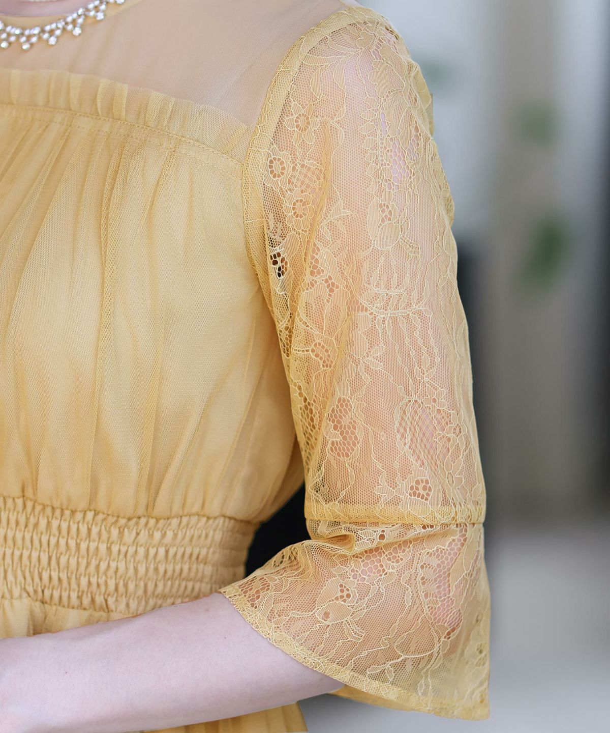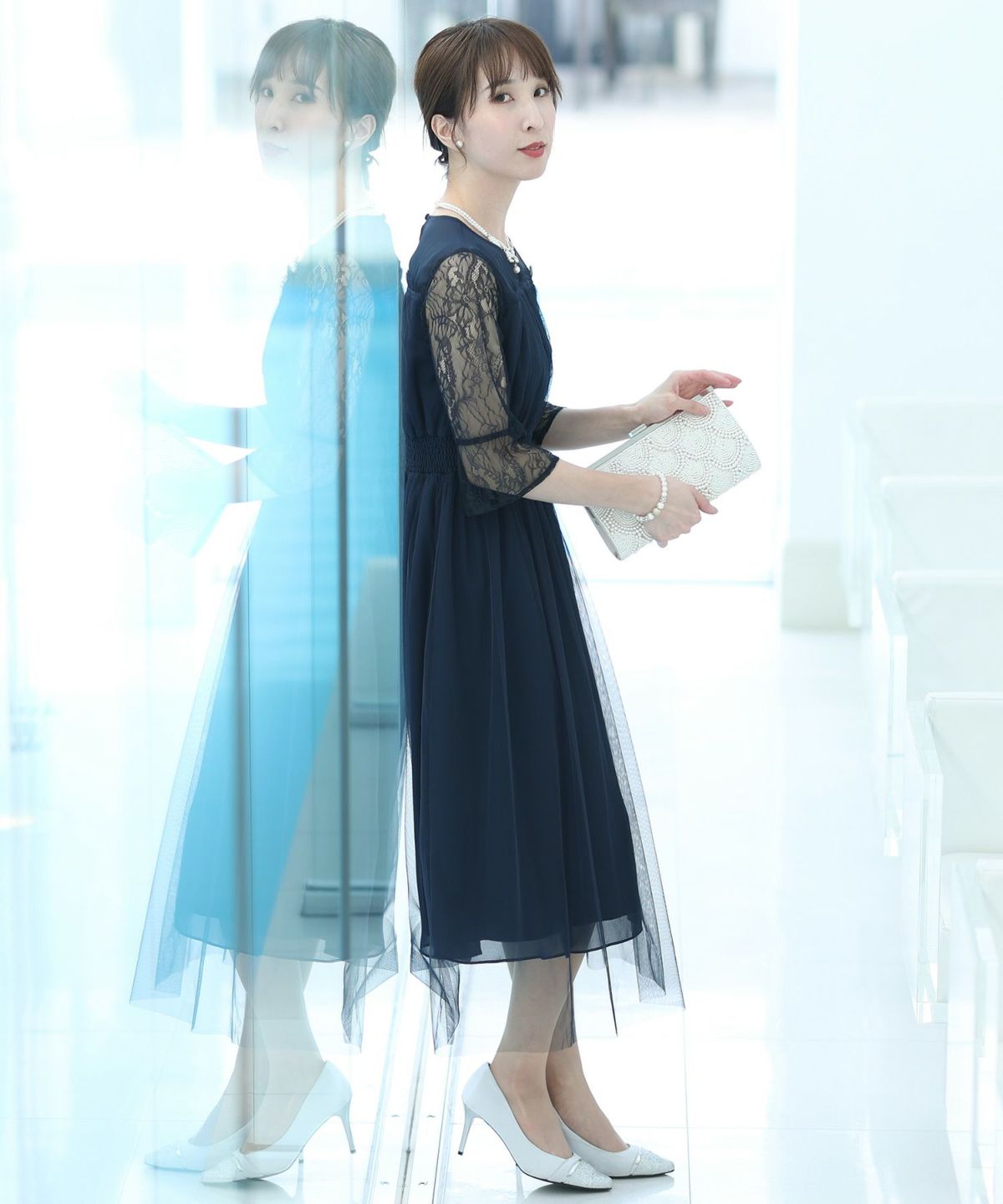 【二の腕】【脚】【ウエスト】【ヒップ】透け感のある5分袖のレースが気になる二の腕をさり気なくカバー。ウエスト位置も高く自然にスタイルアップしてくれます。