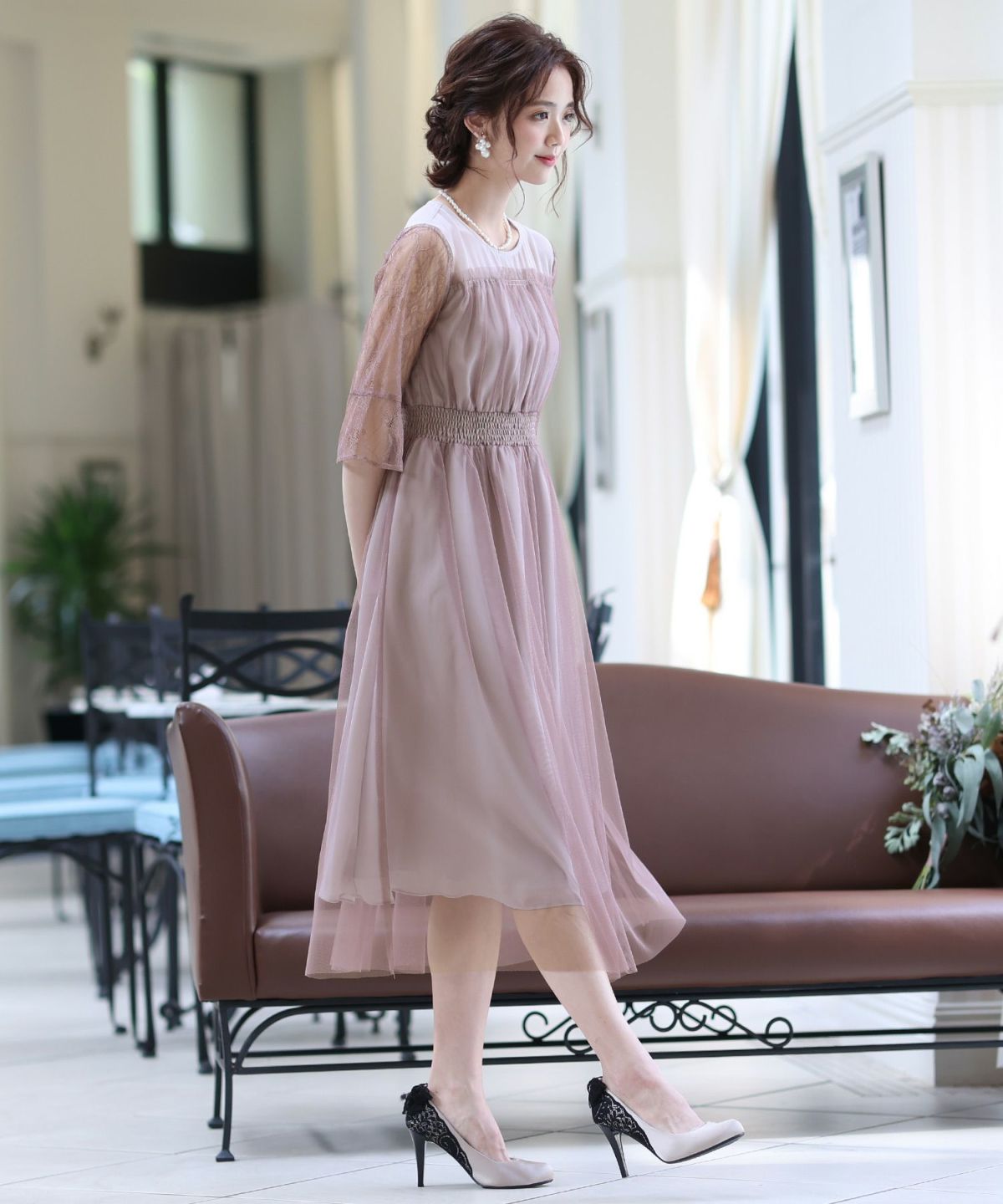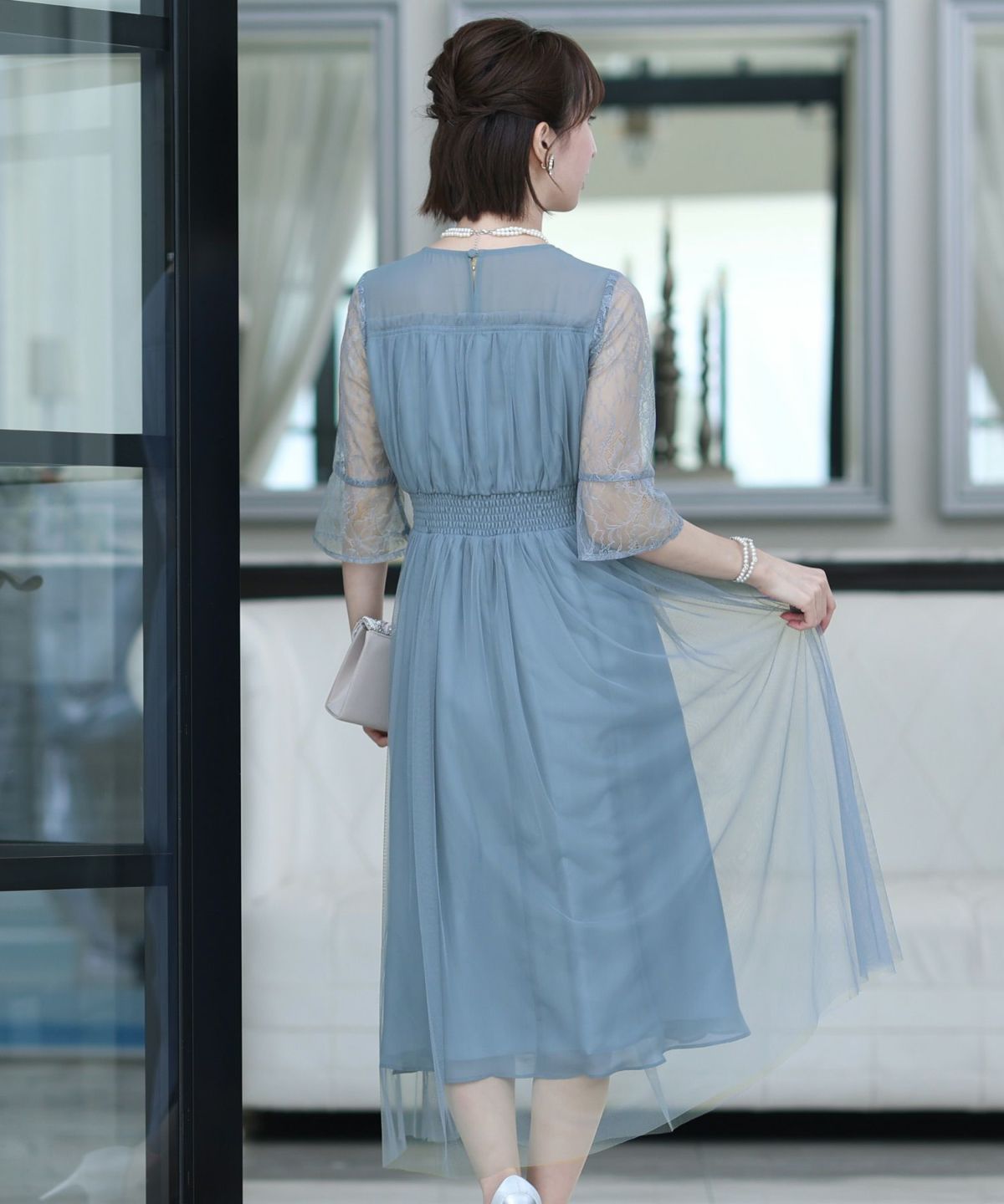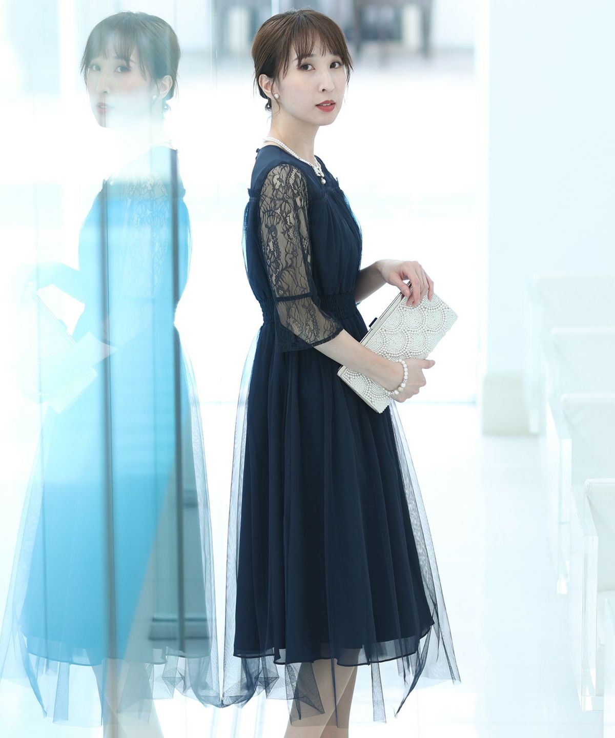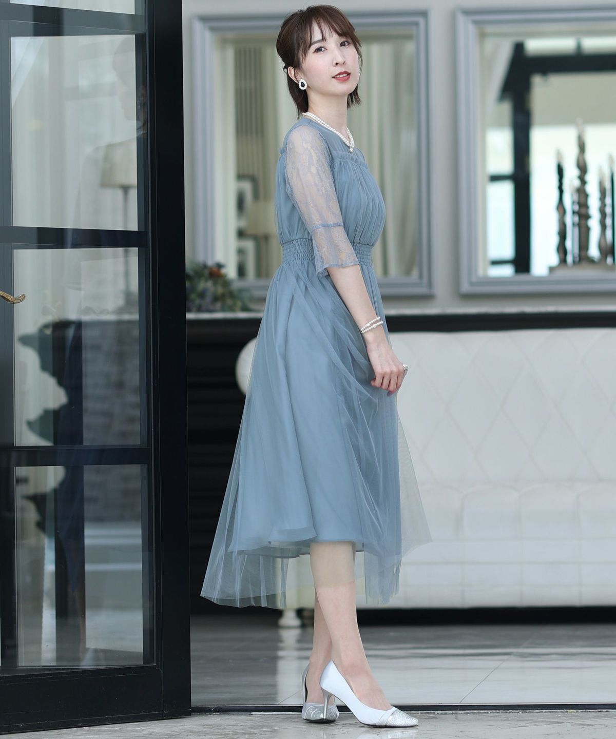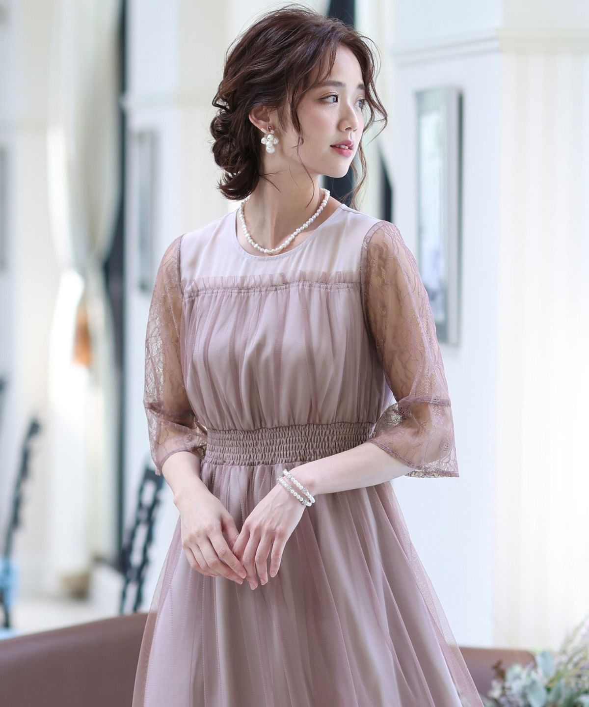 【二の腕】【脚】【ウエスト】【ヒップ】透け感のある5分袖のレースが気になる二の腕をさり気なくカバー。ウエスト位置も高く自然にスタイルアップしてくれます。