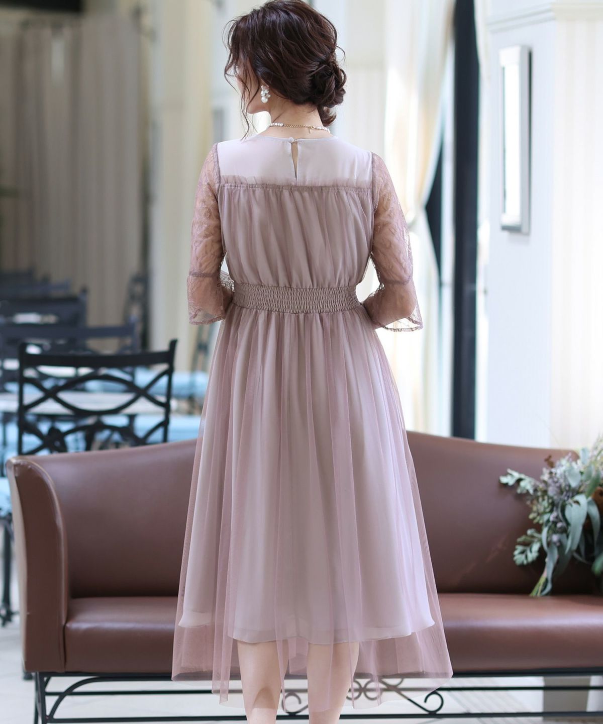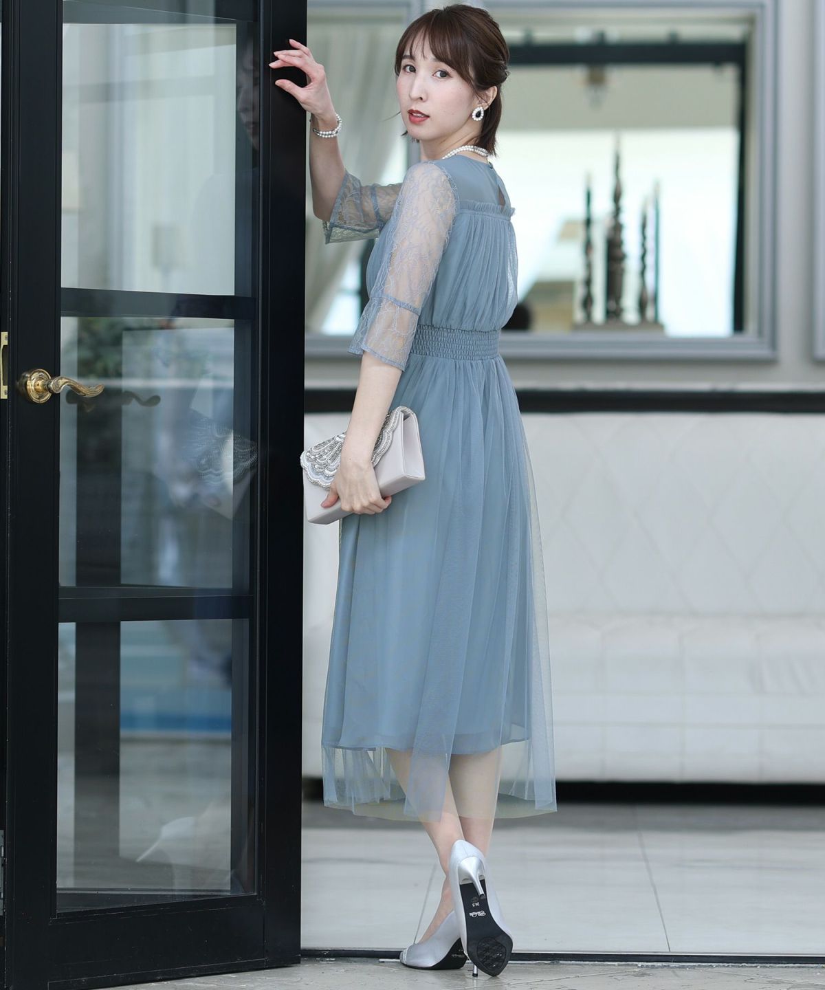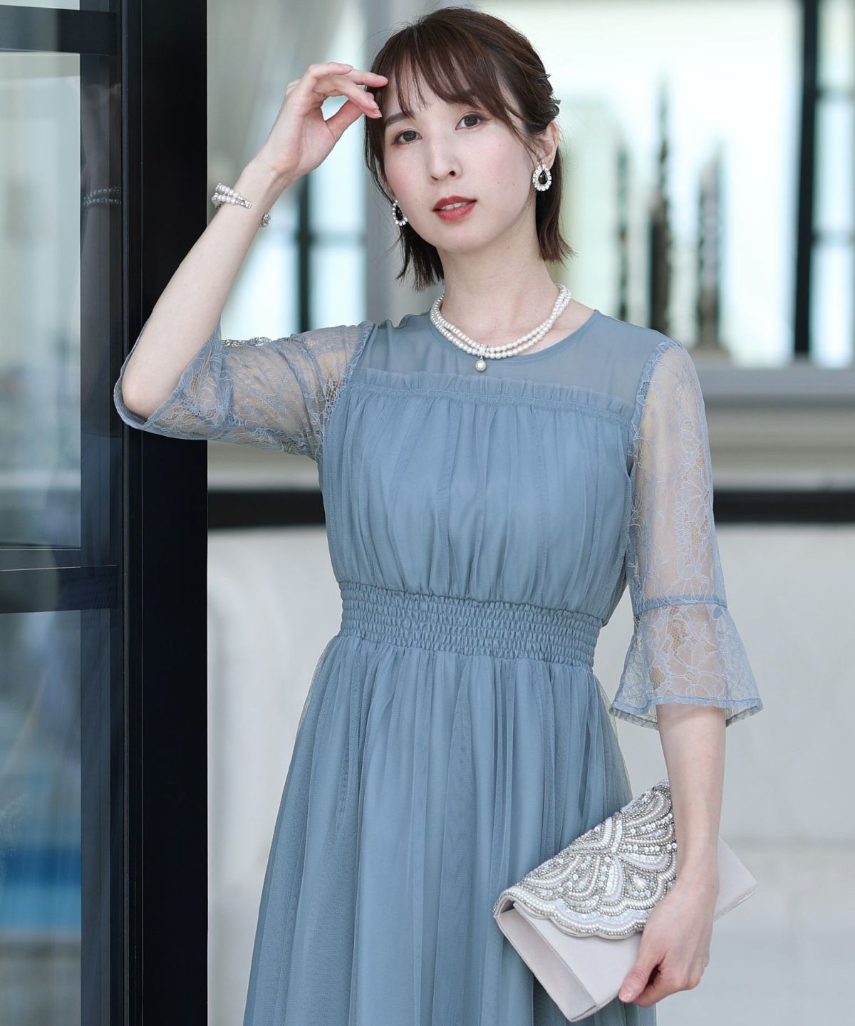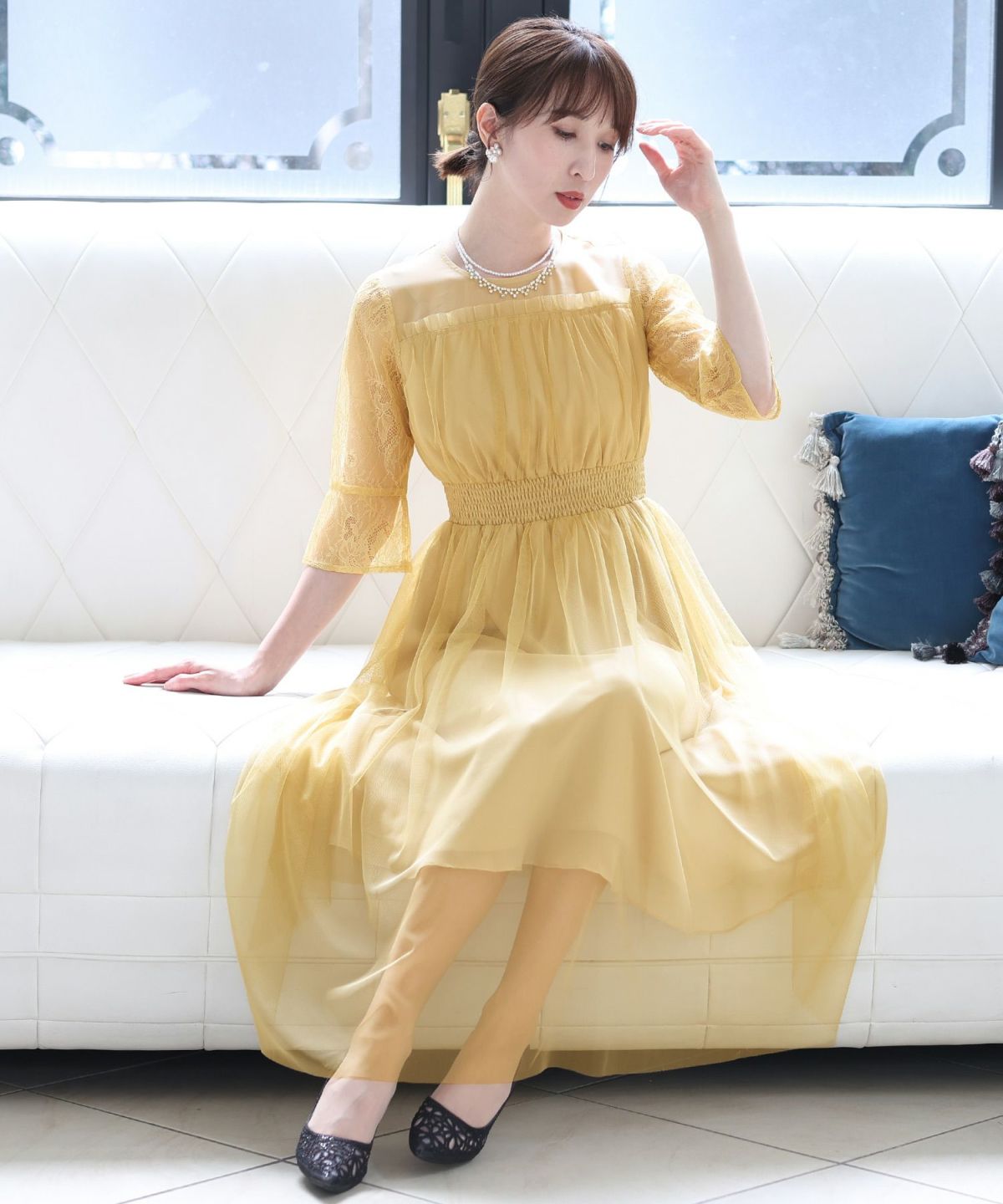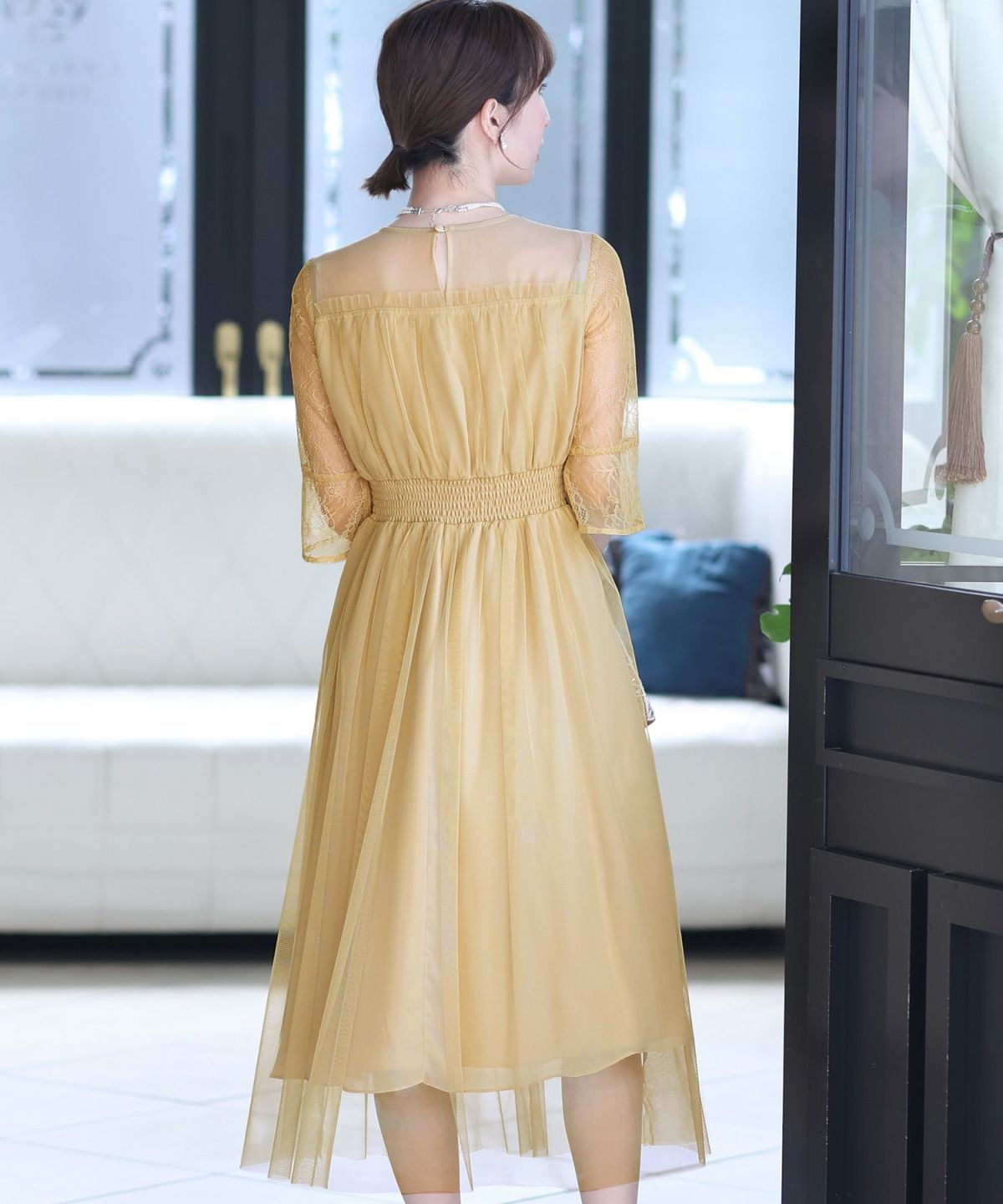 【二の腕】【脚】【ウエスト】【ヒップ】透け感のある5分袖のレースが気になる二の腕をさり気なくカバー。ウエスト位置も高く自然にスタイルアップしてくれます。