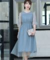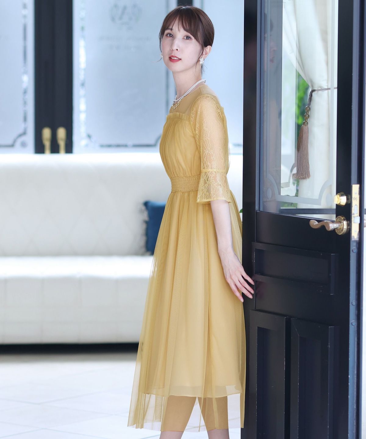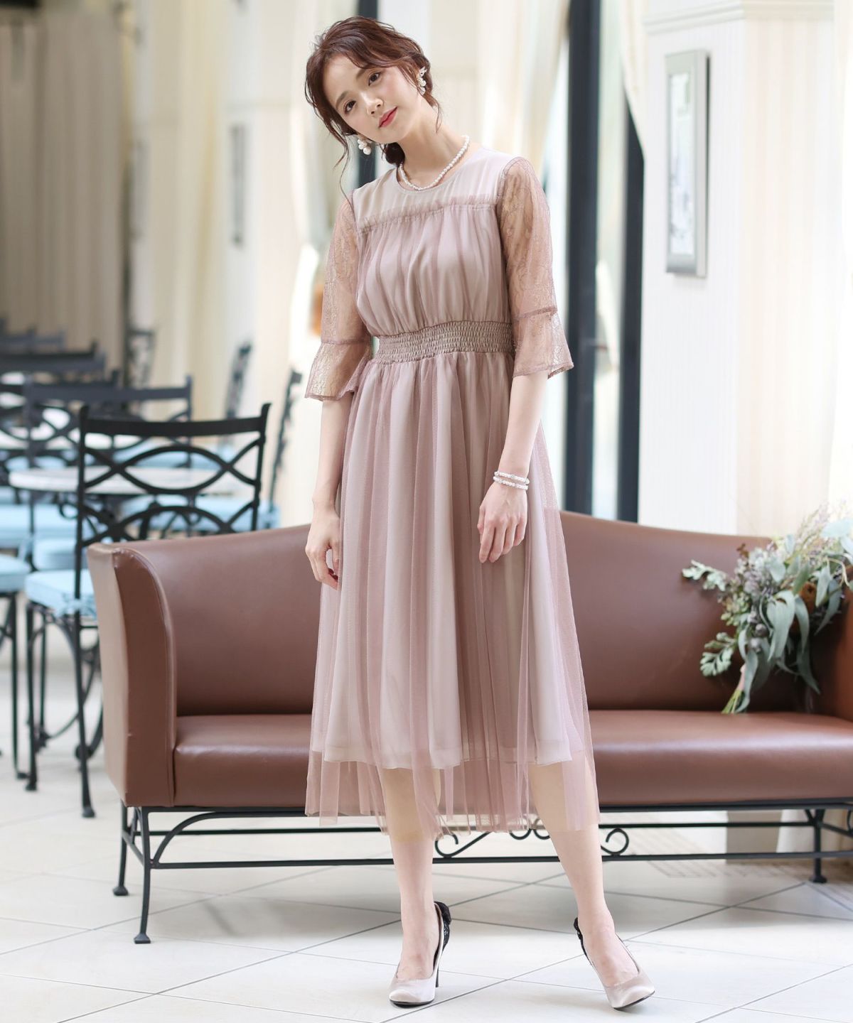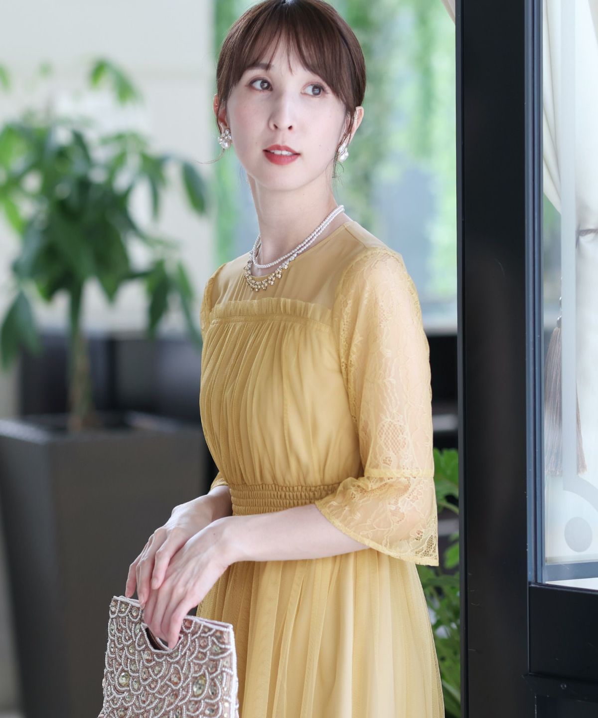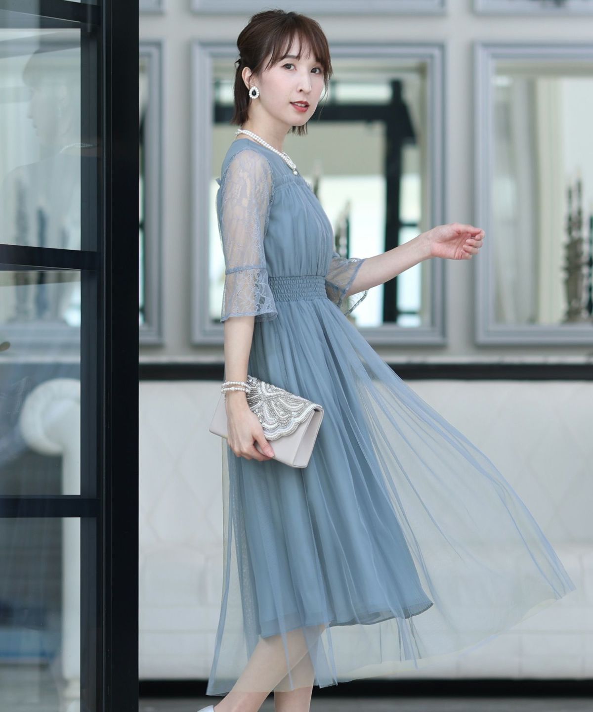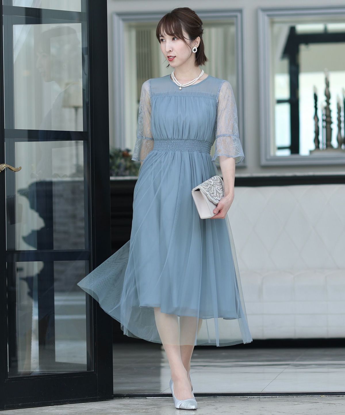 【二の腕】【脚】【ウエスト】【ヒップ】透け感のある5分袖のレースが気になる二の腕をさり気なくカバー。ウエスト位置も高く自然にスタイルアップしてくれます。