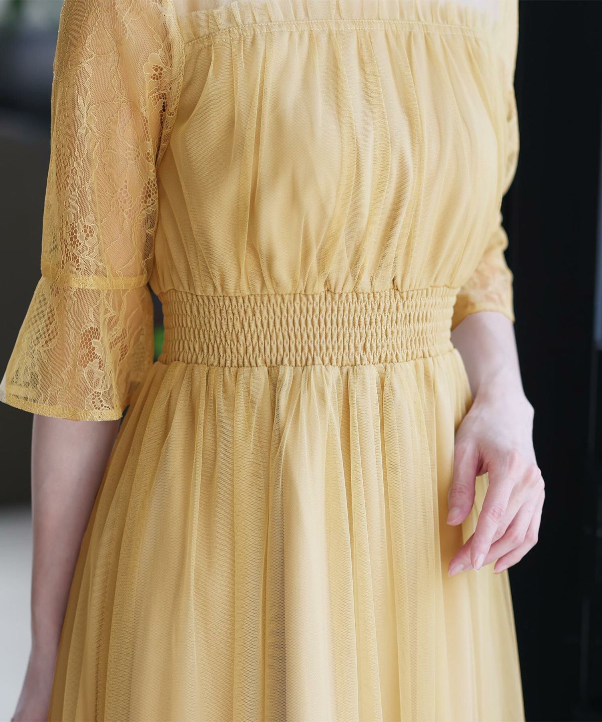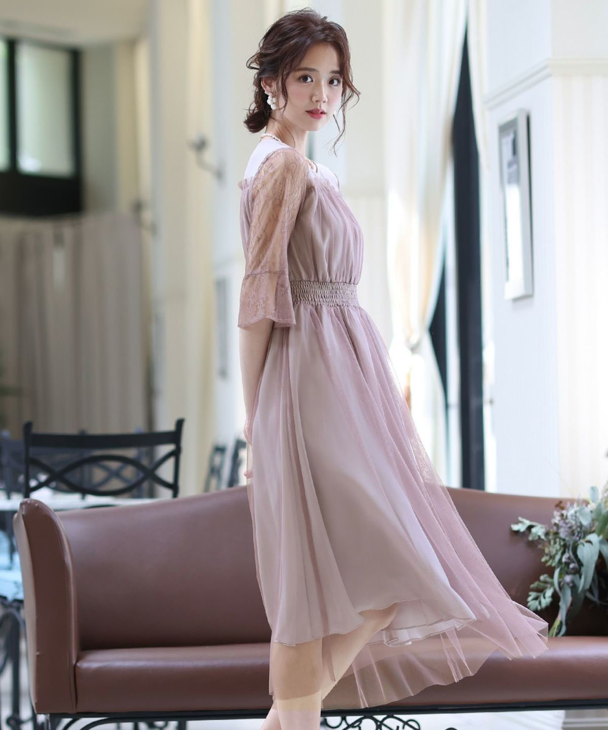 レースのベルスリーブが可愛い印象を演出。デコルテ部分はさり気ない透け感で露出控えめ◎ウエスト部分がゴムになっており、締め付け感もなく着心地がとても楽♪