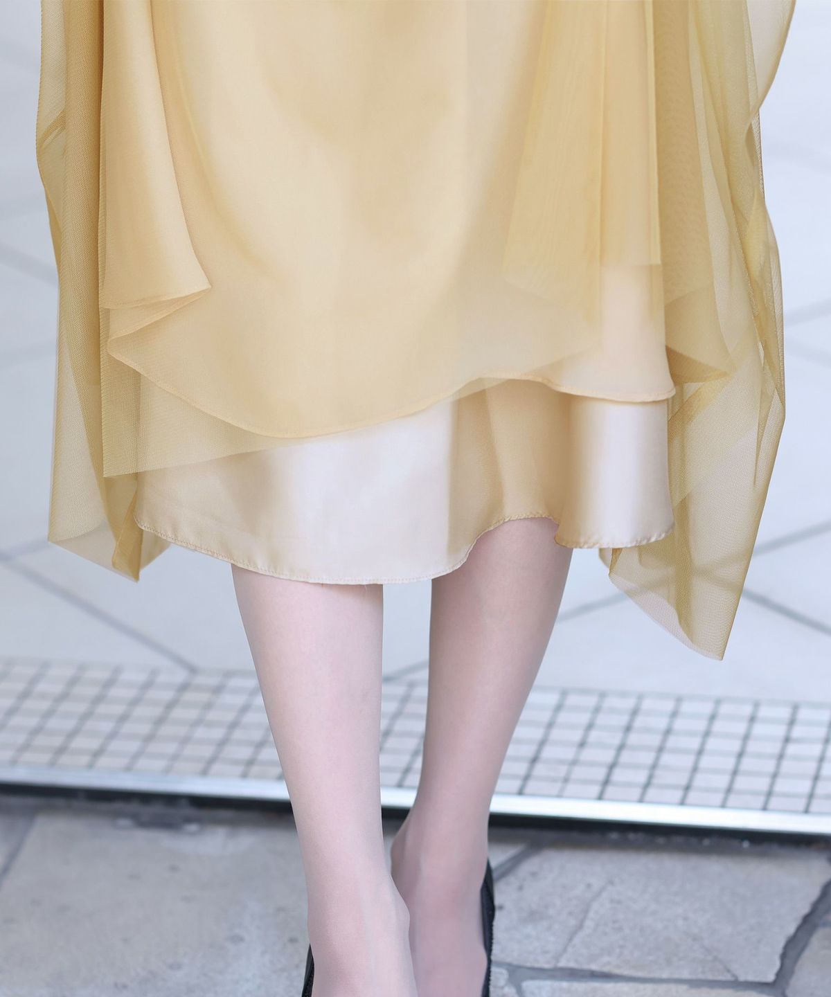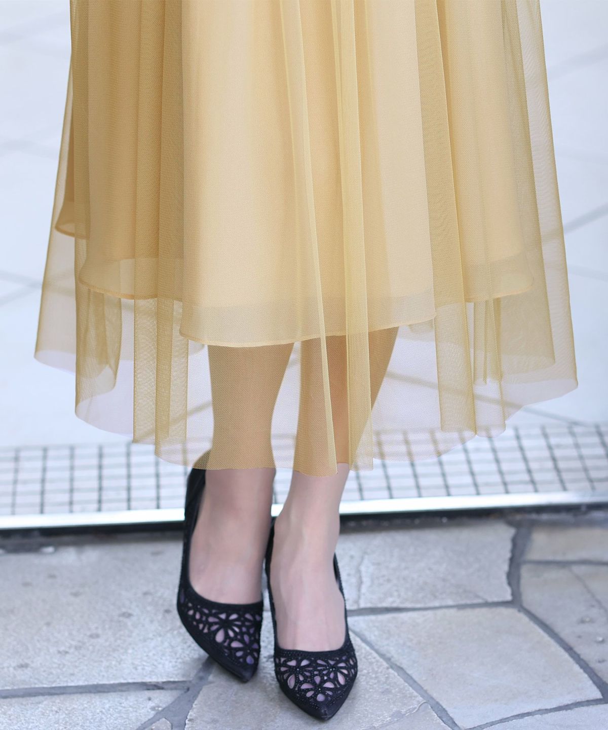 フレアシルエットで大人女子にもオススメ!ミモレ丈が可愛く広がりすぎないので清楚な印象に。チュールの下にはシフォン生地と裏地が付いているので安心して着用いただけます。