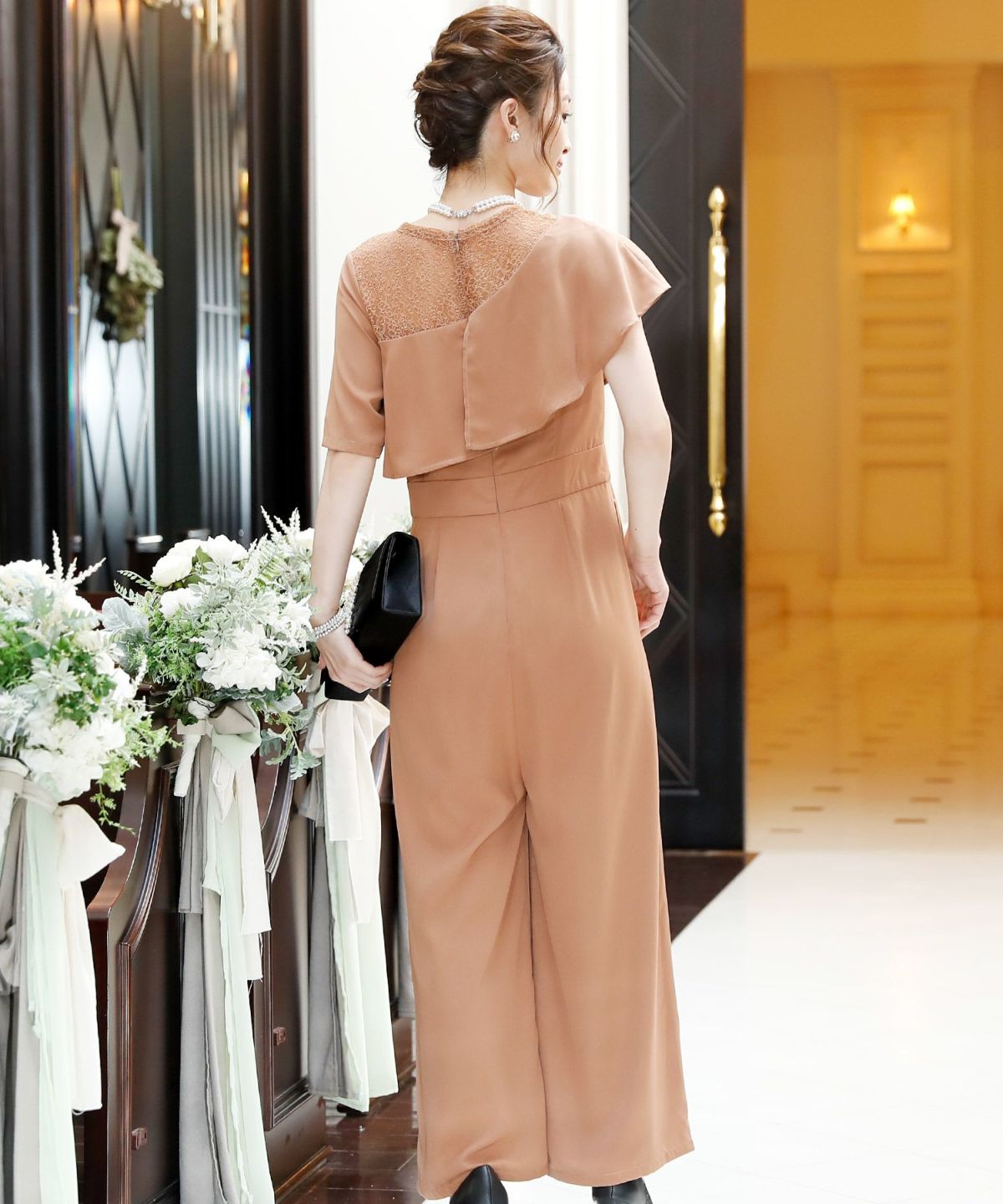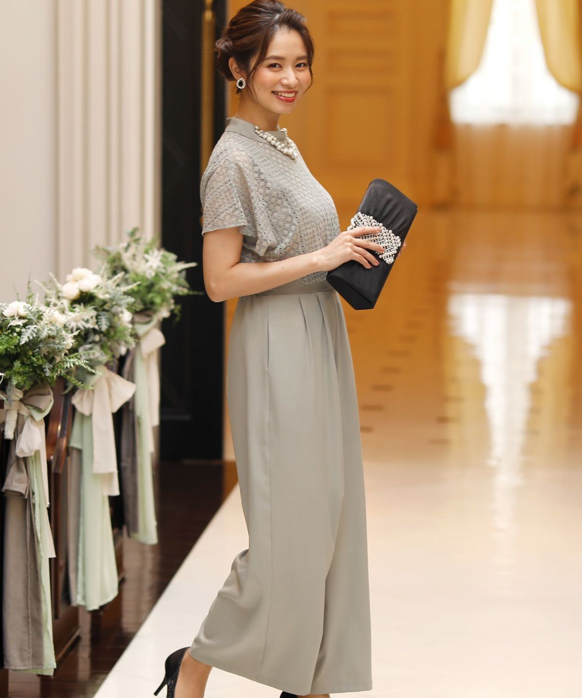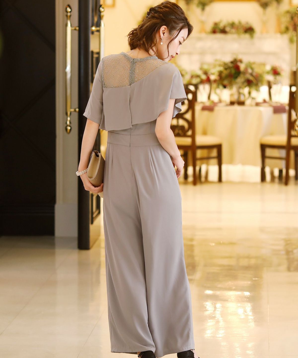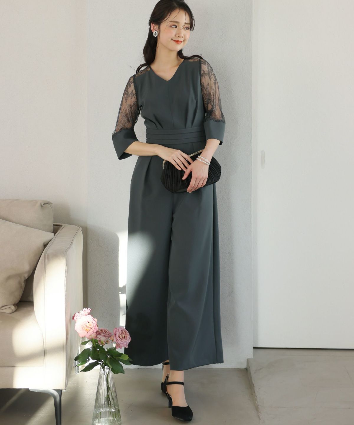 パンツドレスならではのモダンな雰囲気と、フォーマルにふさわしい上品さを兼ね備え、結婚式や披露宴、季節を問わないお呼ばれシーンに最適です。