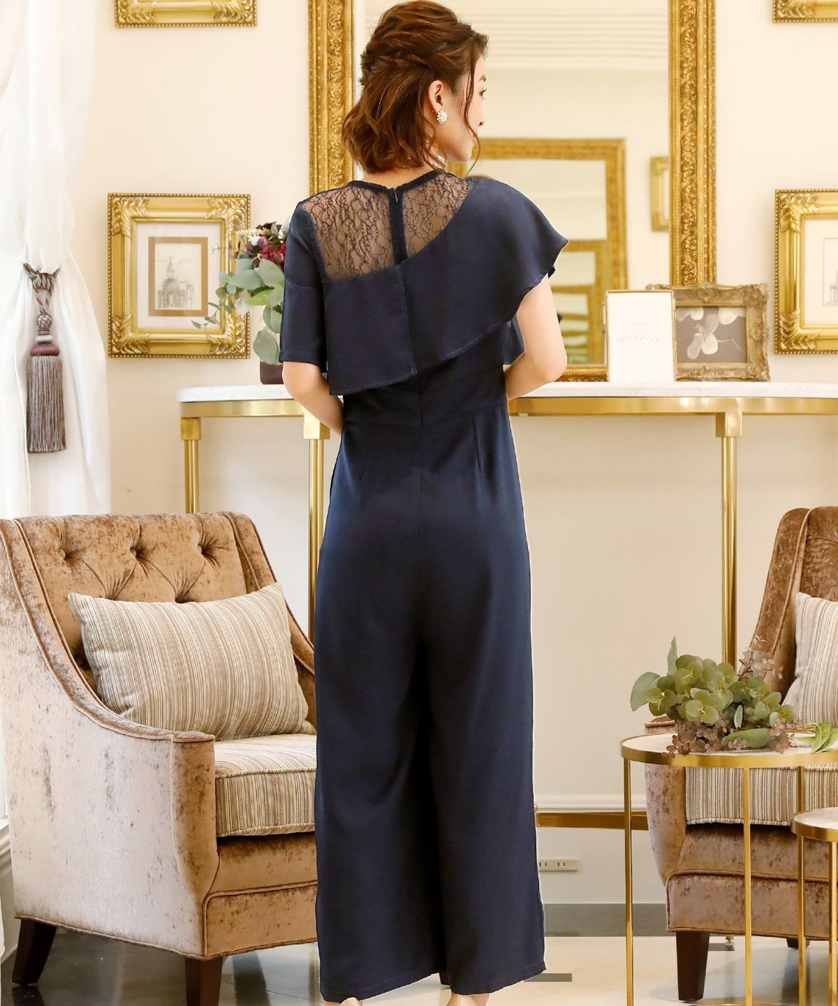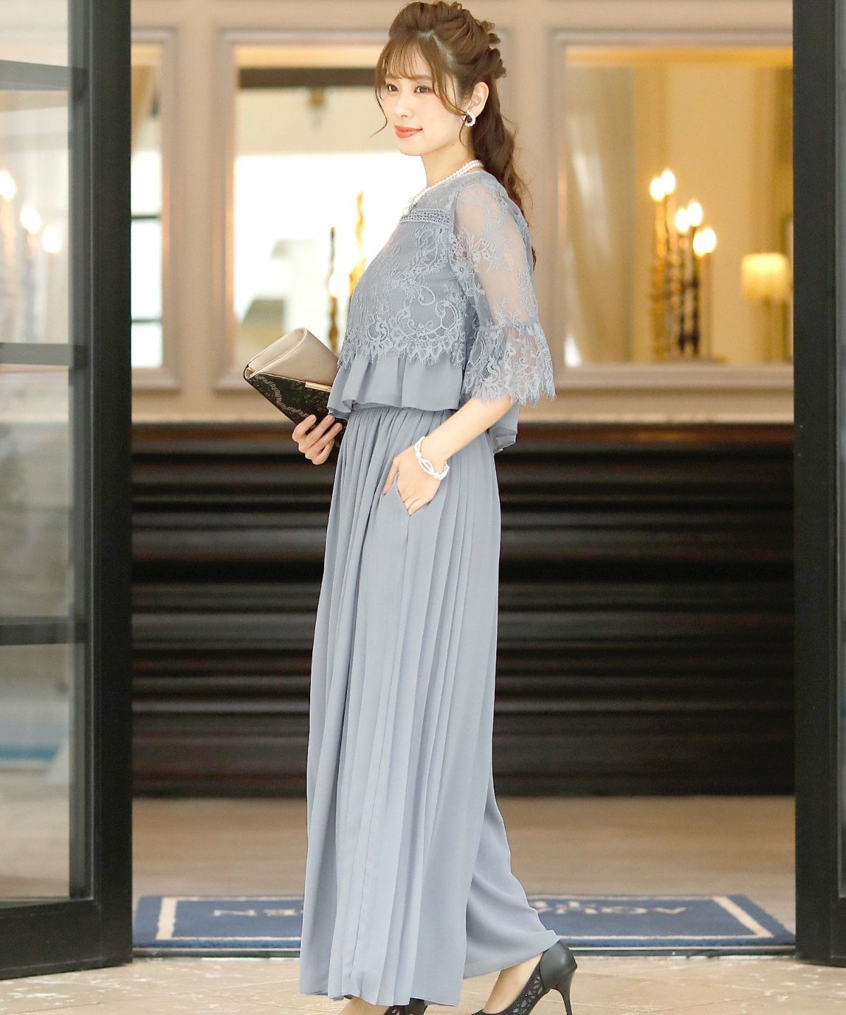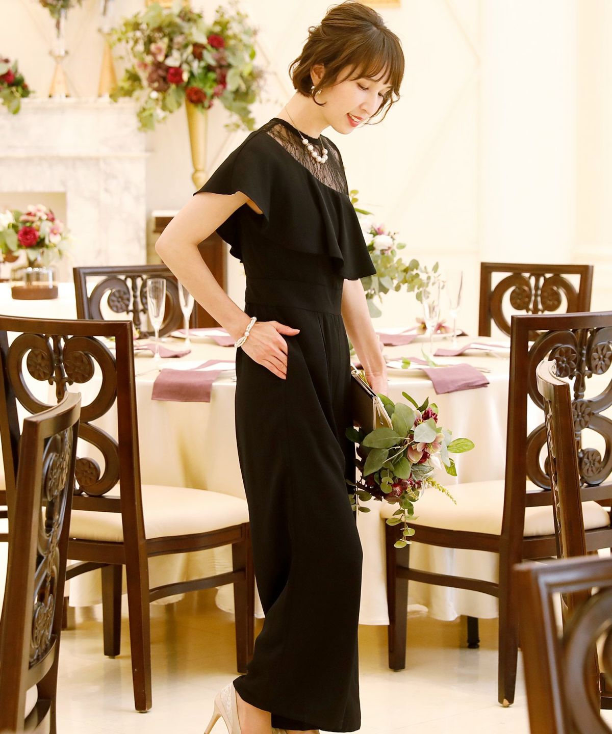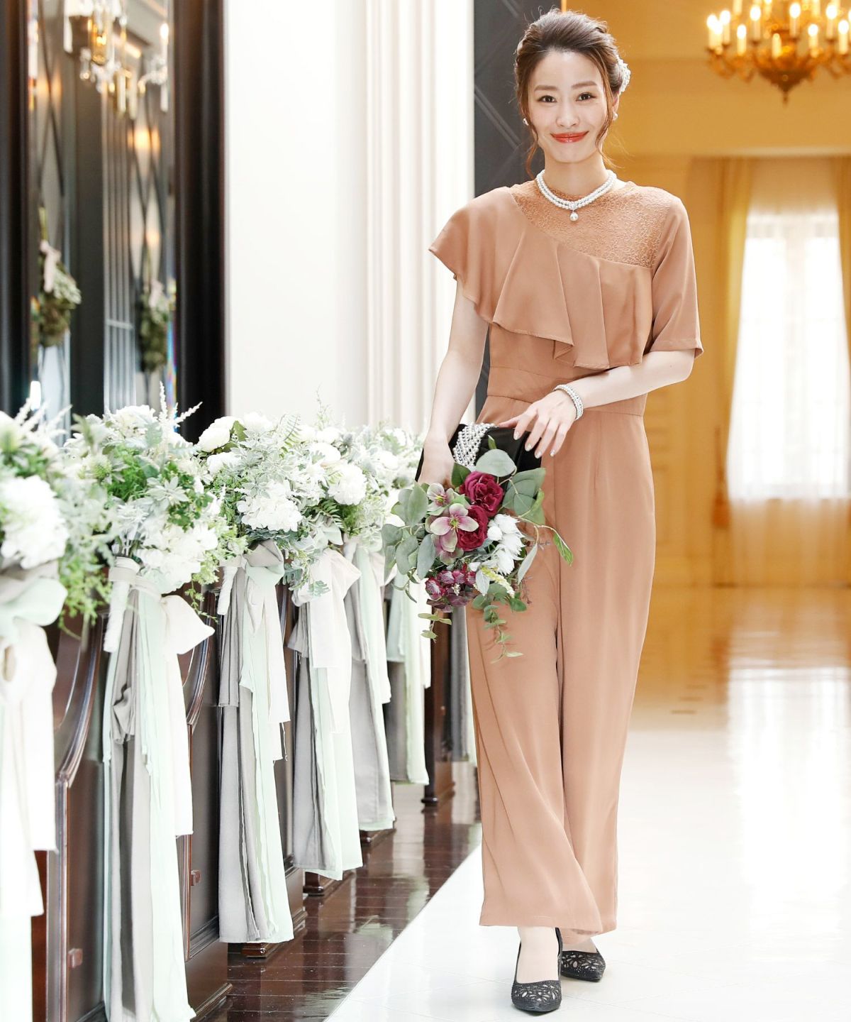 パンツドレスならではのモダンな雰囲気と、フォーマルにふさわしい上品さを兼ね備え、結婚式や披露宴、季節を問わないお呼ばれシーンに最適です。