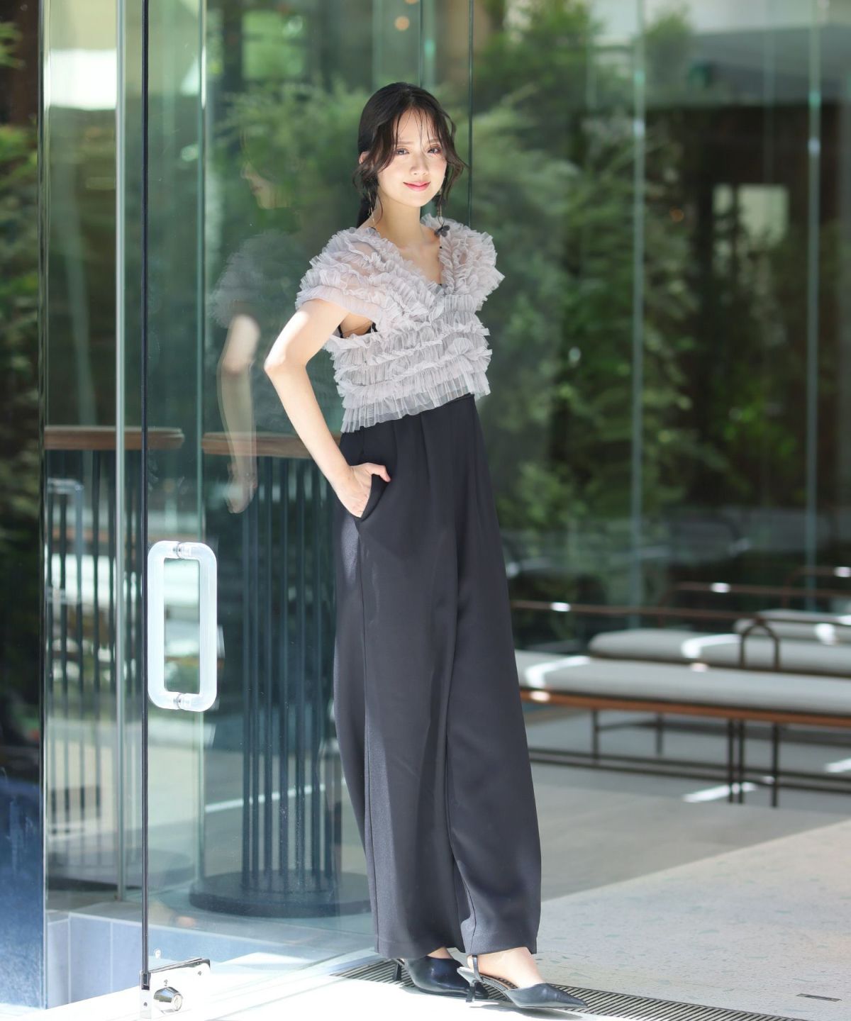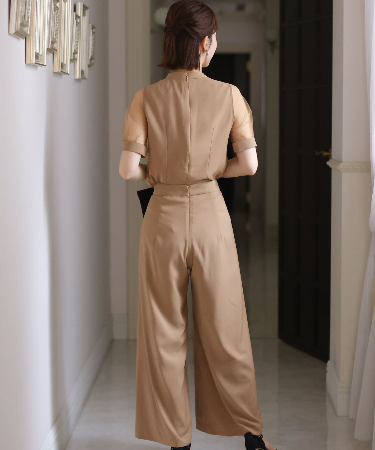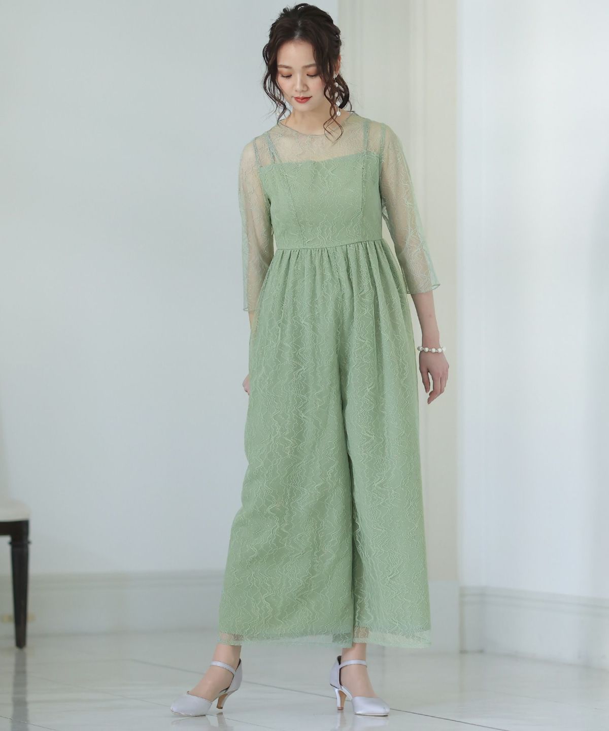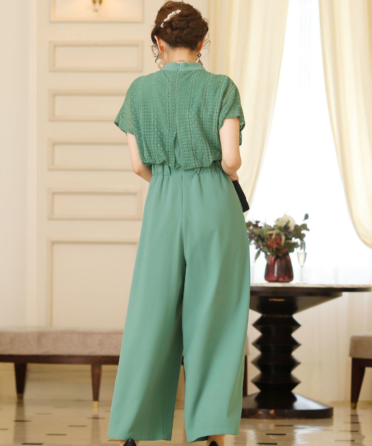 パンツドレスならではのモダンな雰囲気と、フォーマルにふさわしい上品さを兼ね備え、結婚式や披露宴、季節を問わないお呼ばれシーンに最適です。