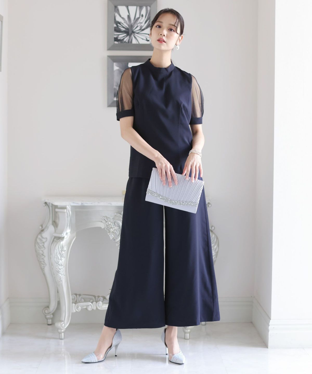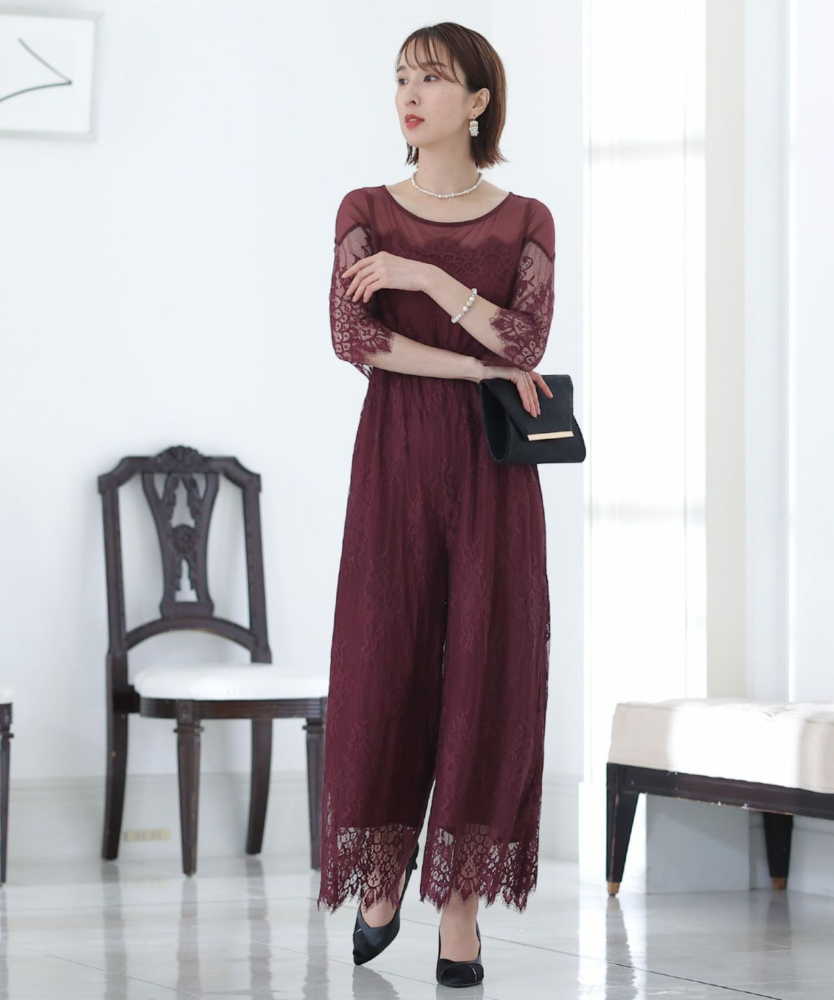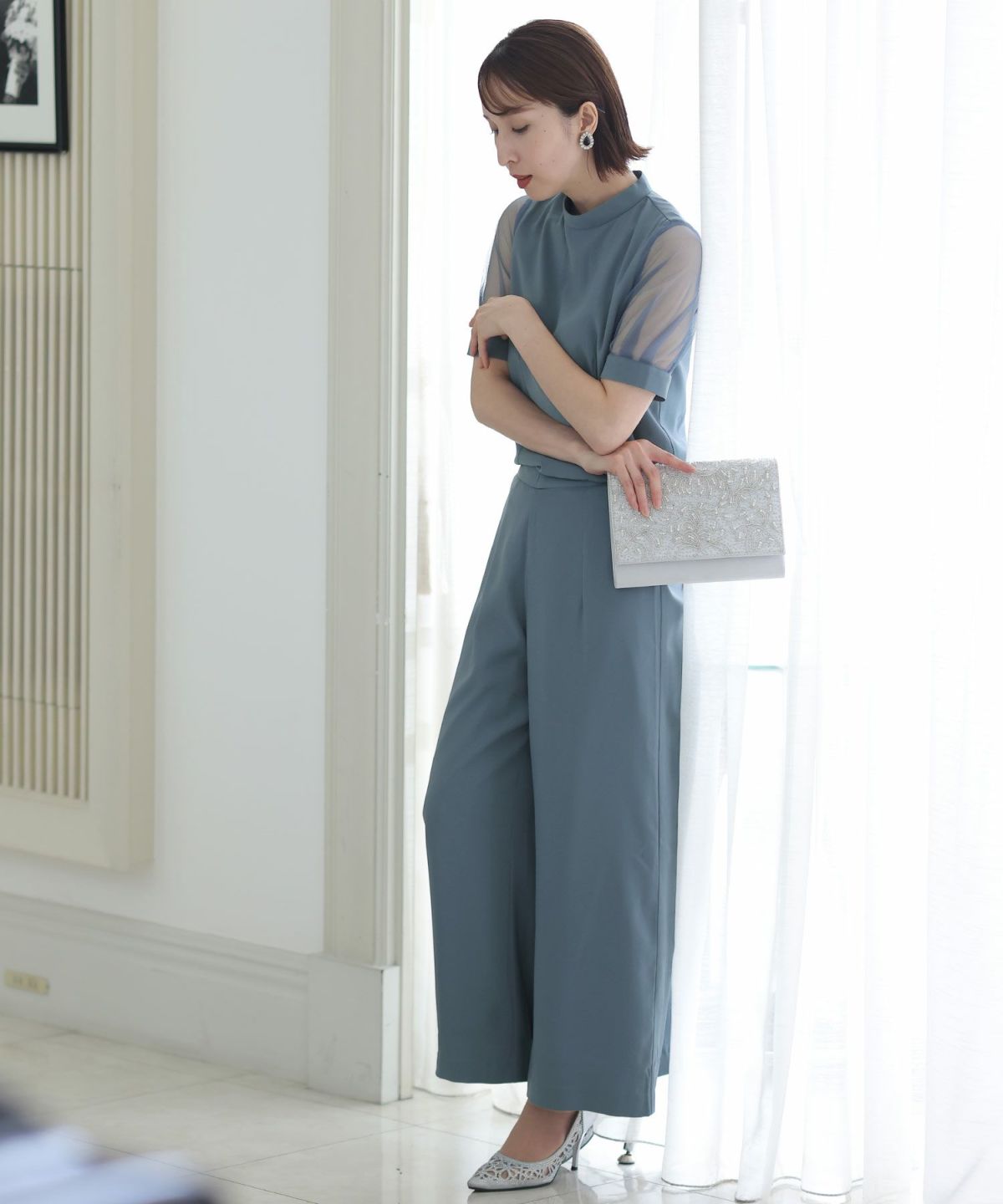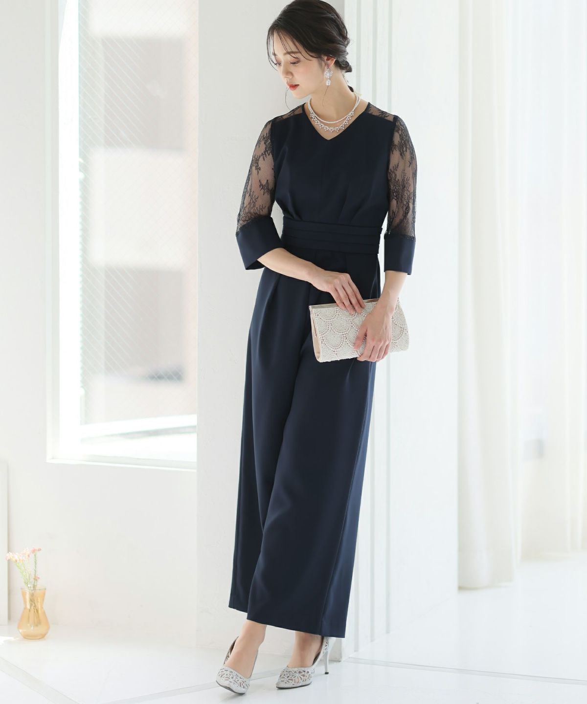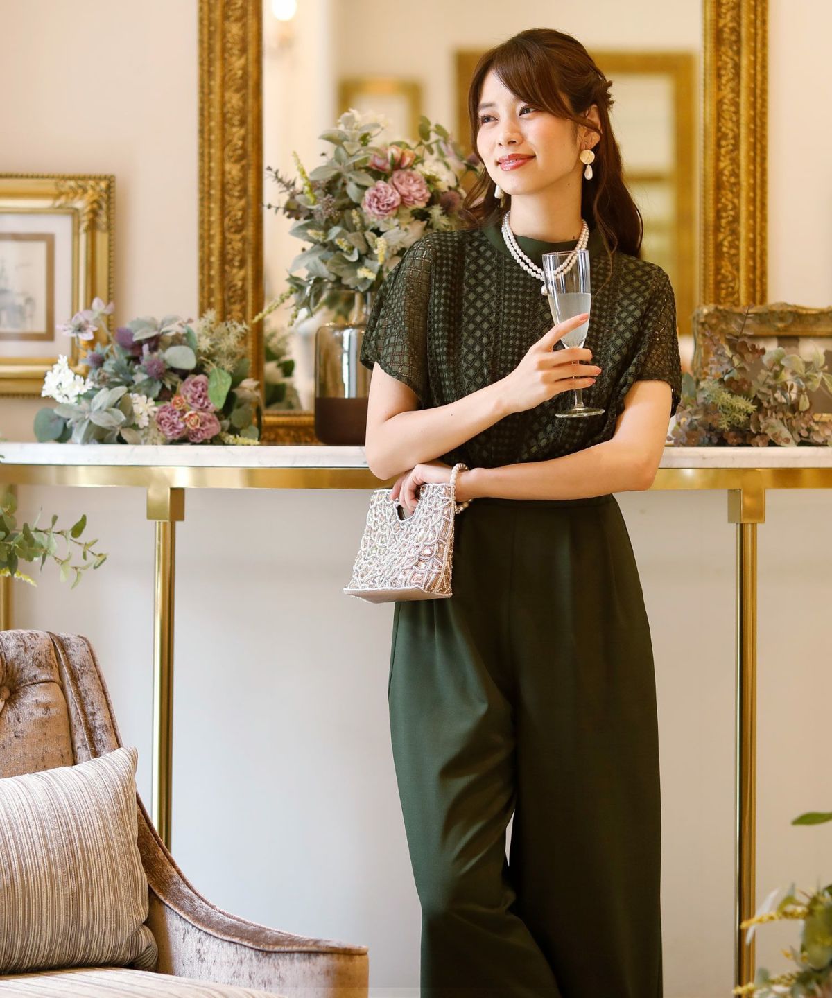 PourVous・atloのパンツドレスは、パーティードレスとしての華やかさと、上品なきちんと感を兼ね備えた一着。