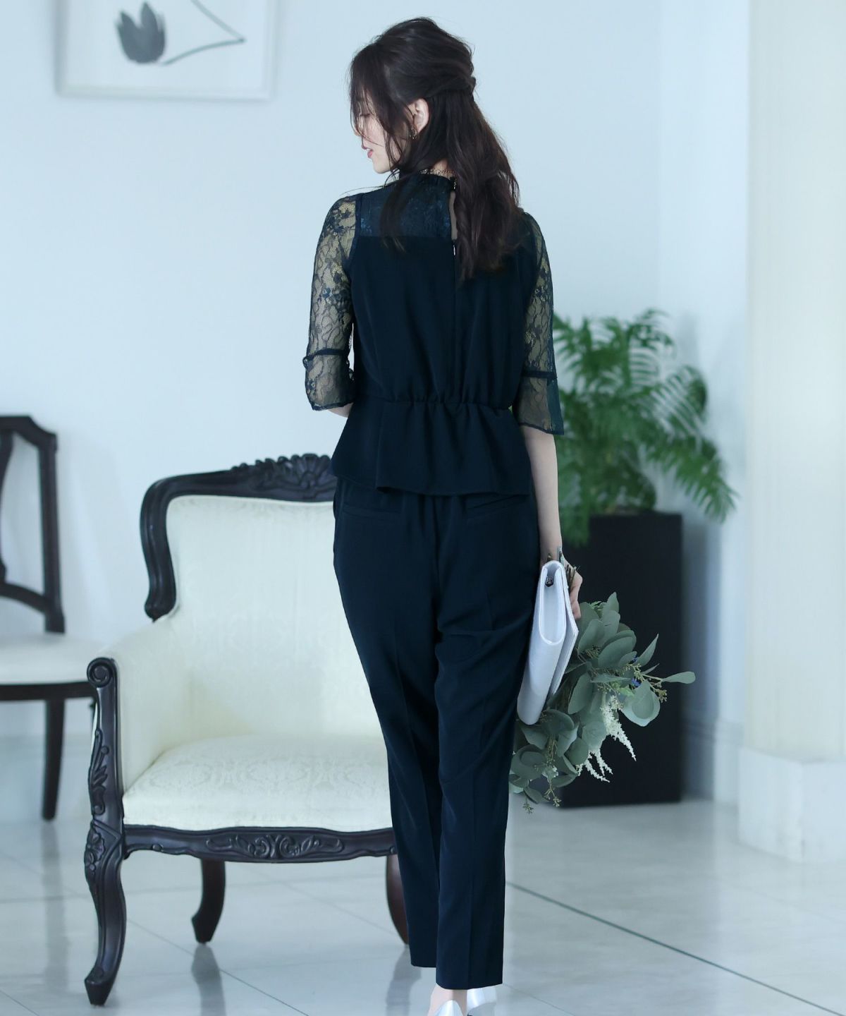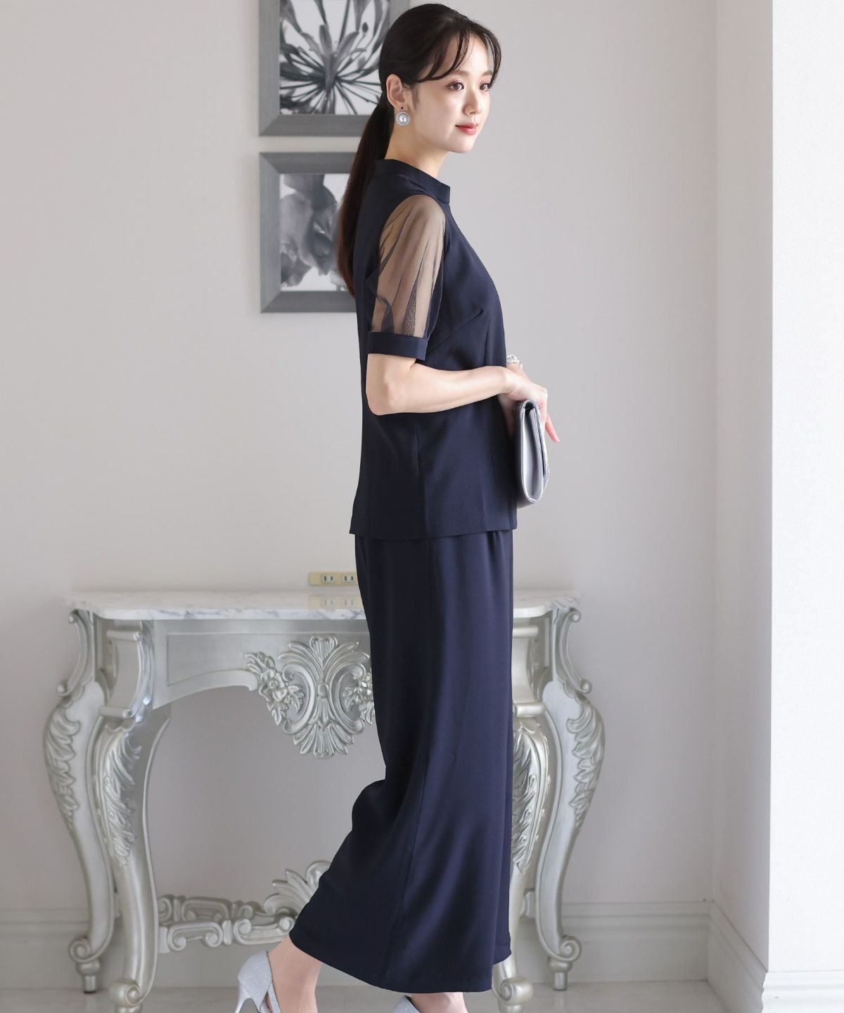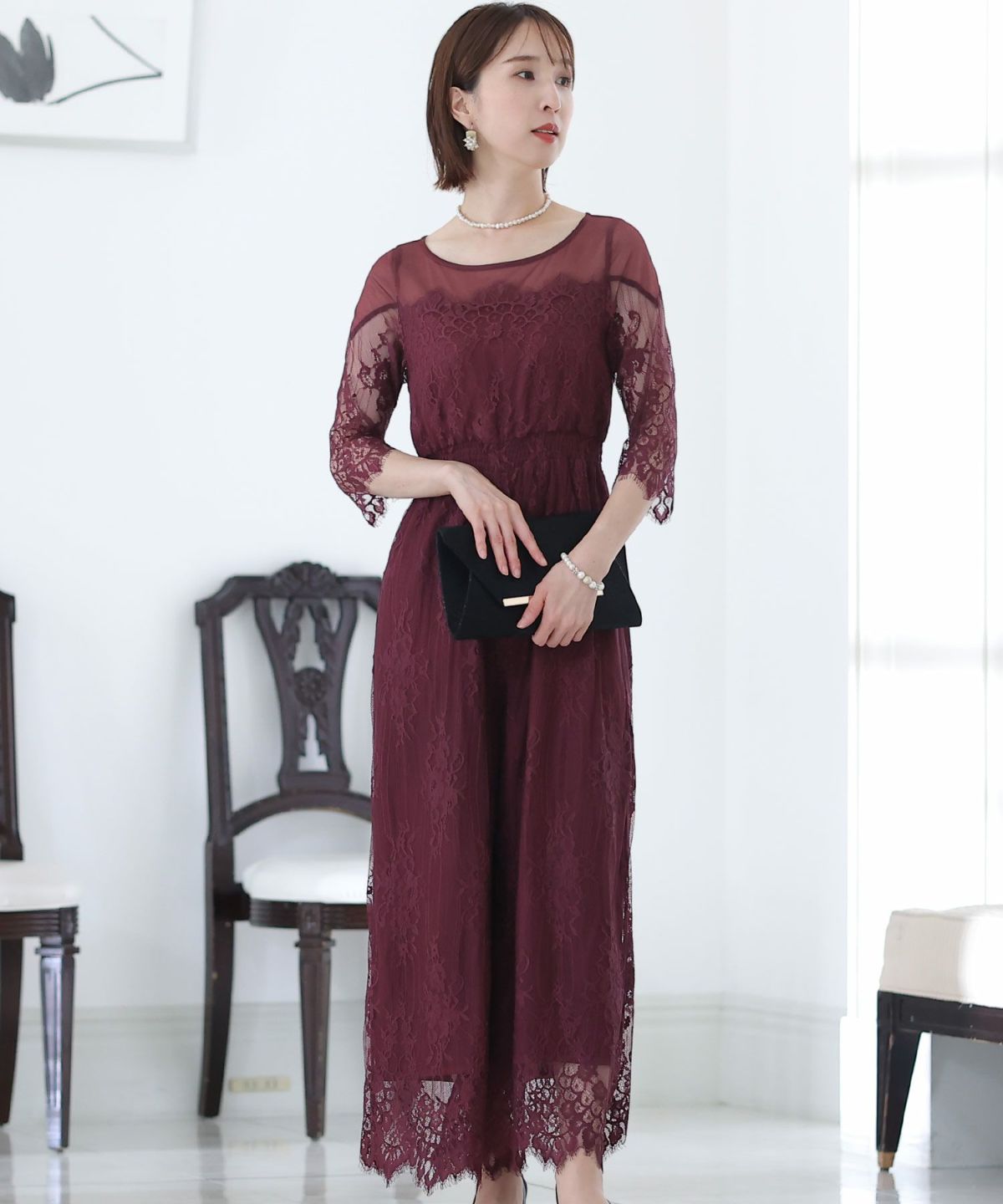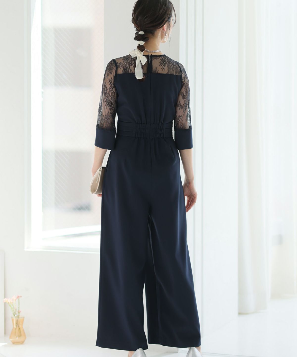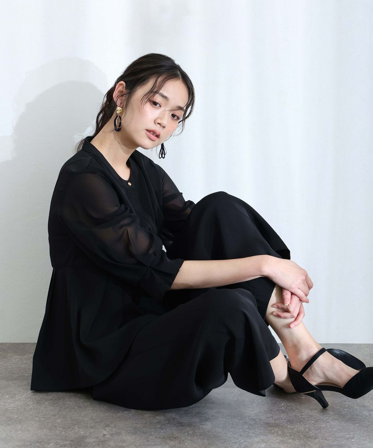 PourVous・atloのパンツドレスは、パーティードレスとしての華やかさと、上品なきちんと感を兼ね備えた一着。