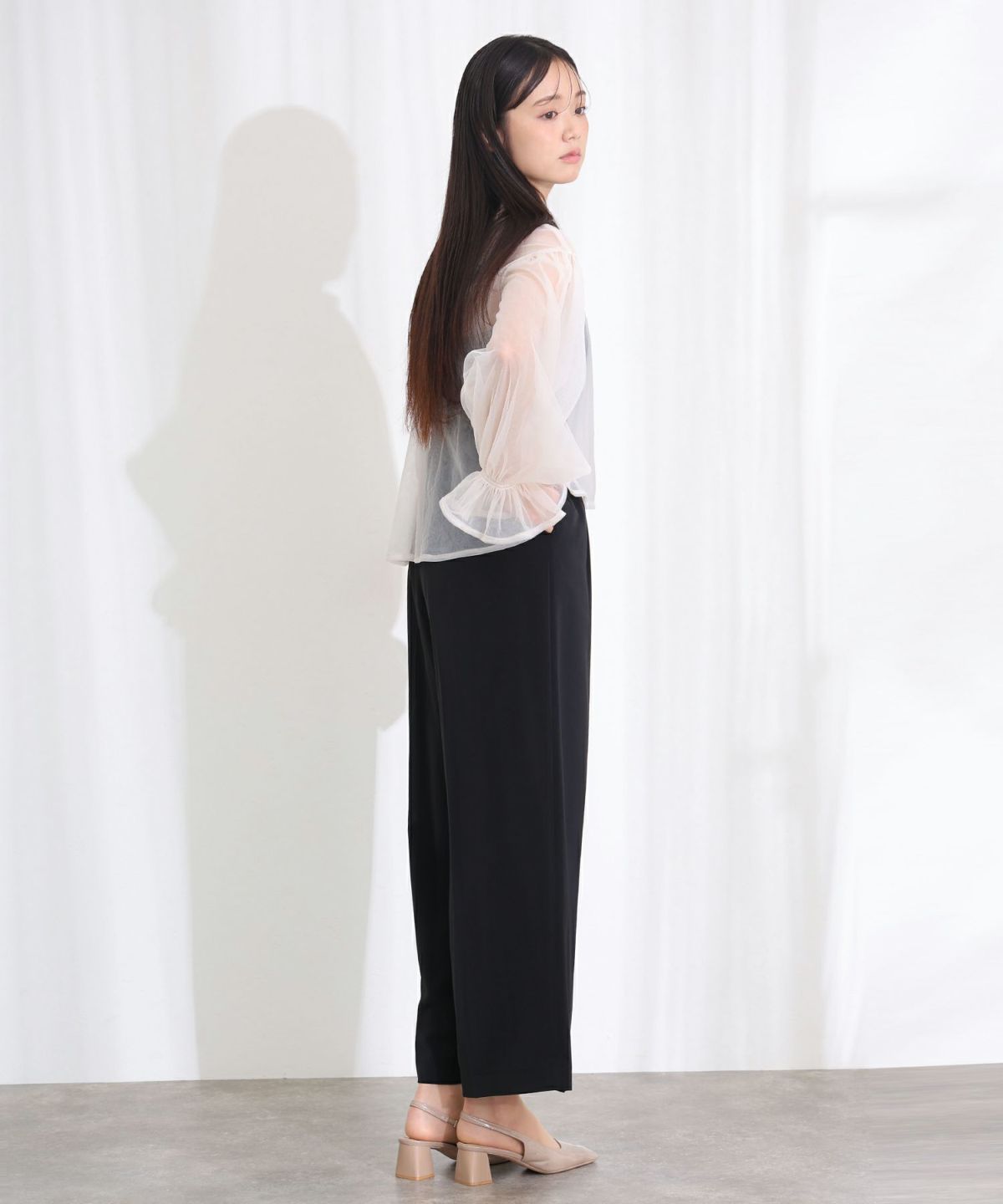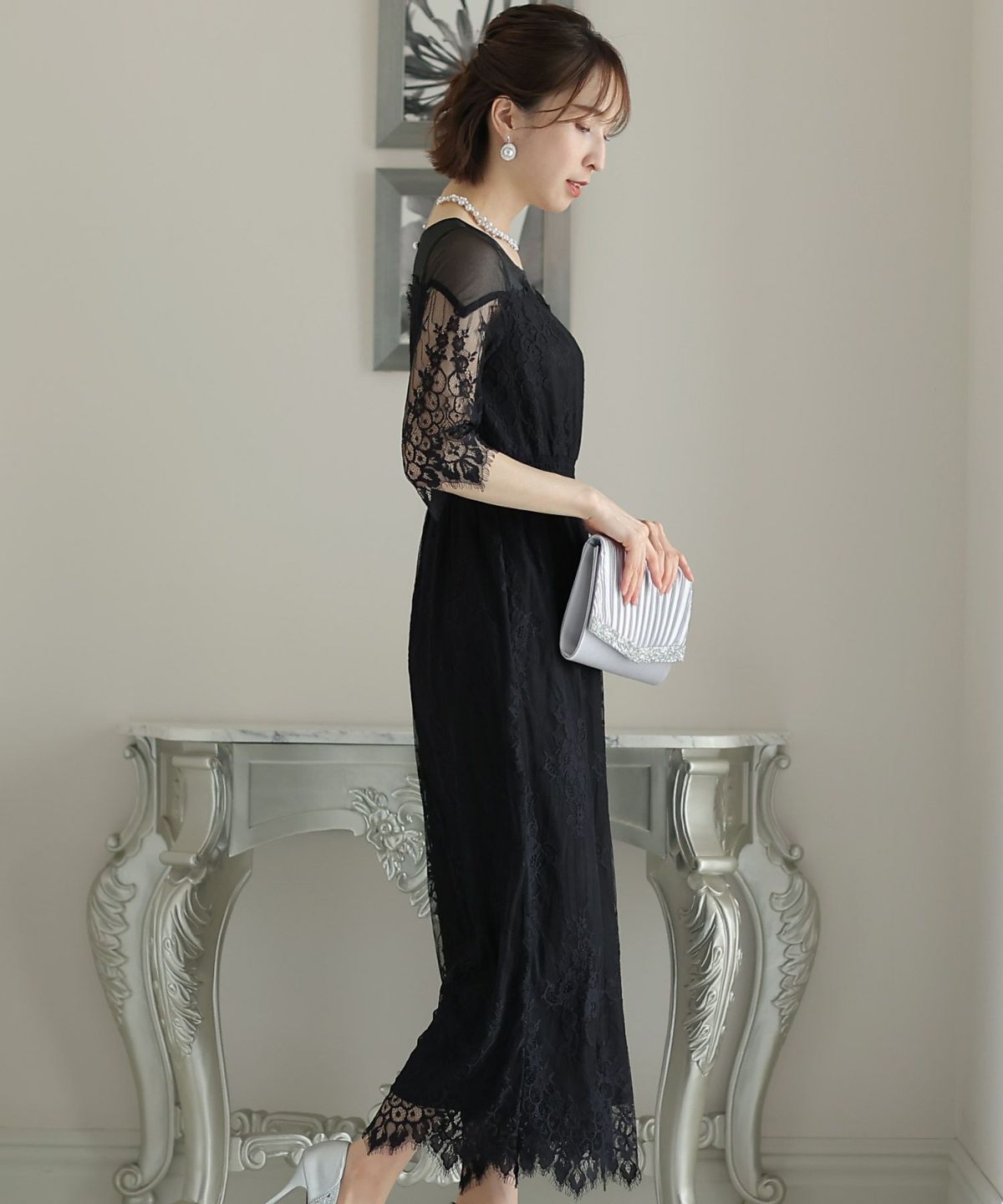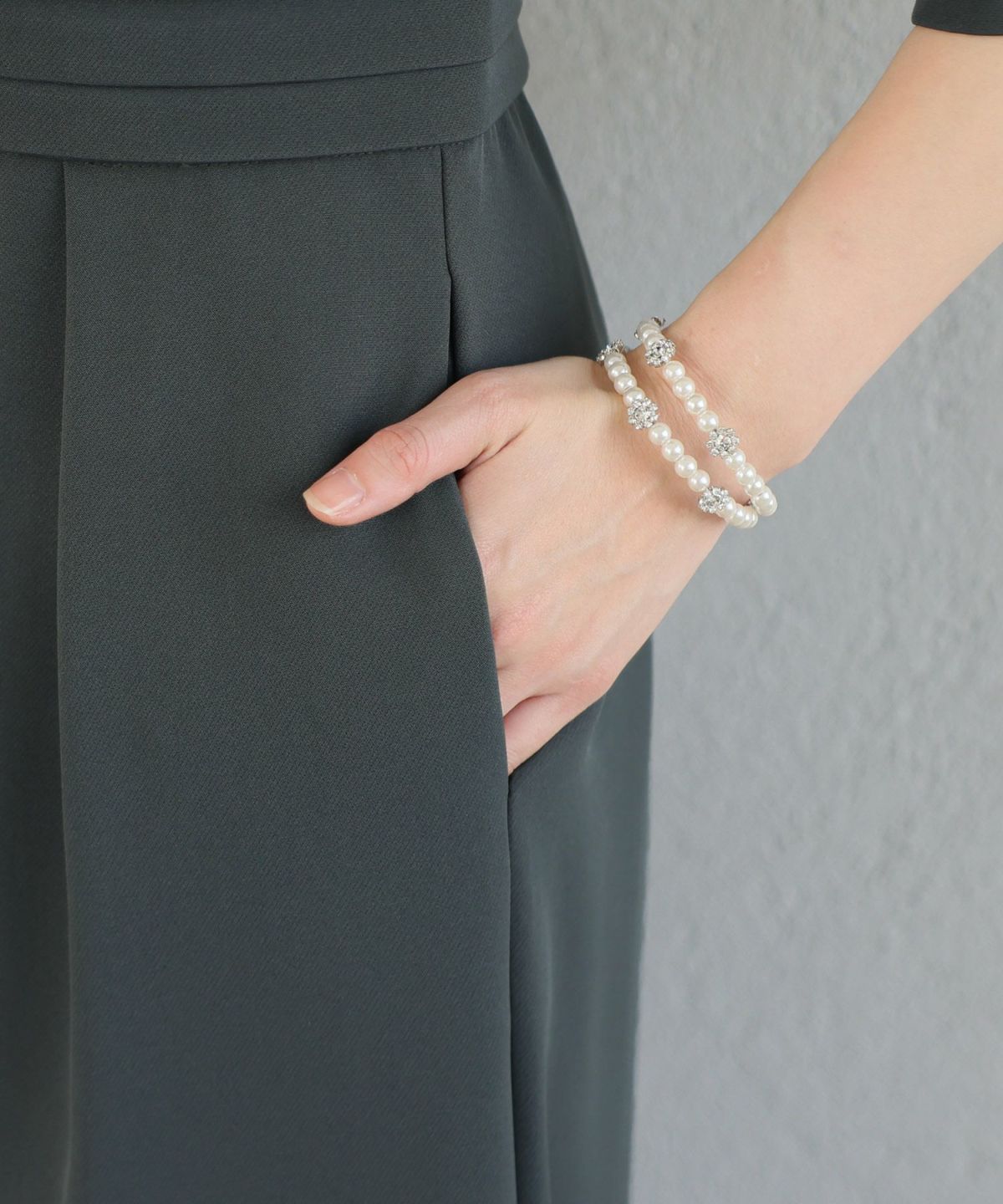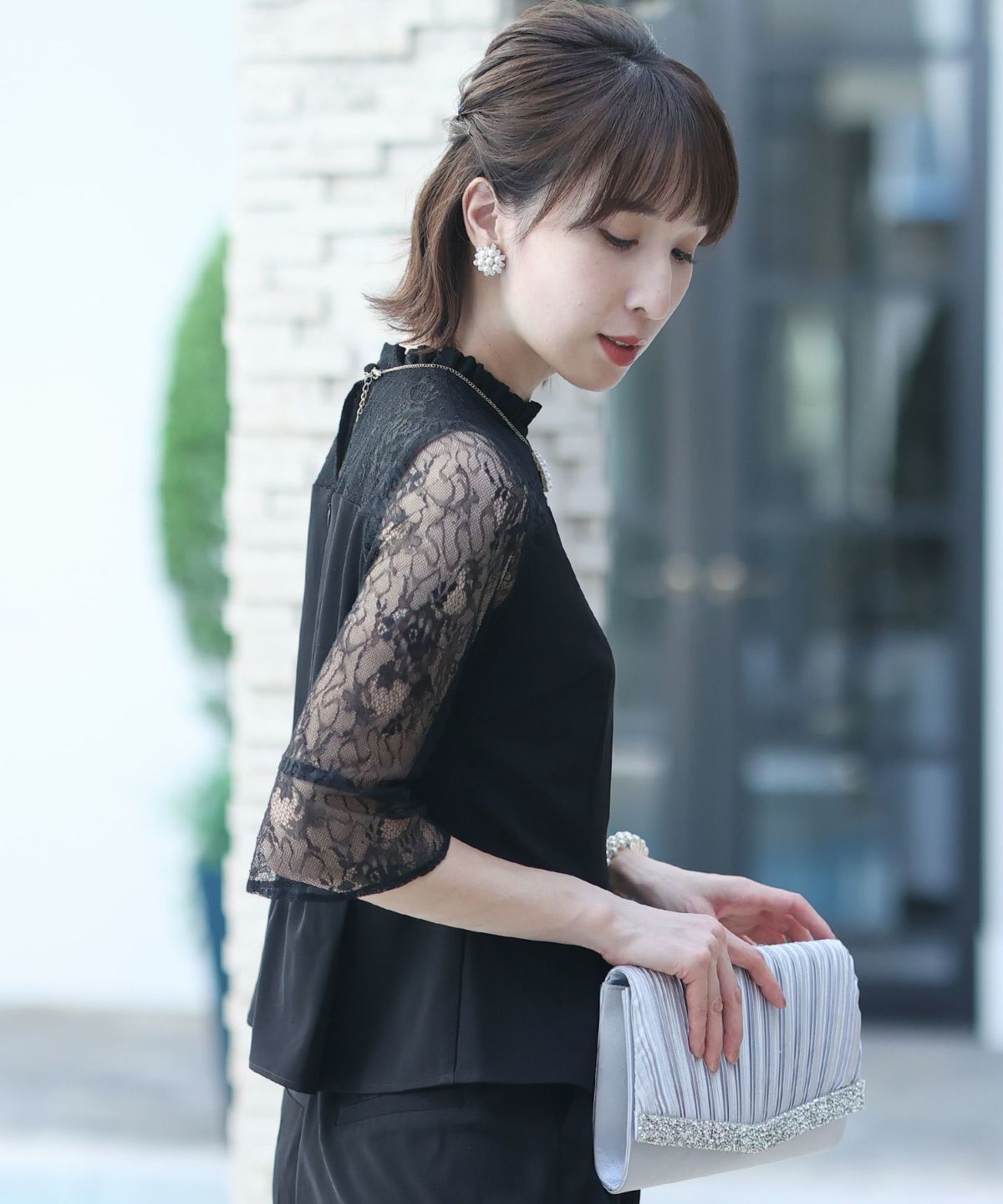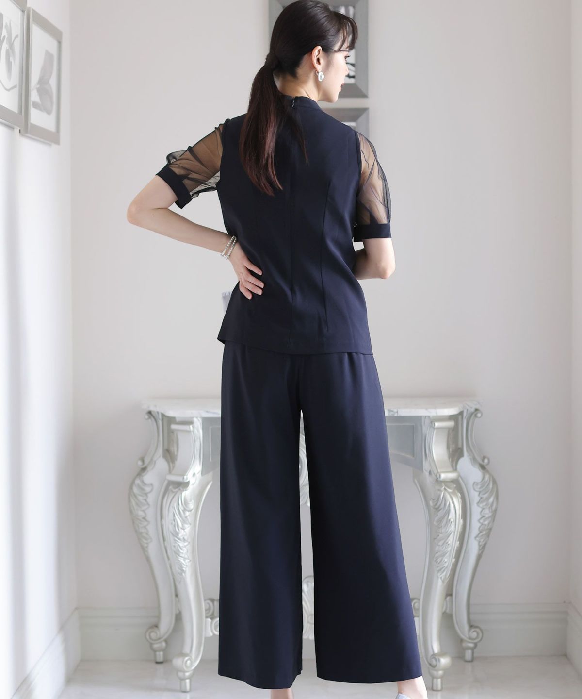 PourVous・atloのパンツドレスは、パーティードレスとしての華やかさと、上品なきちんと感を兼ね備えた一着。
